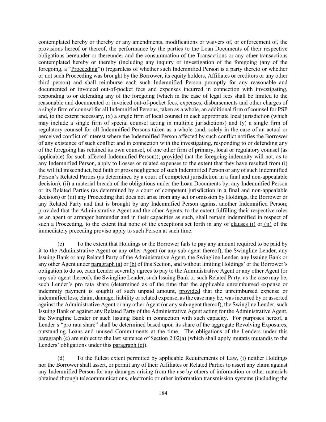 184 contemplated hereby or thereby or any amendments, modifications or waivers of, or enforcement of, the provisions hereof or thereof, the performance by the parties to the Loan Documents of their respective obligations hereunder or thereunder and the consummation of the Transactions or any other transactions contemplated hereby or thereby (including any inquiry or investigation of the foregoing (any of the foregoing, a “Proceeding”)) (regardless of whether such Indemnified Person is a party thereto or whether or not such Proceeding was brought by the Borrower, its equity holders, Affiliates or creditors or any other third person) and shall reimburse each such Indemnified Person promptly for any reasonable and documented or invoiced out-of-pocket fees and expenses incurred in connection with investigating, responding to or defending any of the foregoing (which in the case of legal fees shall be limited to the reasonable and documented or invoiced out-of-pocket fees, expenses, disbursements and other charges of a single firm of counsel for all Indemnified Persons, taken as a whole, an additional firm of counsel for PSP and, to the extent necessary, (x) a single firm of local counsel in each appropriate local jurisdiction (which may include a single firm of special counsel acting in multiple jurisdictions) and (y) a single firm of regulatory counsel for all Indemnified Persons taken as a whole (and, solely in the case of an actual or perceived conflict of interest where the Indemnified Person affected by such conflict notifies the Borrower of any existence of such conflict and in connection with the investigating, responding to or defending any of the foregoing has retained its own counsel, of one other firm of primary, local or regulatory counsel (as applicable) for such affected Indemnified Person)); provided that the foregoing indemnity will not, as to any Indemnified Person, apply to Losses or related expenses to the extent that they have resulted from (i) the willful misconduct, bad faith or gross negligence of such Indemnified Person or any of such Indemnified Person’s Related Parties (as determined by a court of competent jurisdiction in a final and non-appealable decision), (ii) a material breach of the obligations under the Loan Documents by, any Indemnified Person or its Related Parties (as determined by a court of competent jurisdiction in a final and non-appealable decision) or (iii) any Proceeding that does not arise from any act or omission by Holdings, the Borrower or any Related Party and that is brought by any Indemnified Person against another Indemnified Person; provided that the Administrative Agent and the other Agents, to the extent fulfilling their respective roles as an agent or arranger hereunder and in their capacities as such, shall remain indemnified in respect of such a Proceeding, to the extent that none of the exceptions set forth in any of clauses (i) or (ii) of the immediately preceding proviso apply to such Person at such time. (c) To the extent that Holdings or the Borrower fails to pay any amount required to be paid by it to the Administrative Agent or any other Agent (or any sub-agent thereof), the Swingline Lender, any Issuing Bank or any Related Party of the Administrative Agent, the Swingline Lender, any Issuing Bank or any other Agent under paragraph (a) or (b) of this Section, and without limiting Holdings’ or the Borrower’s obligation to do so, each Lender severally agrees to pay to the Administrative Agent or any other Agent (or any sub-agent thereof), the Swingline Lender, such Issuing Bank or such Related Party, as the case may be, such Lender’s pro rata share (determined as of the time that the applicable unreimbursed expense or indemnity payment is sought) of such unpaid amount, provided that the unreimbursed expense or indemnified loss, claim, damage, liability or related expense, as the case may be, was incurred by or asserted against the Administrative Agent or any other Agent (or any sub-agent thereof), the Swingline Lender, such Issuing Bank or against any Related Party of the Administrative Agent acting for the Administrative Agent, the Swingline Lender or such Issuing Bank in connection with such capacity. For purposes hereof, a Lender’s “pro rata share” shall be determined based upon its share of the aggregate Revolving Exposures, outstanding Loans and unused Commitments at the time. The obligations of the Lenders under this paragraph (c) are subject to the last sentence of Section 2.02(a) (which shall apply mutatis mutandis to the Lenders’ obligations under this paragraph (c)). (d) To the fullest extent permitted by applicable Requirements of Law, (i) neither Holdings nor the Borrower shall assert, or permit any of their Affiliates or Related Parties to assert any claim against any Indemnified Person for any damages arising from the use by others of information or other materials obtained through telecommunications, electronic or other information transmission systems (including the