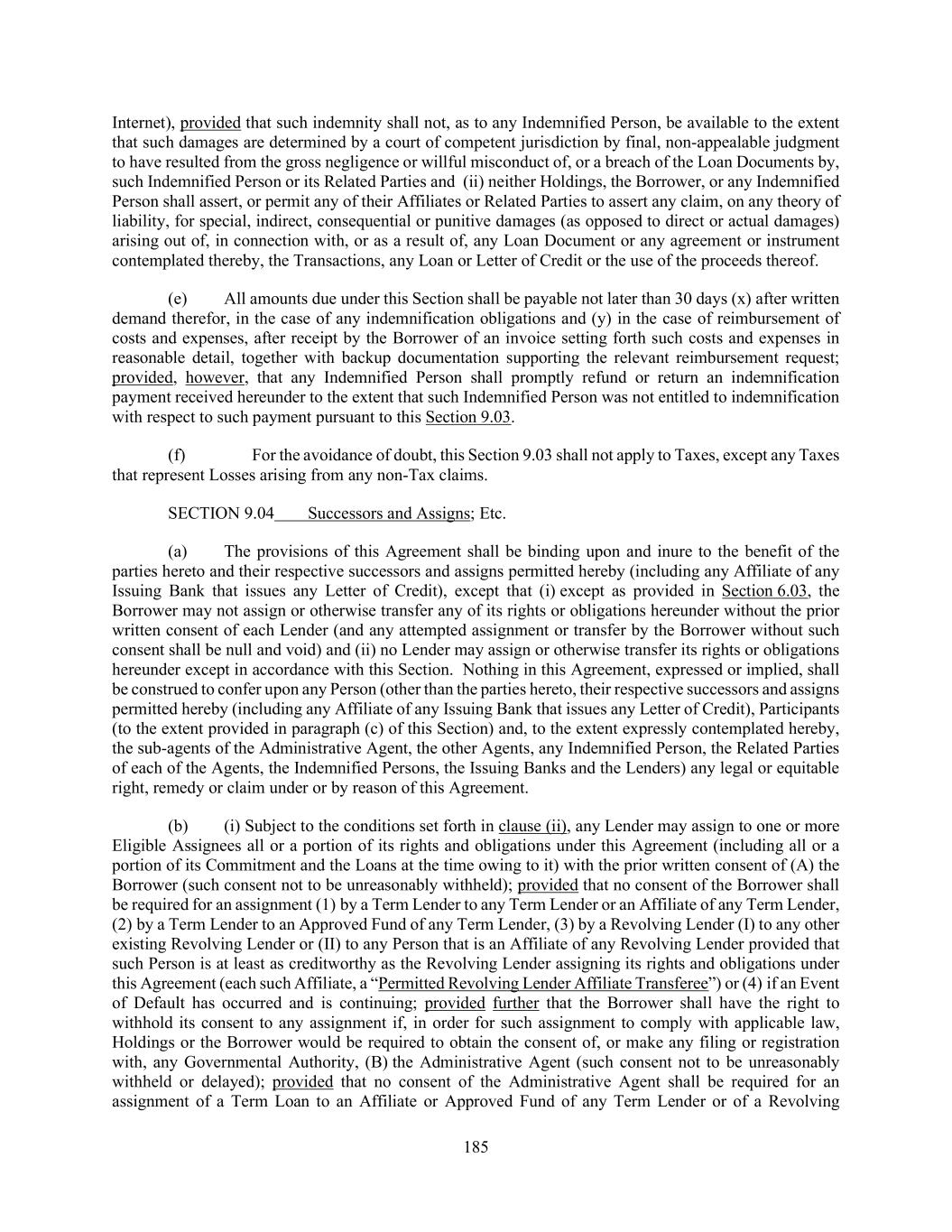 185 Internet), provided that such indemnity shall not, as to any Indemnified Person, be available to the extent that such damages are determined by a court of competent jurisdiction by final, non-appealable judgment to have resulted from the gross negligence or willful misconduct of, or a breach of the Loan Documents by, such Indemnified Person or its Related Parties and (ii) neither Holdings, the Borrower, or any Indemnified Person shall assert, or permit any of their Affiliates or Related Parties to assert any claim, on any theory of liability, for special, indirect, consequential or punitive damages (as opposed to direct or actual damages) arising out of, in connection with, or as a result of, any Loan Document or any agreement or instrument contemplated thereby, the Transactions, any Loan or Letter of Credit or the use of the proceeds thereof. (e) All amounts due under this Section shall be payable not later than 30 days (x) after written demand therefor, in the case of any indemnification obligations and (y) in the case of reimbursement of costs and expenses, after receipt by the Borrower of an invoice setting forth such costs and expenses in reasonable detail, together with backup documentation supporting the relevant reimbursement request; provided, however, that any Indemnified Person shall promptly refund or return an indemnification payment received hereunder to the extent that such Indemnified Person was not entitled to indemnification with respect to such payment pursuant to this Section 9.03. (f) For the avoidance of doubt, this Section 9.03 shall not apply to Taxes, except any Taxes that represent Losses arising from any non-Tax claims. SECTION 9.04 Successors and Assigns; Etc. (a) The provisions of this Agreement shall be binding upon and inure to the benefit of the parties hereto and their respective successors and assigns permitted hereby (including any Affiliate of any Issuing Bank that issues any Letter of Credit), except that (i) except as provided in Section 6.03, the Borrower may not assign or otherwise transfer any of its rights or obligations hereunder without the prior written consent of each Lender (and any attempted assignment or transfer by the Borrower without such consent shall be null and void) and (ii) no Lender may assign or otherwise transfer its rights or obligations hereunder except in accordance with this Section. Nothing in this Agreement, expressed or implied, shall be construed to confer upon any Person (other than the parties hereto, their respective successors and assigns permitted hereby (including any Affiliate of any Issuing Bank that issues any Letter of Credit), Participants (to the extent provided in paragraph (c) of this Section) and, to the extent expressly contemplated hereby, the sub-agents of the Administrative Agent, the other Agents, any Indemnified Person, the Related Parties of each of the Agents, the Indemnified Persons, the Issuing Banks and the Lenders) any legal or equitable right, remedy or claim under or by reason of this Agreement. (b) (i) Subject to the conditions set forth in clause (ii), any Lender may assign to one or more Eligible Assignees all or a portion of its rights and obligations under this Agreement (including all or a portion of its Commitment and the Loans at the time owing to it) with the prior written consent of (A) the Borrower (such consent not to be unreasonably withheld); provided that no consent of the Borrower shall be required for an assignment (1) by a Term Lender to any Term Lender or an Affiliate of any Term Lender, (2) by a Term Lender to an Approved Fund of any Term Lender, (3) by a Revolving Lender (I) to any other existing Revolving Lender or (II) to any Person that is an Affiliate of any Revolving Lender provided that such Person is at least as creditworthy as the Revolving Lender assigning its rights and obligations under this Agreement (each such Affiliate, a “Permitted Revolving Lender Affiliate Transferee”) or (4) if an Event of Default has occurred and is continuing; provided further that the Borrower shall have the right to withhold its consent to any assignment if, in order for such assignment to comply with applicable law, Holdings or the Borrower would be required to obtain the consent of, or make any filing or registration with, any Governmental Authority, (B) the Administrative Agent (such consent not to be unreasonably withheld or delayed); provided that no consent of the Administrative Agent shall be required for an assignment of a Term Loan to an Affiliate or Approved Fund of any Term Lender or of a Revolving
