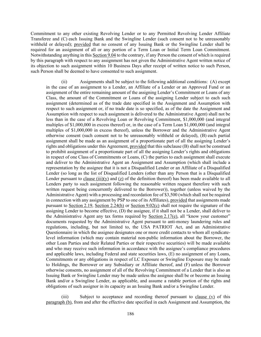 186 Commitment to any other existing Revolving Lender or to any Permitted Revolving Lender Affiliate Transferee and (C) each Issuing Bank and the Swingline Lender (such consent not to be unreasonably withheld or delayed); provided that no consent of any Issuing Bank or the Swingline Lender shall be required for an assignment of all or any portion of a Term Loan or Initial Term Loan Commitment. Notwithstanding anything in this Section 9.04 to the contrary, if any Person the consent of which is required by this paragraph with respect to any assignment has not given the Administrative Agent written notice of its objection to such assignment within 10 Business Days after receipt of written notice to such Person, such Person shall be deemed to have consented to such assignment. (ii) Assignments shall be subject to the following additional conditions: (A) except in the case of an assignment to a Lender, an Affiliate of a Lender or an Approved Fund or an assignment of the entire remaining amount of the assigning Lender’s Commitment or Loans of any Class, the amount of the Commitment or Loans of the assigning Lender subject to each such assignment (determined as of the trade date specified in the Assignment and Assumption with respect to such assignment or, if no trade date is so specified, as of the date the Assignment and Assumption with respect to such assignment is delivered to the Administrative Agent) shall not be less than in the case of a Revolving Loan or Revolving Commitment, $1,000,000 (and integral multiples of $1,000,000 in excess thereof) or, in the case of a Term Loan $1,000,000 (and integral multiples of $1,000,000 in excess thereof), unless the Borrower and the Administrative Agent otherwise consent (such consent not to be unreasonably withheld or delayed), (B) each partial assignment shall be made as an assignment of a proportionate part of all the assigning Lender’s rights and obligations under this Agreement, provided that this subclause (B) shall not be construed to prohibit assignment of a proportionate part of all the assigning Lender’s rights and obligations in respect of one Class of Commitments or Loans, (C) the parties to each assignment shall execute and deliver to the Administrative Agent an Assignment and Assumption (which shall include a representation by the assignee that it is not a Disqualified Lender or an Affiliate of a Disqualified Lender (so long as the list of Disqualified Lenders (other than any Person that is a Disqualified Lender pursuant to clause (iii)(y) and (z) of the definition thereof) has been made available to all Lenders party to such assignment following the reasonable written request therefore with such written request being concurrently delivered to the Borrower)), together (unless waived by the Administrative Agent) with a processing and recordation fee of $3,500 (which shall not be required in connection with any assignment by PSP to one of its Affiliates), provided that assignments made pursuant to Section 2.19, Section 2.24(h) or Section 9.02(c) shall not require the signature of the assigning Lender to become effective, (D) the assignee, if it shall not be a Lender, shall deliver to the Administrative Agent any tax forms required by Section 2.17(e), all “know your customer” documents requested by the Administrative Agent pursuant to anti-money laundering rules and regulations, including, but not limited to, the USA PATRIOT Act, and an Administrative Questionnaire in which the assignee designates one or more credit contacts to whom all syndicate- level information (which may contain material non-public information about the Borrower, the other Loan Parties and their Related Parties or their respective securities) will be made available and who may receive such information in accordance with the assignee’s compliance procedures and applicable laws, including Federal and state securities laws, (E) no assignment of any Loans, Commitments or any obligations in respect of LC Exposure or Swingline Exposure may be made to Holdings, the Borrower or any Subsidiary or Affiliate thereof, and (F) unless the Borrower otherwise consents, no assignment of all of the Revolving Commitment of a Lender that is also an Issuing Bank or Swingline Lender may be made unless the assignee shall be or become an Issuing Bank and/or a Swingline Lender, as applicable, and assume a ratable portion of the rights and obligations of such assignor in its capacity as an Issuing Bank and/or a Swingline Lender. (iii) Subject to acceptance and recording thereof pursuant to clause (v) of this paragraph (b), from and after the effective date specified in each Assignment and Assumption, the