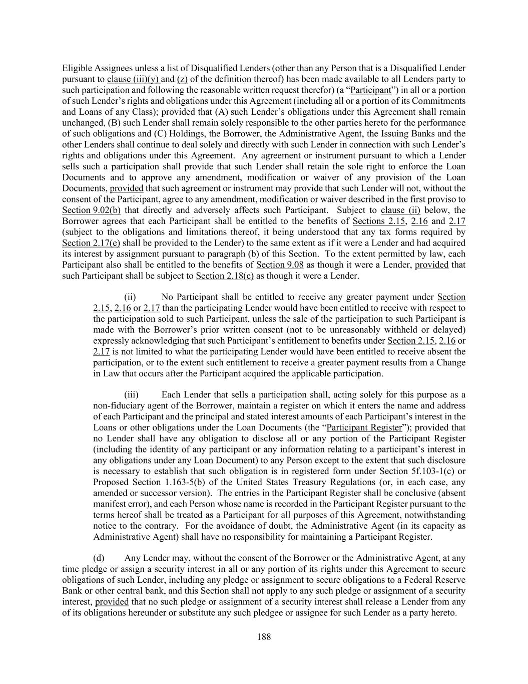 188 Eligible Assignees unless a list of Disqualified Lenders (other than any Person that is a Disqualified Lender pursuant to clause (iii)(y) and (z) of the definition thereof) has been made available to all Lenders party to such participation and following the reasonable written request therefor) (a “Participant”) in all or a portion of such Lender’s rights and obligations under this Agreement (including all or a portion of its Commitments and Loans of any Class); provided that (A) such Lender’s obligations under this Agreement shall remain unchanged, (B) such Lender shall remain solely responsible to the other parties hereto for the performance of such obligations and (C) Holdings, the Borrower, the Administrative Agent, the Issuing Banks and the other Lenders shall continue to deal solely and directly with such Lender in connection with such Lender’s rights and obligations under this Agreement. Any agreement or instrument pursuant to which a Lender sells such a participation shall provide that such Lender shall retain the sole right to enforce the Loan Documents and to approve any amendment, modification or waiver of any provision of the Loan Documents, provided that such agreement or instrument may provide that such Lender will not, without the consent of the Participant, agree to any amendment, modification or waiver described in the first proviso to Section 9.02(b) that directly and adversely affects such Participant. Subject to clause (ii) below, the Borrower agrees that each Participant shall be entitled to the benefits of Sections 2.15, 2.16 and 2.17 (subject to the obligations and limitations thereof, it being understood that any tax forms required by Section 2.17(e) shall be provided to the Lender) to the same extent as if it were a Lender and had acquired its interest by assignment pursuant to paragraph (b) of this Section. To the extent permitted by law, each Participant also shall be entitled to the benefits of Section 9.08 as though it were a Lender, provided that such Participant shall be subject to Section 2.18(c) as though it were a Lender. (ii) No Participant shall be entitled to receive any greater payment under Section 2.15, 2.16 or 2.17 than the participating Lender would have been entitled to receive with respect to the participation sold to such Participant, unless the sale of the participation to such Participant is made with the Borrower’s prior written consent (not to be unreasonably withheld or delayed) expressly acknowledging that such Participant’s entitlement to benefits under Section 2.15, 2.16 or 2.17 is not limited to what the participating Lender would have been entitled to receive absent the participation, or to the extent such entitlement to receive a greater payment results from a Change in Law that occurs after the Participant acquired the applicable participation. (iii) Each Lender that sells a participation shall, acting solely for this purpose as a non-fiduciary agent of the Borrower, maintain a register on which it enters the name and address of each Participant and the principal and stated interest amounts of each Participant’s interest in the Loans or other obligations under the Loan Documents (the “Participant Register”); provided that no Lender shall have any obligation to disclose all or any portion of the Participant Register (including the identity of any participant or any information relating to a participant’s interest in any obligations under any Loan Document) to any Person except to the extent that such disclosure is necessary to establish that such obligation is in registered form under Section 5f.103-1(c) or Proposed Section 1.163-5(b) of the United States Treasury Regulations (or, in each case, any amended or successor version). The entries in the Participant Register shall be conclusive (absent manifest error), and each Person whose name is recorded in the Participant Register pursuant to the terms hereof shall be treated as a Participant for all purposes of this Agreement, notwithstanding notice to the contrary. For the avoidance of doubt, the Administrative Agent (in its capacity as Administrative Agent) shall have no responsibility for maintaining a Participant Register. (d) Any Lender may, without the consent of the Borrower or the Administrative Agent, at any time pledge or assign a security interest in all or any portion of its rights under this Agreement to secure obligations of such Lender, including any pledge or assignment to secure obligations to a Federal Reserve Bank or other central bank, and this Section shall not apply to any such pledge or assignment of a security interest, provided that no such pledge or assignment of a security interest shall release a Lender from any of its obligations hereunder or substitute any such pledgee or assignee for such Lender as a party hereto.