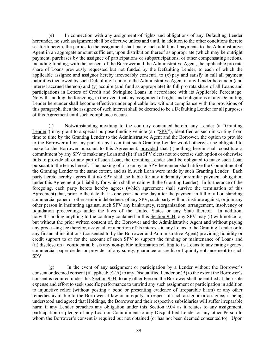 189 (e) In connection with any assignment of rights and obligations of any Defaulting Lender hereunder, no such assignment shall be effective unless and until, in addition to the other conditions thereto set forth herein, the parties to the assignment shall make such additional payments to the Administrative Agent in an aggregate amount sufficient, upon distribution thereof as appropriate (which may be outright payment, purchases by the assignee of participations or subparticipations, or other compensating actions, including funding, with the consent of the Borrower and the Administrative Agent, the applicable pro rata share of Loans previously requested but not funded by the Defaulting Lender, to each of which the applicable assignee and assignor hereby irrevocably consent), to (x) pay and satisfy in full all payment liabilities then owed by such Defaulting Lender to the Administrative Agent or any Lender hereunder (and interest accrued thereon) and (y) acquire (and fund as appropriate) its full pro rata share of all Loans and participations in Letters of Credit and Swingline Loans in accordance with its Applicable Percentage. Notwithstanding the foregoing, in the event that any assignment of rights and obligations of any Defaulting Lender hereunder shall become effective under applicable law without compliance with the provisions of this paragraph, then the assignee of such interest shall be deemed to be a Defaulting Lender for all purposes of this Agreement until such compliance occurs. (f) Notwithstanding anything to the contrary contained herein, any Lender (a “Granting Lender”) may grant to a special purpose funding vehicle (an “SPV”), identified as such in writing from time to time by the Granting Lender to the Administrative Agent and the Borrower, the option to provide to the Borrower all or any part of any Loan that such Granting Lender would otherwise be obligated to make to the Borrower pursuant to this Agreement, provided that (i) nothing herein shall constitute a commitment by any SPV to make any Loan and (ii) if an SPV elects not to exercise such option or otherwise fails to provide all or any part of such Loan, the Granting Lender shall be obligated to make such Loan pursuant to the terms hereof. The making of a Loan by an SPV hereunder shall utilize the Commitment of the Granting Lender to the same extent, and as if, such Loan were made by such Granting Lender. Each party hereto hereby agrees that no SPV shall be liable for any indemnity or similar payment obligation under this Agreement (all liability for which shall remain with the Granting Lender). In furtherance of the foregoing, each party hereto hereby agrees (which agreement shall survive the termination of this Agreement) that, prior to the date that is one year and one day after the payment in full of all outstanding commercial paper or other senior indebtedness of any SPV, such party will not institute against, or join any other person in instituting against, such SPV any bankruptcy, reorganization, arrangement, insolvency or liquidation proceedings under the laws of the United States or any State thereof. In addition, notwithstanding anything to the contrary contained in this Section 9.04, any SPV may (i) with notice to, but without the prior written consent of, the Borrower and the Administrative Agent and without paying any processing fee therefor, assign all or a portion of its interests in any Loans to the Granting Lender or to any financial institutions (consented to by the Borrower and Administrative Agent) providing liquidity or credit support to or for the account of such SPV to support the funding or maintenance of Loans and (ii) disclose on a confidential basis any non-public information relating to its Loans to any rating agency, commercial paper dealer or provider of any surety, guarantee or credit or liquidity enhancement to such SPV. (g) In the event of any assignment or participation by a Lender without the Borrower’s consent or deemed consent (if applicable) (A) to any Disqualified Lender or (B) to the extent the Borrower’s consent is required under this Section 9.04, to any other Person, the Borrower shall be entitled at their sole expense and effort to seek specific performance to unwind any such assignment or participation in addition to injunctive relief (without posting a bond or presenting evidence of irreparable harm) or any other remedies available to the Borrower at law or in equity in respect of such assignor or assignee; it being understood and agreed that Holdings, the Borrower and their respective subsidiaries will suffer irreparable harm if any Lender breaches any obligation under this Section 9.04 as it relates to any assignment, participation or pledge of any Loan or Commitment to any Disqualified Lender or any other Person to whom the Borrower’s consent is required but not obtained (or has not been deemed consented to). Upon