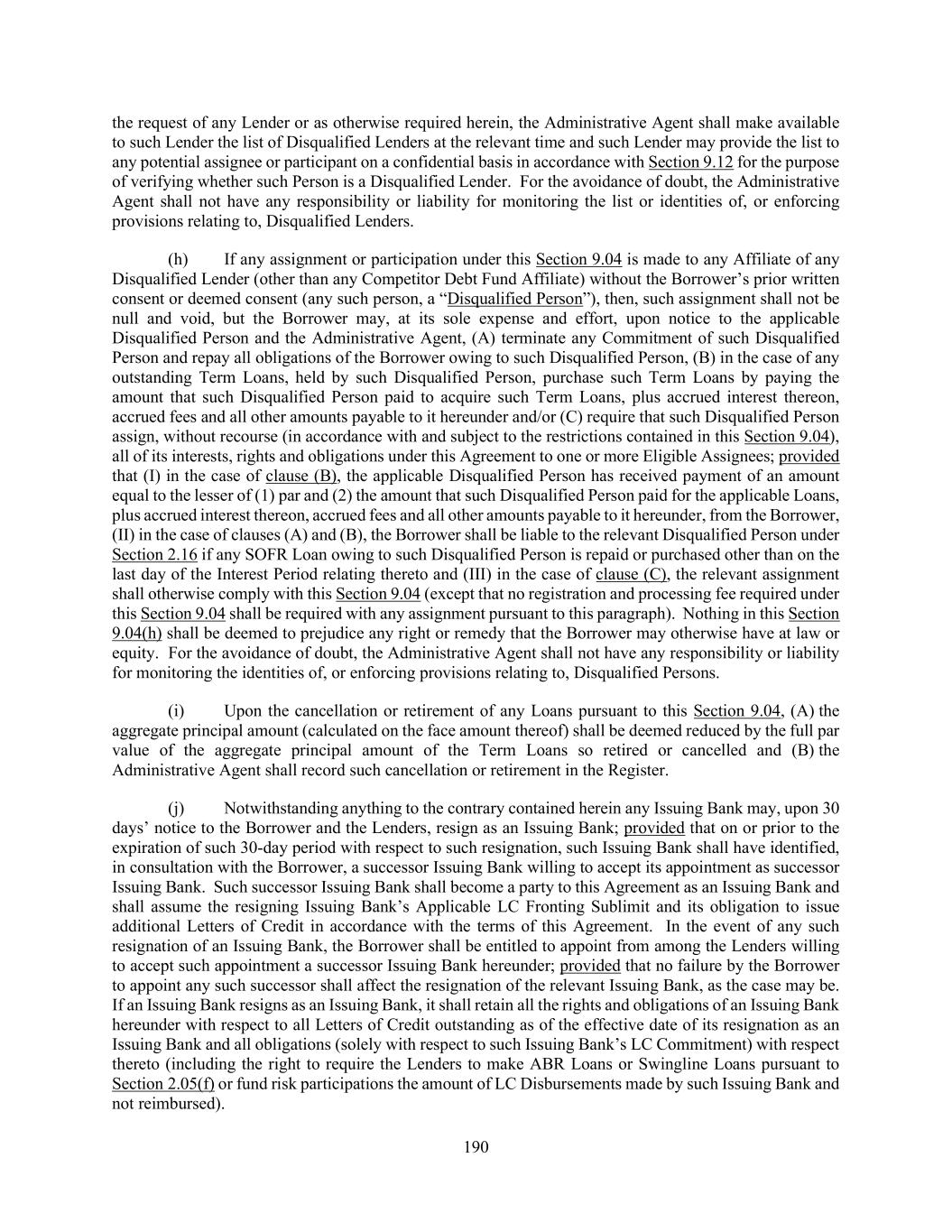 190 the request of any Lender or as otherwise required herein, the Administrative Agent shall make available to such Lender the list of Disqualified Lenders at the relevant time and such Lender may provide the list to any potential assignee or participant on a confidential basis in accordance with Section 9.12 for the purpose of verifying whether such Person is a Disqualified Lender. For the avoidance of doubt, the Administrative Agent shall not have any responsibility or liability for monitoring the list or identities of, or enforcing provisions relating to, Disqualified Lenders. (h) If any assignment or participation under this Section 9.04 is made to any Affiliate of any Disqualified Lender (other than any Competitor Debt Fund Affiliate) without the Borrower’s prior written consent or deemed consent (any such person, a “Disqualified Person”), then, such assignment shall not be null and void, but the Borrower may, at its sole expense and effort, upon notice to the applicable Disqualified Person and the Administrative Agent, (A) terminate any Commitment of such Disqualified Person and repay all obligations of the Borrower owing to such Disqualified Person, (B) in the case of any outstanding Term Loans, held by such Disqualified Person, purchase such Term Loans by paying the amount that such Disqualified Person paid to acquire such Term Loans, plus accrued interest thereon, accrued fees and all other amounts payable to it hereunder and/or (C) require that such Disqualified Person assign, without recourse (in accordance with and subject to the restrictions contained in this Section 9.04), all of its interests, rights and obligations under this Agreement to one or more Eligible Assignees; provided that (I) in the case of clause (B), the applicable Disqualified Person has received payment of an amount equal to the lesser of (1) par and (2) the amount that such Disqualified Person paid for the applicable Loans, plus accrued interest thereon, accrued fees and all other amounts payable to it hereunder, from the Borrower, (II) in the case of clauses (A) and (B), the Borrower shall be liable to the relevant Disqualified Person under Section 2.16 if any SOFR Loan owing to such Disqualified Person is repaid or purchased other than on the last day of the Interest Period relating thereto and (III) in the case of clause (C), the relevant assignment shall otherwise comply with this Section 9.04 (except that no registration and processing fee required under this Section 9.04 shall be required with any assignment pursuant to this paragraph). Nothing in this Section 9.04(h) shall be deemed to prejudice any right or remedy that the Borrower may otherwise have at law or equity. For the avoidance of doubt, the Administrative Agent shall not have any responsibility or liability for monitoring the identities of, or enforcing provisions relating to, Disqualified Persons. (i) Upon the cancellation or retirement of any Loans pursuant to this Section 9.04, (A) the aggregate principal amount (calculated on the face amount thereof) shall be deemed reduced by the full par value of the aggregate principal amount of the Term Loans so retired or cancelled and (B) the Administrative Agent shall record such cancellation or retirement in the Register. (j) Notwithstanding anything to the contrary contained herein any Issuing Bank may, upon 30 days’ notice to the Borrower and the Lenders, resign as an Issuing Bank; provided that on or prior to the expiration of such 30-day period with respect to such resignation, such Issuing Bank shall have identified, in consultation with the Borrower, a successor Issuing Bank willing to accept its appointment as successor Issuing Bank. Such successor Issuing Bank shall become a party to this Agreement as an Issuing Bank and shall assume the resigning Issuing Bank’s Applicable LC Fronting Sublimit and its obligation to issue additional Letters of Credit in accordance with the terms of this Agreement. In the event of any such resignation of an Issuing Bank, the Borrower shall be entitled to appoint from among the Lenders willing to accept such appointment a successor Issuing Bank hereunder; provided that no failure by the Borrower to appoint any such successor shall affect the resignation of the relevant Issuing Bank, as the case may be. If an Issuing Bank resigns as an Issuing Bank, it shall retain all the rights and obligations of an Issuing Bank hereunder with respect to all Letters of Credit outstanding as of the effective date of its resignation as an Issuing Bank and all obligations (solely with respect to such Issuing Bank’s LC Commitment) with respect thereto (including the right to require the Lenders to make ABR Loans or Swingline Loans pursuant to Section 2.05(f) or fund risk participations the amount of LC Disbursements made by such Issuing Bank and not reimbursed).