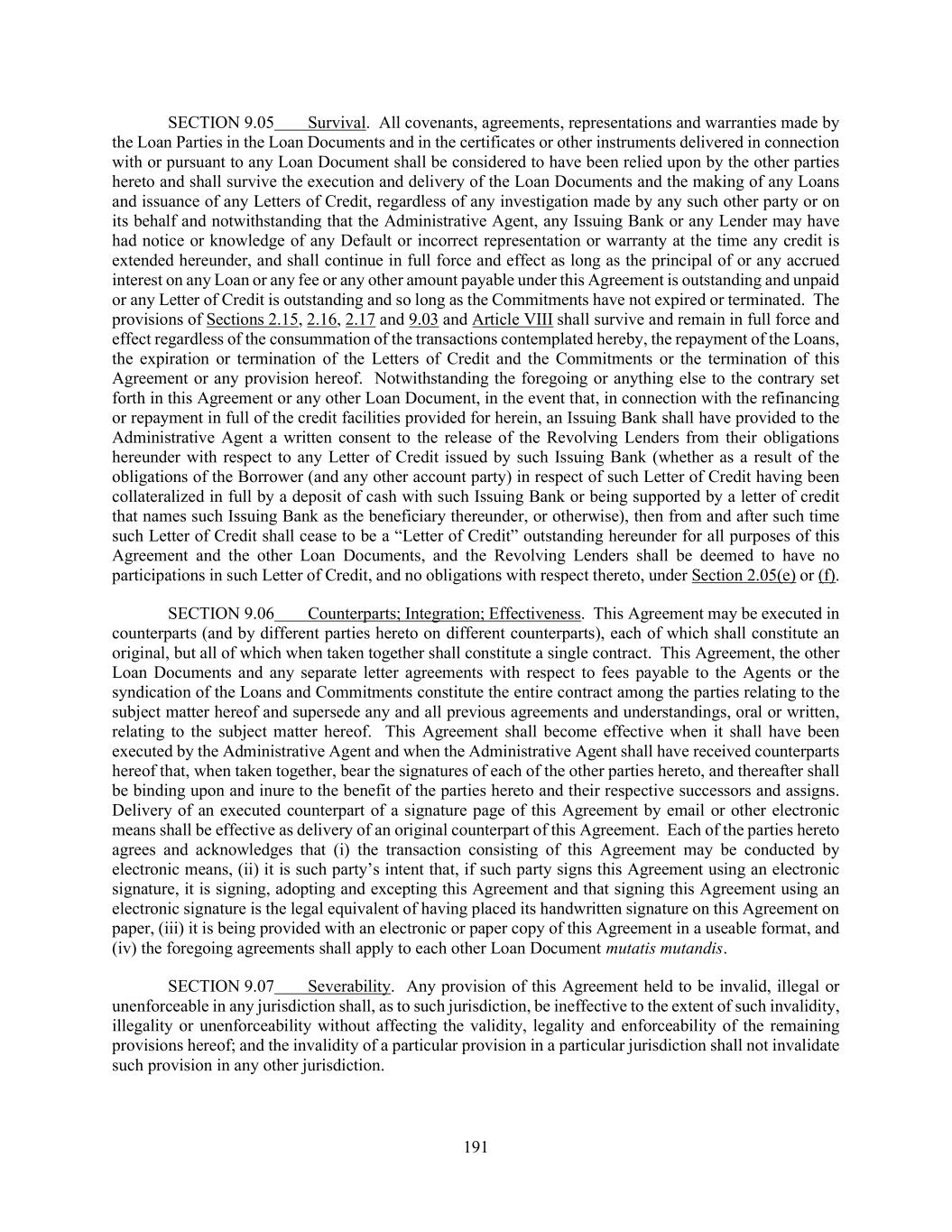 191 SECTION 9.05 Survival. All covenants, agreements, representations and warranties made by the Loan Parties in the Loan Documents and in the certificates or other instruments delivered in connection with or pursuant to any Loan Document shall be considered to have been relied upon by the other parties hereto and shall survive the execution and delivery of the Loan Documents and the making of any Loans and issuance of any Letters of Credit, regardless of any investigation made by any such other party or on its behalf and notwithstanding that the Administrative Agent, any Issuing Bank or any Lender may have had notice or knowledge of any Default or incorrect representation or warranty at the time any credit is extended hereunder, and shall continue in full force and effect as long as the principal of or any accrued interest on any Loan or any fee or any other amount payable under this Agreement is outstanding and unpaid or any Letter of Credit is outstanding and so long as the Commitments have not expired or terminated. The provisions of Sections 2.15, 2.16, 2.17 and 9.03 and Article VIII shall survive and remain in full force and effect regardless of the consummation of the transactions contemplated hereby, the repayment of the Loans, the expiration or termination of the Letters of Credit and the Commitments or the termination of this Agreement or any provision hereof. Notwithstanding the foregoing or anything else to the contrary set forth in this Agreement or any other Loan Document, in the event that, in connection with the refinancing or repayment in full of the credit facilities provided for herein, an Issuing Bank shall have provided to the Administrative Agent a written consent to the release of the Revolving Lenders from their obligations hereunder with respect to any Letter of Credit issued by such Issuing Bank (whether as a result of the obligations of the Borrower (and any other account party) in respect of such Letter of Credit having been collateralized in full by a deposit of cash with such Issuing Bank or being supported by a letter of credit that names such Issuing Bank as the beneficiary thereunder, or otherwise), then from and after such time such Letter of Credit shall cease to be a “Letter of Credit” outstanding hereunder for all purposes of this Agreement and the other Loan Documents, and the Revolving Lenders shall be deemed to have no participations in such Letter of Credit, and no obligations with respect thereto, under Section 2.05(e) or (f). SECTION 9.06 Counterparts; Integration; Effectiveness. This Agreement may be executed in counterparts (and by different parties hereto on different counterparts), each of which shall constitute an original, but all of which when taken together shall constitute a single contract. This Agreement, the other Loan Documents and any separate letter agreements with respect to fees payable to the Agents or the syndication of the Loans and Commitments constitute the entire contract among the parties relating to the subject matter hereof and supersede any and all previous agreements and understandings, oral or written, relating to the subject matter hereof. This Agreement shall become effective when it shall have been executed by the Administrative Agent and when the Administrative Agent shall have received counterparts hereof that, when taken together, bear the signatures of each of the other parties hereto, and thereafter shall be binding upon and inure to the benefit of the parties hereto and their respective successors and assigns. Delivery of an executed counterpart of a signature page of this Agreement by email or other electronic means shall be effective as delivery of an original counterpart of this Agreement. Each of the parties hereto agrees and acknowledges that (i) the transaction consisting of this Agreement may be conducted by electronic means, (ii) it is such party’s intent that, if such party signs this Agreement using an electronic signature, it is signing, adopting and excepting this Agreement and that signing this Agreement using an electronic signature is the legal equivalent of having placed its handwritten signature on this Agreement on paper, (iii) it is being provided with an electronic or paper copy of this Agreement in a useable format, and (iv) the foregoing agreements shall apply to each other Loan Document mutatis mutandis. SECTION 9.07 Severability. Any provision of this Agreement held to be invalid, illegal or unenforceable in any jurisdiction shall, as to such jurisdiction, be ineffective to the extent of such invalidity, illegality or unenforceability without affecting the validity, legality and enforceability of the remaining provisions hereof; and the invalidity of a particular provision in a particular jurisdiction shall not invalidate such provision in any other jurisdiction.