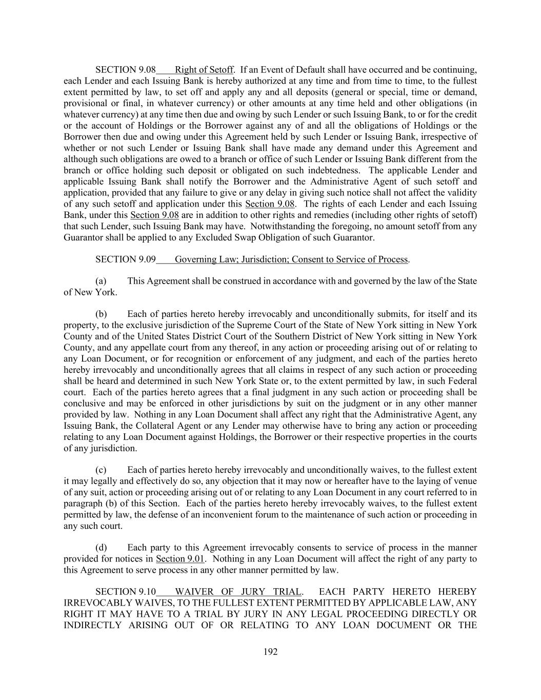 192 SECTION 9.08 Right of Setoff. If an Event of Default shall have occurred and be continuing, each Lender and each Issuing Bank is hereby authorized at any time and from time to time, to the fullest extent permitted by law, to set off and apply any and all deposits (general or special, time or demand, provisional or final, in whatever currency) or other amounts at any time held and other obligations (in whatever currency) at any time then due and owing by such Lender or such Issuing Bank, to or for the credit or the account of Holdings or the Borrower against any of and all the obligations of Holdings or the Borrower then due and owing under this Agreement held by such Lender or Issuing Bank, irrespective of whether or not such Lender or Issuing Bank shall have made any demand under this Agreement and although such obligations are owed to a branch or office of such Lender or Issuing Bank different from the branch or office holding such deposit or obligated on such indebtedness. The applicable Lender and applicable Issuing Bank shall notify the Borrower and the Administrative Agent of such setoff and application, provided that any failure to give or any delay in giving such notice shall not affect the validity of any such setoff and application under this Section 9.08. The rights of each Lender and each Issuing Bank, under this Section 9.08 are in addition to other rights and remedies (including other rights of setoff) that such Lender, such Issuing Bank may have. Notwithstanding the foregoing, no amount setoff from any Guarantor shall be applied to any Excluded Swap Obligation of such Guarantor. SECTION 9.09 Governing Law; Jurisdiction; Consent to Service of Process. (a) This Agreement shall be construed in accordance with and governed by the law of the State of New York. (b) Each of parties hereto hereby irrevocably and unconditionally submits, for itself and its property, to the exclusive jurisdiction of the Supreme Court of the State of New York sitting in New York County and of the United States District Court of the Southern District of New York sitting in New York County, and any appellate court from any thereof, in any action or proceeding arising out of or relating to any Loan Document, or for recognition or enforcement of any judgment, and each of the parties hereto hereby irrevocably and unconditionally agrees that all claims in respect of any such action or proceeding shall be heard and determined in such New York State or, to the extent permitted by law, in such Federal court. Each of the parties hereto agrees that a final judgment in any such action or proceeding shall be conclusive and may be enforced in other jurisdictions by suit on the judgment or in any other manner provided by law. Nothing in any Loan Document shall affect any right that the Administrative Agent, any Issuing Bank, the Collateral Agent or any Lender may otherwise have to bring any action or proceeding relating to any Loan Document against Holdings, the Borrower or their respective properties in the courts of any jurisdiction. (c) Each of parties hereto hereby irrevocably and unconditionally waives, to the fullest extent it may legally and effectively do so, any objection that it may now or hereafter have to the laying of venue of any suit, action or proceeding arising out of or relating to any Loan Document in any court referred to in paragraph (b) of this Section. Each of the parties hereto hereby irrevocably waives, to the fullest extent permitted by law, the defense of an inconvenient forum to the maintenance of such action or proceeding in any such court. (d) Each party to this Agreement irrevocably consents to service of process in the manner provided for notices in Section 9.01. Nothing in any Loan Document will affect the right of any party to this Agreement to serve process in any other manner permitted by law. SECTION 9.10 WAIVER OF JURY TRIAL. EACH PARTY HERETO HEREBY IRREVOCABLY WAIVES, TO THE FULLEST EXTENT PERMITTED BY APPLICABLE LAW, ANY RIGHT IT MAY HAVE TO A TRIAL BY JURY IN ANY LEGAL PROCEEDING DIRECTLY OR INDIRECTLY ARISING OUT OF OR RELATING TO ANY LOAN DOCUMENT OR THE