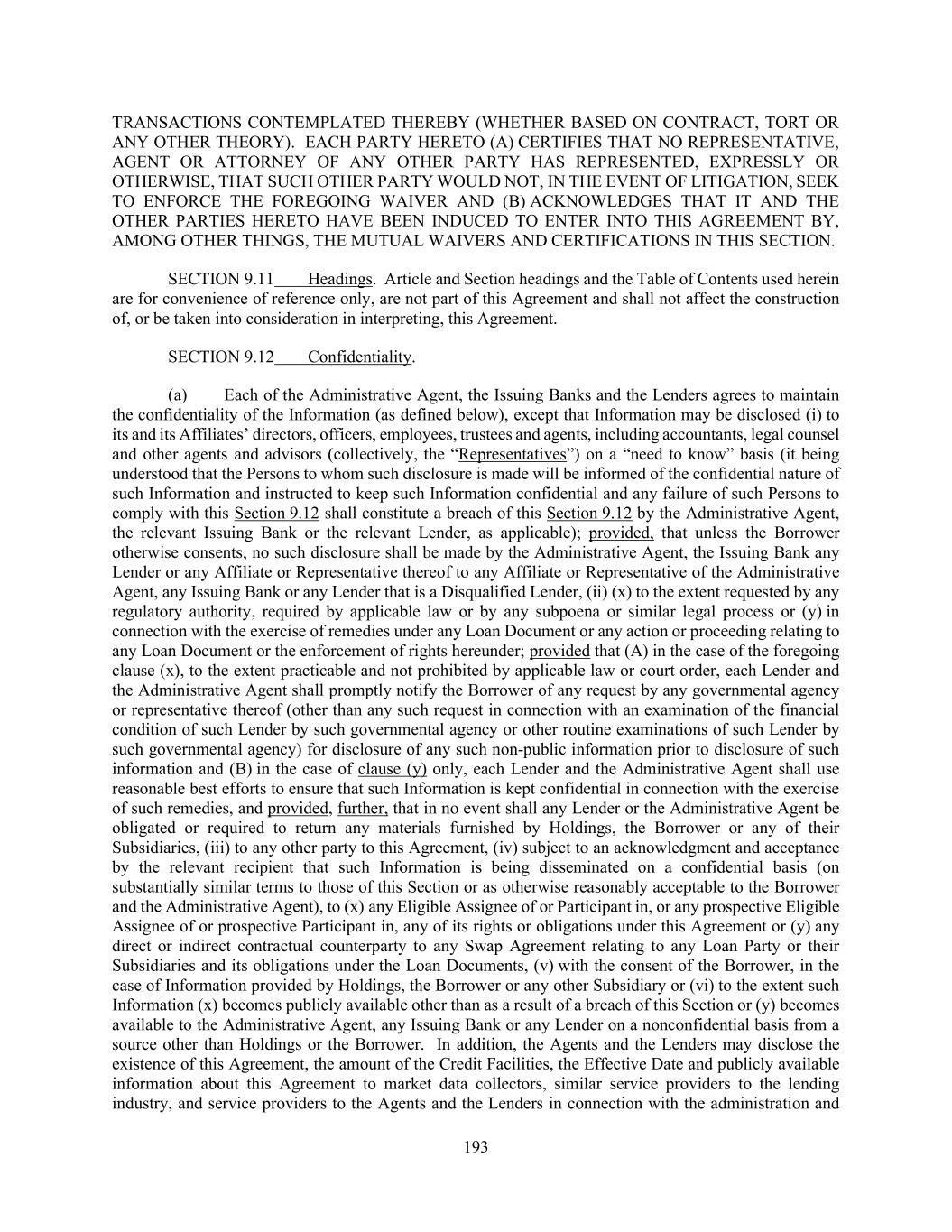 193 TRANSACTIONS CONTEMPLATED THEREBY (WHETHER BASED ON CONTRACT, TORT OR ANY OTHER THEORY). EACH PARTY HERETO (A) CERTIFIES THAT NO REPRESENTATIVE, AGENT OR ATTORNEY OF ANY OTHER PARTY HAS REPRESENTED, EXPRESSLY OR OTHERWISE, THAT SUCH OTHER PARTY WOULD NOT, IN THE EVENT OF LITIGATION, SEEK TO ENFORCE THE FOREGOING WAIVER AND (B) ACKNOWLEDGES THAT IT AND THE OTHER PARTIES HERETO HAVE BEEN INDUCED TO ENTER INTO THIS AGREEMENT BY, AMONG OTHER THINGS, THE MUTUAL WAIVERS AND CERTIFICATIONS IN THIS SECTION. SECTION 9.11 Headings. Article and Section headings and the Table of Contents used herein are for convenience of reference only, are not part of this Agreement and shall not affect the construction of, or be taken into consideration in interpreting, this Agreement. SECTION 9.12 Confidentiality. (a) Each of the Administrative Agent, the Issuing Banks and the Lenders agrees to maintain the confidentiality of the Information (as defined below), except that Information may be disclosed (i) to its and its Affiliates’ directors, officers, employees, trustees and agents, including accountants, legal counsel and other agents and advisors (collectively, the “Representatives”) on a “need to know” basis (it being understood that the Persons to whom such disclosure is made will be informed of the confidential nature of such Information and instructed to keep such Information confidential and any failure of such Persons to comply with this Section 9.12 shall constitute a breach of this Section 9.12 by the Administrative Agent, the relevant Issuing Bank or the relevant Lender, as applicable); provided, that unless the Borrower otherwise consents, no such disclosure shall be made by the Administrative Agent, the Issuing Bank any Lender or any Affiliate or Representative thereof to any Affiliate or Representative of the Administrative Agent, any Issuing Bank or any Lender that is a Disqualified Lender, (ii) (x) to the extent requested by any regulatory authority, required by applicable law or by any subpoena or similar legal process or (y) in connection with the exercise of remedies under any Loan Document or any action or proceeding relating to any Loan Document or the enforcement of rights hereunder; provided that (A) in the case of the foregoing clause (x), to the extent practicable and not prohibited by applicable law or court order, each Lender and the Administrative Agent shall promptly notify the Borrower of any request by any governmental agency or representative thereof (other than any such request in connection with an examination of the financial condition of such Lender by such governmental agency or other routine examinations of such Lender by such governmental agency) for disclosure of any such non-public information prior to disclosure of such information and (B) in the case of clause (y) only, each Lender and the Administrative Agent shall use reasonable best efforts to ensure that such Information is kept confidential in connection with the exercise of such remedies, and provided, further, that in no event shall any Lender or the Administrative Agent be obligated or required to return any materials furnished by Holdings, the Borrower or any of their Subsidiaries, (iii) to any other party to this Agreement, (iv) subject to an acknowledgment and acceptance by the relevant recipient that such Information is being disseminated on a confidential basis (on substantially similar terms to those of this Section or as otherwise reasonably acceptable to the Borrower and the Administrative Agent), to (x) any Eligible Assignee of or Participant in, or any prospective Eligible Assignee of or prospective Participant in, any of its rights or obligations under this Agreement or (y) any direct or indirect contractual counterparty to any Swap Agreement relating to any Loan Party or their Subsidiaries and its obligations under the Loan Documents, (v) with the consent of the Borrower, in the case of Information provided by Holdings, the Borrower or any other Subsidiary or (vi) to the extent such Information (x) becomes publicly available other than as a result of a breach of this Section or (y) becomes available to the Administrative Agent, any Issuing Bank or any Lender on a nonconfidential basis from a source other than Holdings or the Borrower. In addition, the Agents and the Lenders may disclose the existence of this Agreement, the amount of the Credit Facilities, the Effective Date and publicly available information about this Agreement to market data collectors, similar service providers to the lending industry, and service providers to the Agents and the Lenders in connection with the administration and