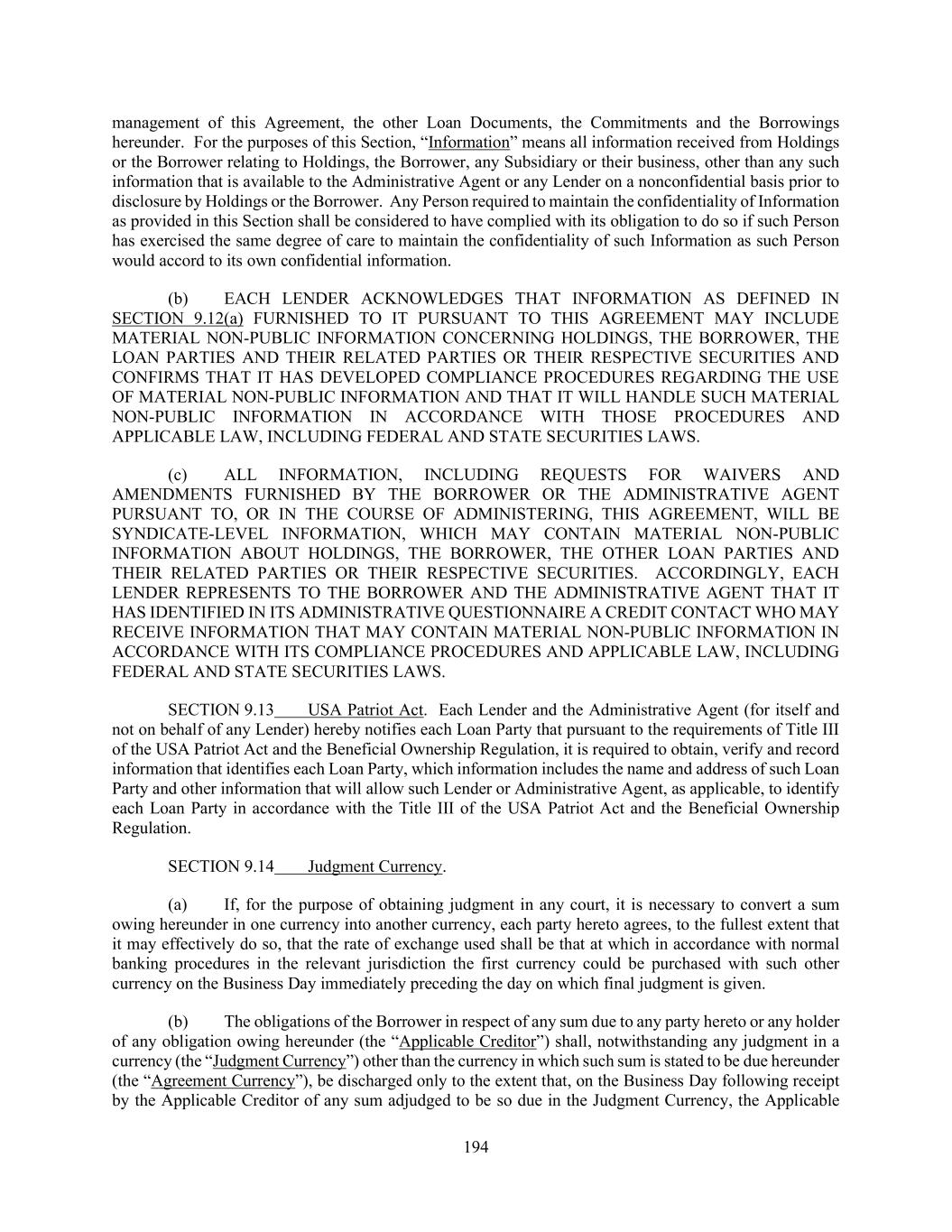 194 management of this Agreement, the other Loan Documents, the Commitments and the Borrowings hereunder. For the purposes of this Section, “Information” means all information received from Holdings or the Borrower relating to Holdings, the Borrower, any Subsidiary or their business, other than any such information that is available to the Administrative Agent or any Lender on a nonconfidential basis prior to disclosure by Holdings or the Borrower. Any Person required to maintain the confidentiality of Information as provided in this Section shall be considered to have complied with its obligation to do so if such Person has exercised the same degree of care to maintain the confidentiality of such Information as such Person would accord to its own confidential information. (b) EACH LENDER ACKNOWLEDGES THAT INFORMATION AS DEFINED IN SECTION 9.12(a) FURNISHED TO IT PURSUANT TO THIS AGREEMENT MAY INCLUDE MATERIAL NON-PUBLIC INFORMATION CONCERNING HOLDINGS, THE BORROWER, THE LOAN PARTIES AND THEIR RELATED PARTIES OR THEIR RESPECTIVE SECURITIES AND CONFIRMS THAT IT HAS DEVELOPED COMPLIANCE PROCEDURES REGARDING THE USE OF MATERIAL NON-PUBLIC INFORMATION AND THAT IT WILL HANDLE SUCH MATERIAL NON-PUBLIC INFORMATION IN ACCORDANCE WITH THOSE PROCEDURES AND APPLICABLE LAW, INCLUDING FEDERAL AND STATE SECURITIES LAWS. (c) ALL INFORMATION, INCLUDING REQUESTS FOR WAIVERS AND AMENDMENTS FURNISHED BY THE BORROWER OR THE ADMINISTRATIVE AGENT PURSUANT TO, OR IN THE COURSE OF ADMINISTERING, THIS AGREEMENT, WILL BE SYNDICATE-LEVEL INFORMATION, WHICH MAY CONTAIN MATERIAL NON-PUBLIC INFORMATION ABOUT HOLDINGS, THE BORROWER, THE OTHER LOAN PARTIES AND THEIR RELATED PARTIES OR THEIR RESPECTIVE SECURITIES. ACCORDINGLY, EACH LENDER REPRESENTS TO THE BORROWER AND THE ADMINISTRATIVE AGENT THAT IT HAS IDENTIFIED IN ITS ADMINISTRATIVE QUESTIONNAIRE A CREDIT CONTACT WHO MAY RECEIVE INFORMATION THAT MAY CONTAIN MATERIAL NON-PUBLIC INFORMATION IN ACCORDANCE WITH ITS COMPLIANCE PROCEDURES AND APPLICABLE LAW, INCLUDING FEDERAL AND STATE SECURITIES LAWS. SECTION 9.13 USA Patriot Act. Each Lender and the Administrative Agent (for itself and not on behalf of any Lender) hereby notifies each Loan Party that pursuant to the requirements of Title III of the USA Patriot Act and the Beneficial Ownership Regulation, it is required to obtain, verify and record information that identifies each Loan Party, which information includes the name and address of such Loan Party and other information that will allow such Lender or Administrative Agent, as applicable, to identify each Loan Party in accordance with the Title III of the USA Patriot Act and the Beneficial Ownership Regulation. SECTION 9.14 Judgment Currency. (a) If, for the purpose of obtaining judgment in any court, it is necessary to convert a sum owing hereunder in one currency into another currency, each party hereto agrees, to the fullest extent that it may effectively do so, that the rate of exchange used shall be that at which in accordance with normal banking procedures in the relevant jurisdiction the first currency could be purchased with such other currency on the Business Day immediately preceding the day on which final judgment is given. (b) The obligations of the Borrower in respect of any sum due to any party hereto or any holder of any obligation owing hereunder (the “Applicable Creditor”) shall, notwithstanding any judgment in a currency (the “Judgment Currency”) other than the currency in which such sum is stated to be due hereunder (the “Agreement Currency”), be discharged only to the extent that, on the Business Day following receipt by the Applicable Creditor of any sum adjudged to be so due in the Judgment Currency, the Applicable