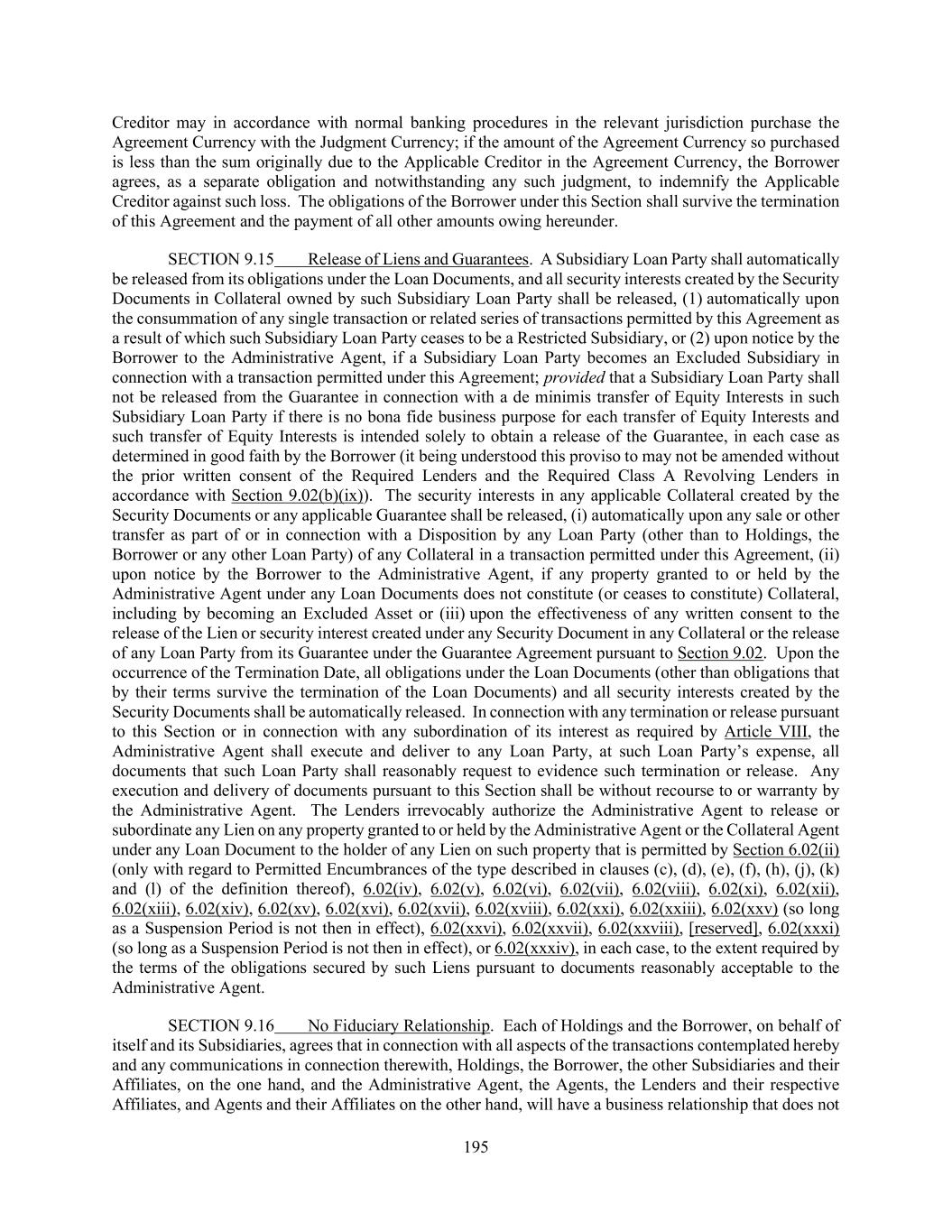 195 Creditor may in accordance with normal banking procedures in the relevant jurisdiction purchase the Agreement Currency with the Judgment Currency; if the amount of the Agreement Currency so purchased is less than the sum originally due to the Applicable Creditor in the Agreement Currency, the Borrower agrees, as a separate obligation and notwithstanding any such judgment, to indemnify the Applicable Creditor against such loss. The obligations of the Borrower under this Section shall survive the termination of this Agreement and the payment of all other amounts owing hereunder. SECTION 9.15 Release of Liens and Guarantees. A Subsidiary Loan Party shall automatically be released from its obligations under the Loan Documents, and all security interests created by the Security Documents in Collateral owned by such Subsidiary Loan Party shall be released, (1) automatically upon the consummation of any single transaction or related series of transactions permitted by this Agreement as a result of which such Subsidiary Loan Party ceases to be a Restricted Subsidiary, or (2) upon notice by the Borrower to the Administrative Agent, if a Subsidiary Loan Party becomes an Excluded Subsidiary in connection with a transaction permitted under this Agreement; provided that a Subsidiary Loan Party shall not be released from the Guarantee in connection with a de minimis transfer of Equity Interests in such Subsidiary Loan Party if there is no bona fide business purpose for each transfer of Equity Interests and such transfer of Equity Interests is intended solely to obtain a release of the Guarantee, in each case as determined in good faith by the Borrower (it being understood this proviso to may not be amended without the prior written consent of the Required Lenders and the Required Class A Revolving Lenders in accordance with Section 9.02(b)(ix)). The security interests in any applicable Collateral created by the Security Documents or any applicable Guarantee shall be released, (i) automatically upon any sale or other transfer as part of or in connection with a Disposition by any Loan Party (other than to Holdings, the Borrower or any other Loan Party) of any Collateral in a transaction permitted under this Agreement, (ii) upon notice by the Borrower to the Administrative Agent, if any property granted to or held by the Administrative Agent under any Loan Documents does not constitute (or ceases to constitute) Collateral, including by becoming an Excluded Asset or (iii) upon the effectiveness of any written consent to the release of the Lien or security interest created under any Security Document in any Collateral or the release of any Loan Party from its Guarantee under the Guarantee Agreement pursuant to Section 9.02. Upon the occurrence of the Termination Date, all obligations under the Loan Documents (other than obligations that by their terms survive the termination of the Loan Documents) and all security interests created by the Security Documents shall be automatically released. In connection with any termination or release pursuant to this Section or in connection with any subordination of its interest as required by Article VIII, the Administrative Agent shall execute and deliver to any Loan Party, at such Loan Party’s expense, all documents that such Loan Party shall reasonably request to evidence such termination or release. Any execution and delivery of documents pursuant to this Section shall be without recourse to or warranty by the Administrative Agent. The Lenders irrevocably authorize the Administrative Agent to release or subordinate any Lien on any property granted to or held by the Administrative Agent or the Collateral Agent under any Loan Document to the holder of any Lien on such property that is permitted by Section 6.02(ii) (only with regard to Permitted Encumbrances of the type described in clauses (c), (d), (e), (f), (h), (j), (k) and (l) of the definition thereof), 6.02(iv), 6.02(v), 6.02(vi), 6.02(vii), 6.02(viii), 6.02(xi), 6.02(xii), 6.02(xiii), 6.02(xiv), 6.02(xv), 6.02(xvi), 6.02(xvii), 6.02(xviii), 6.02(xxi), 6.02(xxiii), 6.02(xxv) (so long as a Suspension Period is not then in effect), 6.02(xxvi), 6.02(xxvii), 6.02(xxviii), [reserved], 6.02(xxxi) (so long as a Suspension Period is not then in effect), or 6.02(xxxiv), in each case, to the extent required by the terms of the obligations secured by such Liens pursuant to documents reasonably acceptable to the Administrative Agent. SECTION 9.16 No Fiduciary Relationship. Each of Holdings and the Borrower, on behalf of itself and its Subsidiaries, agrees that in connection with all aspects of the transactions contemplated hereby and any communications in connection therewith, Holdings, the Borrower, the other Subsidiaries and their Affiliates, on the one hand, and the Administrative Agent, the Agents, the Lenders and their respective Affiliates, and Agents and their Affiliates on the other hand, will have a business relationship that does not