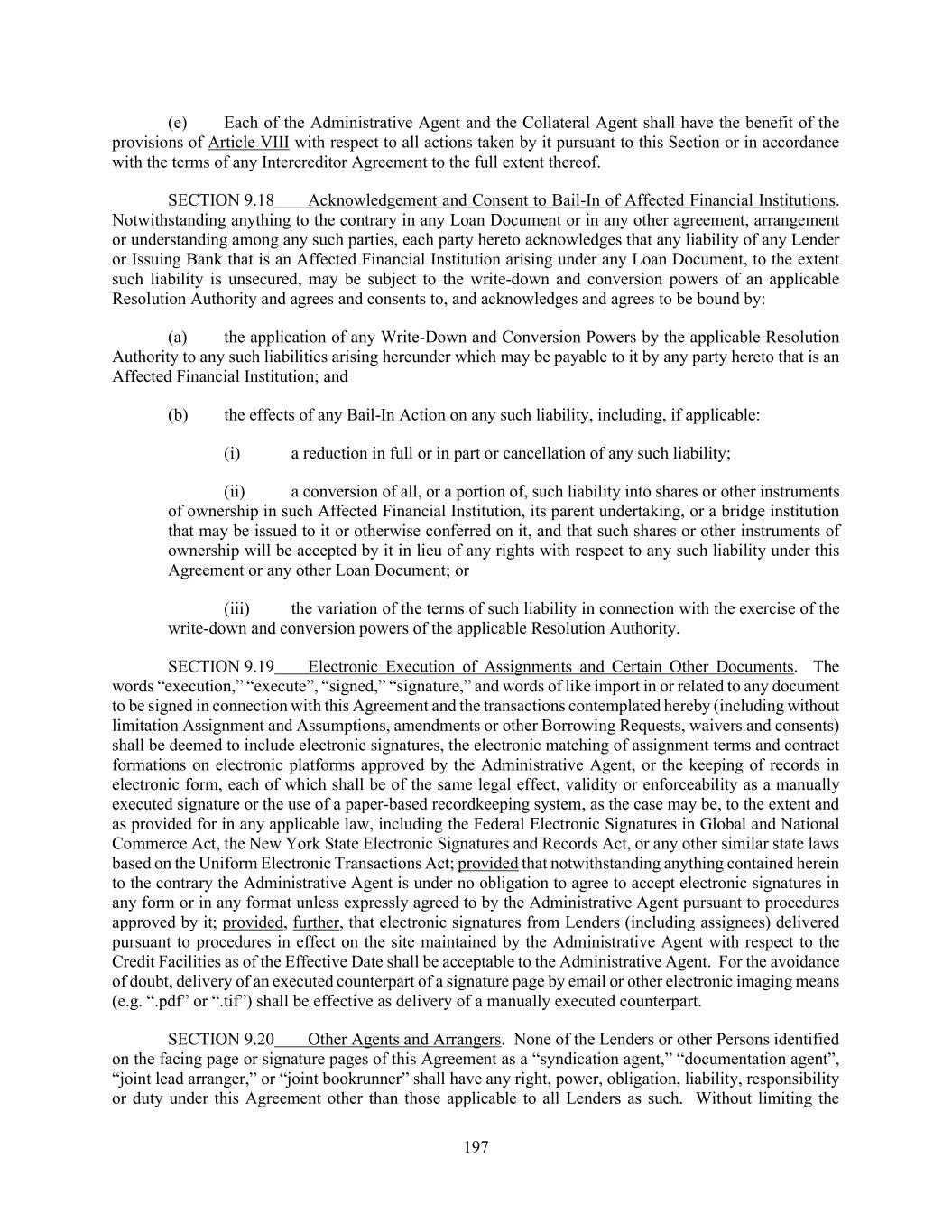 197 (e) Each of the Administrative Agent and the Collateral Agent shall have the benefit of the provisions of Article VIII with respect to all actions taken by it pursuant to this Section or in accordance with the terms of any Intercreditor Agreement to the full extent thereof. SECTION 9.18 Acknowledgement and Consent to Bail-In of Affected Financial Institutions. Notwithstanding anything to the contrary in any Loan Document or in any other agreement, arrangement or understanding among any such parties, each party hereto acknowledges that any liability of any Lender or Issuing Bank that is an Affected Financial Institution arising under any Loan Document, to the extent such liability is unsecured, may be subject to the write-down and conversion powers of an applicable Resolution Authority and agrees and consents to, and acknowledges and agrees to be bound by: (a) the application of any Write-Down and Conversion Powers by the applicable Resolution Authority to any such liabilities arising hereunder which may be payable to it by any party hereto that is an Affected Financial Institution; and (b) the effects of any Bail-In Action on any such liability, including, if applicable: (i) a reduction in full or in part or cancellation of any such liability; (ii) a conversion of all, or a portion of, such liability into shares or other instruments of ownership in such Affected Financial Institution, its parent undertaking, or a bridge institution that may be issued to it or otherwise conferred on it, and that such shares or other instruments of ownership will be accepted by it in lieu of any rights with respect to any such liability under this Agreement or any other Loan Document; or (iii) the variation of the terms of such liability in connection with the exercise of the write-down and conversion powers of the applicable Resolution Authority. SECTION 9.19 Electronic Execution of Assignments and Certain Other Documents. The words “execution,” “execute”, “signed,” “signature,” and words of like import in or related to any document to be signed in connection with this Agreement and the transactions contemplated hereby (including without limitation Assignment and Assumptions, amendments or other Borrowing Requests, waivers and consents) shall be deemed to include electronic signatures, the electronic matching of assignment terms and contract formations on electronic platforms approved by the Administrative Agent, or the keeping of records in electronic form, each of which shall be of the same legal effect, validity or enforceability as a manually executed signature or the use of a paper-based recordkeeping system, as the case may be, to the extent and as provided for in any applicable law, including the Federal Electronic Signatures in Global and National Commerce Act, the New York State Electronic Signatures and Records Act, or any other similar state laws based on the Uniform Electronic Transactions Act; provided that notwithstanding anything contained herein to the contrary the Administrative Agent is under no obligation to agree to accept electronic signatures in any form or in any format unless expressly agreed to by the Administrative Agent pursuant to procedures approved by it; provided, further, that electronic signatures from Lenders (including assignees) delivered pursuant to procedures in effect on the site maintained by the Administrative Agent with respect to the Credit Facilities as of the Effective Date shall be acceptable to the Administrative Agent. For the avoidance of doubt, delivery of an executed counterpart of a signature page by email or other electronic imaging means (e.g. “.pdf” or “.tif”) shall be effective as delivery of a manually executed counterpart. SECTION 9.20 Other Agents and Arrangers. None of the Lenders or other Persons identified on the facing page or signature pages of this Agreement as a “syndication agent,” “documentation agent”, “joint lead arranger,” or “joint bookrunner” shall have any right, power, obligation, liability, responsibility or duty under this Agreement other than those applicable to all Lenders as such. Without limiting the