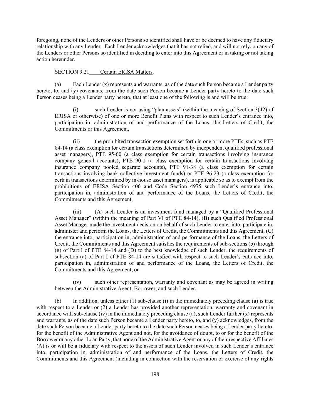 198 foregoing, none of the Lenders or other Persons so identified shall have or be deemed to have any fiduciary relationship with any Lender. Each Lender acknowledges that it has not relied, and will not rely, on any of the Lenders or other Persons so identified in deciding to enter into this Agreement or in taking or not taking action hereunder. SECTION 9.21 Certain ERISA Matters. (a) Each Lender (x) represents and warrants, as of the date such Person became a Lender party hereto, to, and (y) covenants, from the date such Person became a Lender party hereto to the date such Person ceases being a Lender party hereto, that at least one of the following is and will be true: (i) such Lender is not using “plan assets” (within the meaning of Section 3(42) of ERISA or otherwise) of one or more Benefit Plans with respect to such Lender’s entrance into, participation in, administration of and performance of the Loans, the Letters of Credit, the Commitments or this Agreement, (ii) the prohibited transaction exemption set forth in one or more PTEs, such as PTE 84-14 (a class exemption for certain transactions determined by independent qualified professional asset managers), PTE 95-60 (a class exemption for certain transactions involving insurance company general accounts), PTE 90-1 (a class exemption for certain transactions involving insurance company pooled separate accounts), PTE 91-38 (a class exemption for certain transactions involving bank collective investment funds) or PTE 96-23 (a class exemption for certain transactions determined by in-house asset managers), is applicable so as to exempt from the prohibitions of ERISA Section 406 and Code Section 4975 such Lender’s entrance into, participation in, administration of and performance of the Loans, the Letters of Credit, the Commitments and this Agreement, (iii) (A) such Lender is an investment fund managed by a “Qualified Professional Asset Manager” (within the meaning of Part VI of PTE 84-14), (B) such Qualified Professional Asset Manager made the investment decision on behalf of such Lender to enter into, participate in, administer and perform the Loans, the Letters of Credit, the Commitments and this Agreement, (C) the entrance into, participation in, administration of and performance of the Loans, the Letters of Credit, the Commitments and this Agreement satisfies the requirements of sub-sections (b) through (g) of Part I of PTE 84-14 and (D) to the best knowledge of such Lender, the requirements of subsection (a) of Part I of PTE 84-14 are satisfied with respect to such Lender’s entrance into, participation in, administration of and performance of the Loans, the Letters of Credit, the Commitments and this Agreement, or (iv) such other representation, warranty and covenant as may be agreed in writing between the Administrative Agent, Borrower, and such Lender. (b) In addition, unless either (1) sub-clause (i) in the immediately preceding clause (a) is true with respect to a Lender or (2) a Lender has provided another representation, warranty and covenant in accordance with sub-clause (iv) in the immediately preceding clause (a), such Lender further (x) represents and warrants, as of the date such Person became a Lender party hereto, to, and (y) acknowledges, from the date such Person became a Lender party hereto to the date such Person ceases being a Lender party hereto, for the benefit of the Administrative Agent and not, for the avoidance of doubt, to or for the benefit of the Borrower or any other Loan Party, that none of the Administrative Agent or any of their respective Affiliates (A) is or will be a fiduciary with respect to the assets of such Lender involved in such Lender’s entrance into, participation in, administration of and performance of the Loans, the Letters of Credit, the Commitments and this Agreement (including in connection with the reservation or exercise of any rights