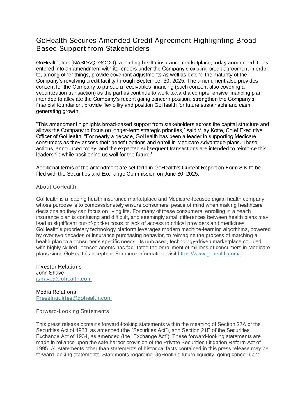 GoHealth Secures Amended Credit Agreement Highlighting Broad Based Support from Stakeholders GoHealth, Inc. (NASDAQ: GOCO), a leading health insurance marketplace, today announced it has entered into an amendment with its lenders under the Company’s existing credit agreement in order to, among other things, provide covenant adjustments as well as extend the maturity of the Company’s revolving credit facility through September 30, 2025. The amendment also provides consent for the Company to pursue a receivables financing (such consent also covering a securitization transaction) as the parties continue to work toward a comprehensive financing plan intended to alleviate the Company’s recent going concern position, strengthen the Company’s financial foundation, provide flexibility and position GoHealth for future sustainable and cash generating growth. “This amendment highlights broad-based support from stakeholders across the capital structure and allows the Company to focus on longer-term strategic priorities,” said Vijay Kotte, Chief Executive Officer of GoHealth. “For nearly a decade, GoHealth has been a leader in supporting Medicare consumers as they assess their benefit options and enroll in Medicare Advantage plans. These actions, announced today, and the expected subsequent transactions are intended to reinforce this leadership while positioning us well for the future.” Additional terms of the amendment are set forth in GoHealth’s Current Report on Form 8-K to be filed with the Securities and Exchange Commission on June 30, 2025. About GoHealth GoHealth is a leading health insurance marketplace and Medicare-focused digital health company whose purpose is to compassionately ensure consumers’ peace of mind when making healthcare decisions so they can focus on living life. For many of these consumers, enrolling in a health insurance plan is confusing and difficult, and seemingly small differences between health plans may lead to significant out-of-pocket costs or lack of access to critical providers and medicines. GoHealth’s proprietary technology platform leverages modern machine-learning algorithms, powered by over two decades of insurance purchasing behavior, to reimagine the process of matching a health plan to a consumer’s specific needs. Its unbiased, technology-driven marketplace coupled with highly skilled licensed agents has facilitated the enrollment of millions of consumers in Medicare plans since GoHealth’s inception. For more information, visit https://www.gohealth.com/. Investor Relations John Shave jshave@gohealth.com Media Relations Pressinquiries@gohealth.com Forward-Looking Statements This press release contains forward-looking statements within the meaning of Section 27A of the Securities Act of 1933, as amended (the “Securities Act”), and Section 21E of the Securities Exchange Act of 1934, as amended (the “Exchange Act”). These forward-looking statements are made in reliance upon the safe harbor provision of the Private Securities Litigation Reform Act of 1995. All statements other than statements of historical facts contained in this press release may be forward-looking statements. Statements regarding GoHealth’s future liquidity, going concern and