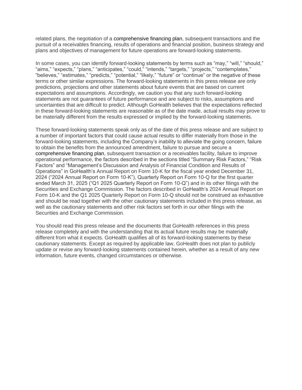 related plans, the negotiation of a comprehensive financing plan, subsequent transactions and the pursuit of a receivables financing, results of operations and financial position, business strategy and plans and objectives of management for future operations are forward-looking statements. In some cases, you can identify forward-looking statements by terms such as “may,” “will,” “should,” “aims,” “expects,” “plans,” “anticipates,” “could,” “intends,” “targets,” “projects,” “contemplates,” “believes,” “estimates,” “predicts,” “potential,” “likely,” “future” or “continue” or the negative of these terms or other similar expressions. The forward-looking statements in this press release are only predictions, projections and other statements about future events that are based on current expectations and assumptions. Accordingly, we caution you that any such forward-looking statements are not guarantees of future performance and are subject to risks, assumptions and uncertainties that are difficult to predict. Although GoHealth believes that the expectations reflected in these forward-looking statements are reasonable as of the date made, actual results may prove to be materially different from the results expressed or implied by the forward-looking statements. These forward-looking statements speak only as of the date of this press release and are subject to a number of important factors that could cause actual results to differ materially from those in the forward-looking statements, including the Company’s inability to alleviate the going concern, failure to obtain the benefits from the announced amendment, failure to pursue and secure a comprehensive financing plan, subsequent transaction or a receivables facility, failure to improve operational performance, the factors described in the sections titled “Summary Risk Factors,” “Risk Factors” and “Management’s Discussion and Analysis of Financial Condition and Results of Operations” in GoHealth’s Annual Report on Form 10-K for the fiscal year ended December 31, 2024 (“2024 Annual Report on Form 10-K”), Quarterly Report on Form 10-Q for the first quarter ended March 31, 2025 (“Q1 2025 Quarterly Report on Form 10-Q”) and in its other filings with the Securities and Exchange Commission. The factors described in GoHealth’s 2024 Annual Report on Form 10-K and the Q1 2025 Quarterly Report on Form 10-Q should not be construed as exhaustive and should be read together with the other cautionary statements included in this press release, as well as the cautionary statements and other risk factors set forth in our other filings with the Securities and Exchange Commission. You should read this press release and the documents that GoHealth references in this press release completely and with the understanding that its actual future results may be materially different from what it expects. GoHealth qualifies all of its forward-looking statements by these cautionary statements. Except as required by applicable law, GoHealth does not plan to publicly update or revise any forward-looking statements contained herein, whether as a result of any new information, future events, changed circumstances or otherwise.
