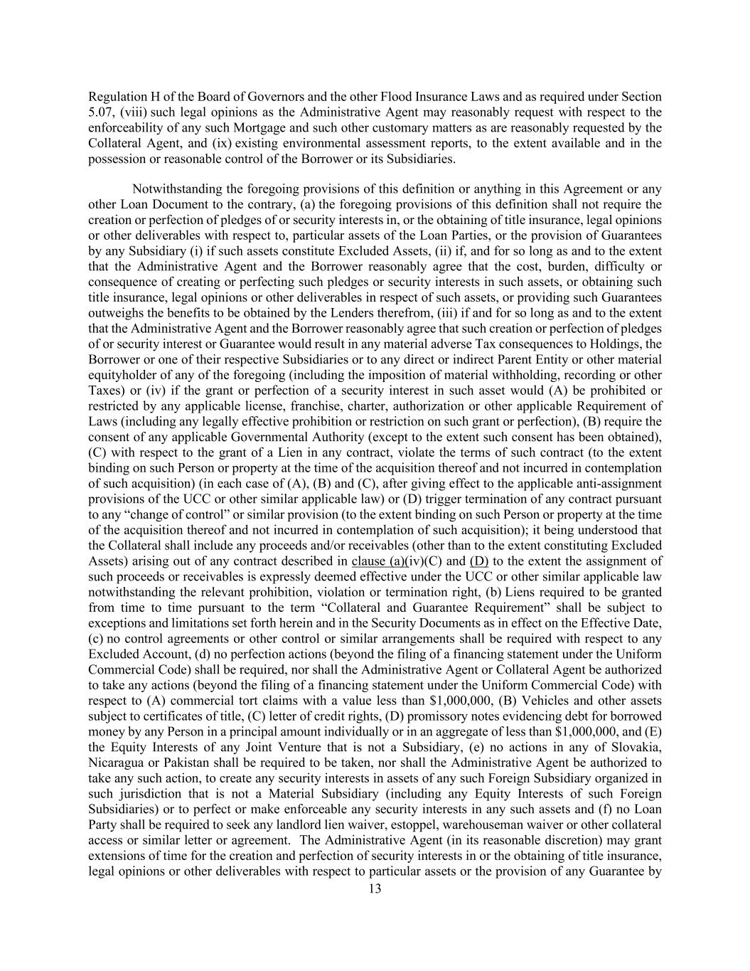 13 Regulation H of the Board of Governors and the other Flood Insurance Laws and as required under Section 5.07, (viii) such legal opinions as the Administrative Agent may reasonably request with respect to the enforceability of any such Mortgage and such other customary matters as are reasonably requested by the Collateral Agent, and (ix) existing environmental assessment reports, to the extent available and in the possession or reasonable control of the Borrower or its Subsidiaries. Notwithstanding the foregoing provisions of this definition or anything in this Agreement or any other Loan Document to the contrary, (a) the foregoing provisions of this definition shall not require the creation or perfection of pledges of or security interests in, or the obtaining of title insurance, legal opinions or other deliverables with respect to, particular assets of the Loan Parties, or the provision of Guarantees by any Subsidiary (i) if such assets constitute Excluded Assets, (ii) if, and for so long as and to the extent that the Administrative Agent and the Borrower reasonably agree that the cost, burden, difficulty or consequence of creating or perfecting such pledges or security interests in such assets, or obtaining such title insurance, legal opinions or other deliverables in respect of such assets, or providing such Guarantees outweighs the benefits to be obtained by the Lenders therefrom, (iii) if and for so long as and to the extent that the Administrative Agent and the Borrower reasonably agree that such creation or perfection of pledges of or security interest or Guarantee would result in any material adverse Tax consequences to Holdings, the Borrower or one of their respective Subsidiaries or to any direct or indirect Parent Entity or other material equityholder of any of the foregoing (including the imposition of material withholding, recording or other Taxes) or (iv) if the grant or perfection of a security interest in such asset would (A) be prohibited or restricted by any applicable license, franchise, charter, authorization or other applicable Requirement of Laws (including any legally effective prohibition or restriction on such grant or perfection), (B) require the consent of any applicable Governmental Authority (except to the extent such consent has been obtained), (C) with respect to the grant of a Lien in any contract, violate the terms of such contract (to the extent binding on such Person or property at the time of the acquisition thereof and not incurred in contemplation of such acquisition) (in each case of (A), (B) and (C), after giving effect to the applicable anti-assignment provisions of the UCC or other similar applicable law) or (D) trigger termination of any contract pursuant to any “change of control” or similar provision (to the extent binding on such Person or property at the time of the acquisition thereof and not incurred in contemplation of such acquisition); it being understood that the Collateral shall include any proceeds and/or receivables (other than to the extent constituting Excluded Assets) arising out of any contract described in clause (a)(iv)(C) and (D) to the extent the assignment of such proceeds or receivables is expressly deemed effective under the UCC or other similar applicable law notwithstanding the relevant prohibition, violation or termination right, (b) Liens required to be granted from time to time pursuant to the term “Collateral and Guarantee Requirement” shall be subject to exceptions and limitations set forth herein and in the Security Documents as in effect on the Effective Date, (c) no control agreements or other control or similar arrangements shall be required with respect to any Excluded Account, (d) no perfection actions (beyond the filing of a financing statement under the Uniform Commercial Code) shall be required, nor shall the Administrative Agent or Collateral Agent be authorized to take any actions (beyond the filing of a financing statement under the Uniform Commercial Code) with respect to (A) commercial tort claims with a value less than $1,000,000, (B) Vehicles and other assets subject to certificates of title, (C) letter of credit rights, (D) promissory notes evidencing debt for borrowed money by any Person in a principal amount individually or in an aggregate of less than $1,000,000, and (E) the Equity Interests of any Joint Venture that is not a Subsidiary, (e) no actions in any of Slovakia, Nicaragua or Pakistan shall be required to be taken, nor shall the Administrative Agent be authorized to take any such action, to create any security interests in assets of any such Foreign Subsidiary organized in such jurisdiction that is not a Material Subsidiary (including any Equity Interests of such Foreign Subsidiaries) or to perfect or make enforceable any security interests in any such assets and (f) no Loan Party shall be required to seek any landlord lien waiver, estoppel, warehouseman waiver or other collateral access or similar letter or agreement. The Administrative Agent (in its reasonable discretion) may grant extensions of time for the creation and perfection of security interests in or the obtaining of title insurance, legal opinions or other deliverables with respect to particular assets or the provision of any Guarantee by