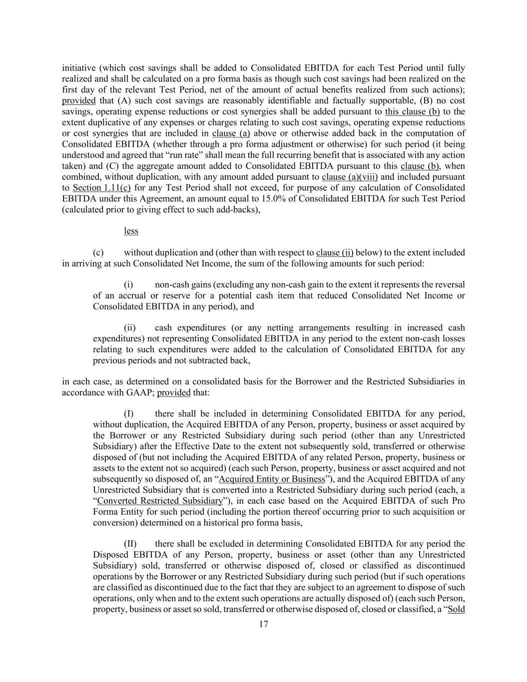 17 initiative (which cost savings shall be added to Consolidated EBITDA for each Test Period until fully realized and shall be calculated on a pro forma basis as though such cost savings had been realized on the first day of the relevant Test Period, net of the amount of actual benefits realized from such actions); provided that (A) such cost savings are reasonably identifiable and factually supportable, (B) no cost savings, operating expense reductions or cost synergies shall be added pursuant to this clause (b) to the extent duplicative of any expenses or charges relating to such cost savings, operating expense reductions or cost synergies that are included in clause (a) above or otherwise added back in the computation of Consolidated EBITDA (whether through a pro forma adjustment or otherwise) for such period (it being understood and agreed that “run rate” shall mean the full recurring benefit that is associated with any action taken) and (C) the aggregate amount added to Consolidated EBITDA pursuant to this clause (b), when combined, without duplication, with any amount added pursuant to clause (a)(viii) and included pursuant to Section 1.11(c) for any Test Period shall not exceed, for purpose of any calculation of Consolidated EBITDA under this Agreement, an amount equal to 15.0% of Consolidated EBITDA for such Test Period (calculated prior to giving effect to such add-backs), less (c) without duplication and (other than with respect to clause (ii) below) to the extent included in arriving at such Consolidated Net Income, the sum of the following amounts for such period: (i) non-cash gains (excluding any non-cash gain to the extent it represents the reversal of an accrual or reserve for a potential cash item that reduced Consolidated Net Income or Consolidated EBITDA in any period), and (ii) cash expenditures (or any netting arrangements resulting in increased cash expenditures) not representing Consolidated EBITDA in any period to the extent non-cash losses relating to such expenditures were added to the calculation of Consolidated EBITDA for any previous periods and not subtracted back, in each case, as determined on a consolidated basis for the Borrower and the Restricted Subsidiaries in accordance with GAAP; provided that: (I) there shall be included in determining Consolidated EBITDA for any period, without duplication, the Acquired EBITDA of any Person, property, business or asset acquired by the Borrower or any Restricted Subsidiary during such period (other than any Unrestricted Subsidiary) after the Effective Date to the extent not subsequently sold, transferred or otherwise disposed of (but not including the Acquired EBITDA of any related Person, property, business or assets to the extent not so acquired) (each such Person, property, business or asset acquired and not subsequently so disposed of, an “Acquired Entity or Business”), and the Acquired EBITDA of any Unrestricted Subsidiary that is converted into a Restricted Subsidiary during such period (each, a “Converted Restricted Subsidiary”), in each case based on the Acquired EBITDA of such Pro Forma Entity for such period (including the portion thereof occurring prior to such acquisition or conversion) determined on a historical pro forma basis, (II) there shall be excluded in determining Consolidated EBITDA for any period the Disposed EBITDA of any Person, property, business or asset (other than any Unrestricted Subsidiary) sold, transferred or otherwise disposed of, closed or classified as discontinued operations by the Borrower or any Restricted Subsidiary during such period (but if such operations are classified as discontinued due to the fact that they are subject to an agreement to dispose of such operations, only when and to the extent such operations are actually disposed of) (each such Person, property, business or asset so sold, transferred or otherwise disposed of, closed or classified, a “Sold