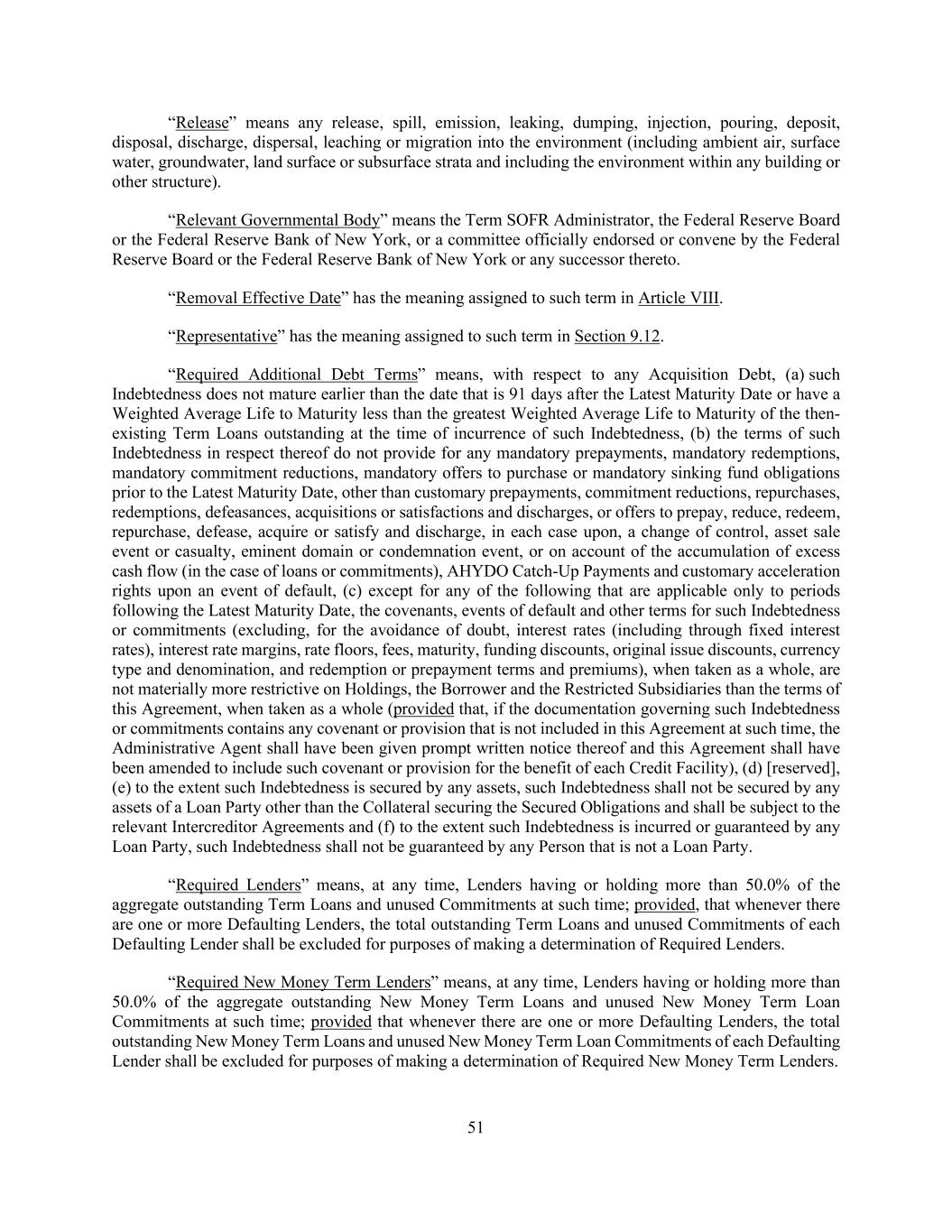 51 “Release” means any release, spill, emission, leaking, dumping, injection, pouring, deposit, disposal, discharge, dispersal, leaching or migration into the environment (including ambient air, surface water, groundwater, land surface or subsurface strata and including the environment within any building or other structure). “Relevant Governmental Body” means the Term SOFR Administrator, the Federal Reserve Board or the Federal Reserve Bank of New York, or a committee officially endorsed or convene by the Federal Reserve Board or the Federal Reserve Bank of New York or any successor thereto. “Removal Effective Date” has the meaning assigned to such term in Article VIII. “Representative” has the meaning assigned to such term in Section 9.12. “Required Additional Debt Terms” means, with respect to any Acquisition Debt, (a) such Indebtedness does not mature earlier than the date that is 91 days after the Latest Maturity Date or have a Weighted Average Life to Maturity less than the greatest Weighted Average Life to Maturity of the then- existing Term Loans outstanding at the time of incurrence of such Indebtedness, (b) the terms of such Indebtedness in respect thereof do not provide for any mandatory prepayments, mandatory redemptions, mandatory commitment reductions, mandatory offers to purchase or mandatory sinking fund obligations prior to the Latest Maturity Date, other than customary prepayments, commitment reductions, repurchases, redemptions, defeasances, acquisitions or satisfactions and discharges, or offers to prepay, reduce, redeem, repurchase, defease, acquire or satisfy and discharge, in each case upon, a change of control, asset sale event or casualty, eminent domain or condemnation event, or on account of the accumulation of excess cash flow (in the case of loans or commitments), AHYDO Catch-Up Payments and customary acceleration rights upon an event of default, (c) except for any of the following that are applicable only to periods following the Latest Maturity Date, the covenants, events of default and other terms for such Indebtedness or commitments (excluding, for the avoidance of doubt, interest rates (including through fixed interest rates), interest rate margins, rate floors, fees, maturity, funding discounts, original issue discounts, currency type and denomination, and redemption or prepayment terms and premiums), when taken as a whole, are not materially more restrictive on Holdings, the Borrower and the Restricted Subsidiaries than the terms of this Agreement, when taken as a whole (provided that, if the documentation governing such Indebtedness or commitments contains any covenant or provision that is not included in this Agreement at such time, the Administrative Agent shall have been given prompt written notice thereof and this Agreement shall have been amended to include such covenant or provision for the benefit of each Credit Facility), (d) [reserved], (e) to the extent such Indebtedness is secured by any assets, such Indebtedness shall not be secured by any assets of a Loan Party other than the Collateral securing the Secured Obligations and shall be subject to the relevant Intercreditor Agreements and (f) to the extent such Indebtedness is incurred or guaranteed by any Loan Party, such Indebtedness shall not be guaranteed by any Person that is not a Loan Party. “Required Lenders” means, at any time, Lenders having or holding more than 50.0% of the aggregate outstanding Term Loans and unused Commitments at such time; provided, that whenever there are one or more Defaulting Lenders, the total outstanding Term Loans and unused Commitments of each Defaulting Lender shall be excluded for purposes of making a determination of Required Lenders. “Required New Money Term Lenders” means, at any time, Lenders having or holding more than 50.0% of the aggregate outstanding New Money Term Loans and unused New Money Term Loan Commitments at such time; provided that whenever there are one or more Defaulting Lenders, the total outstanding New Money Term Loans and unused New Money Term Loan Commitments of each Defaulting Lender shall be excluded for purposes of making a determination of Required New Money Term Lenders.