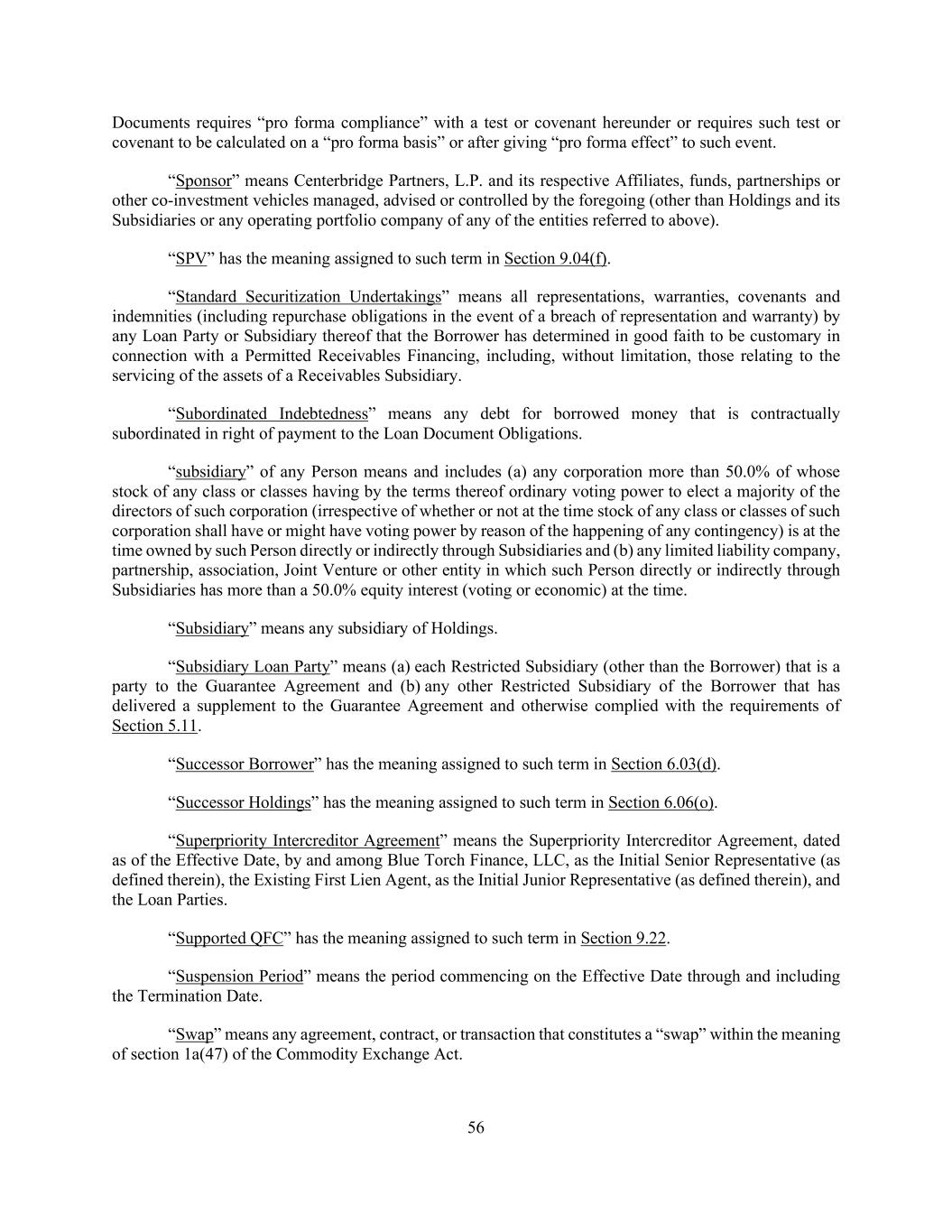 56 Documents requires “pro forma compliance” with a test or covenant hereunder or requires such test or covenant to be calculated on a “pro forma basis” or after giving “pro forma effect” to such event. “Sponsor” means Centerbridge Partners, L.P. and its respective Affiliates, funds, partnerships or other co-investment vehicles managed, advised or controlled by the foregoing (other than Holdings and its Subsidiaries or any operating portfolio company of any of the entities referred to above). “SPV” has the meaning assigned to such term in Section 9.04(f). “Standard Securitization Undertakings” means all representations, warranties, covenants and indemnities (including repurchase obligations in the event of a breach of representation and warranty) by any Loan Party or Subsidiary thereof that the Borrower has determined in good faith to be customary in connection with a Permitted Receivables Financing, including, without limitation, those relating to the servicing of the assets of a Receivables Subsidiary. “Subordinated Indebtedness” means any debt for borrowed money that is contractually subordinated in right of payment to the Loan Document Obligations. “subsidiary” of any Person means and includes (a) any corporation more than 50.0% of whose stock of any class or classes having by the terms thereof ordinary voting power to elect a majority of the directors of such corporation (irrespective of whether or not at the time stock of any class or classes of such corporation shall have or might have voting power by reason of the happening of any contingency) is at the time owned by such Person directly or indirectly through Subsidiaries and (b) any limited liability company, partnership, association, Joint Venture or other entity in which such Person directly or indirectly through Subsidiaries has more than a 50.0% equity interest (voting or economic) at the time. “Subsidiary” means any subsidiary of Holdings. “Subsidiary Loan Party” means (a) each Restricted Subsidiary (other than the Borrower) that is a party to the Guarantee Agreement and (b) any other Restricted Subsidiary of the Borrower that has delivered a supplement to the Guarantee Agreement and otherwise complied with the requirements of Section 5.11. “Successor Borrower” has the meaning assigned to such term in Section 6.03(d). “Successor Holdings” has the meaning assigned to such term in Section 6.06(o). “Superpriority Intercreditor Agreement” means the Superpriority Intercreditor Agreement, dated as of the Effective Date, by and among Blue Torch Finance, LLC, as the Initial Senior Representative (as defined therein), the Existing First Lien Agent, as the Initial Junior Representative (as defined therein), and the Loan Parties. “Supported QFC” has the meaning assigned to such term in Section 9.22. “Suspension Period” means the period commencing on the Effective Date through and including the Termination Date. “Swap” means any agreement, contract, or transaction that constitutes a “swap” within the meaning of section 1a(47) of the Commodity Exchange Act.