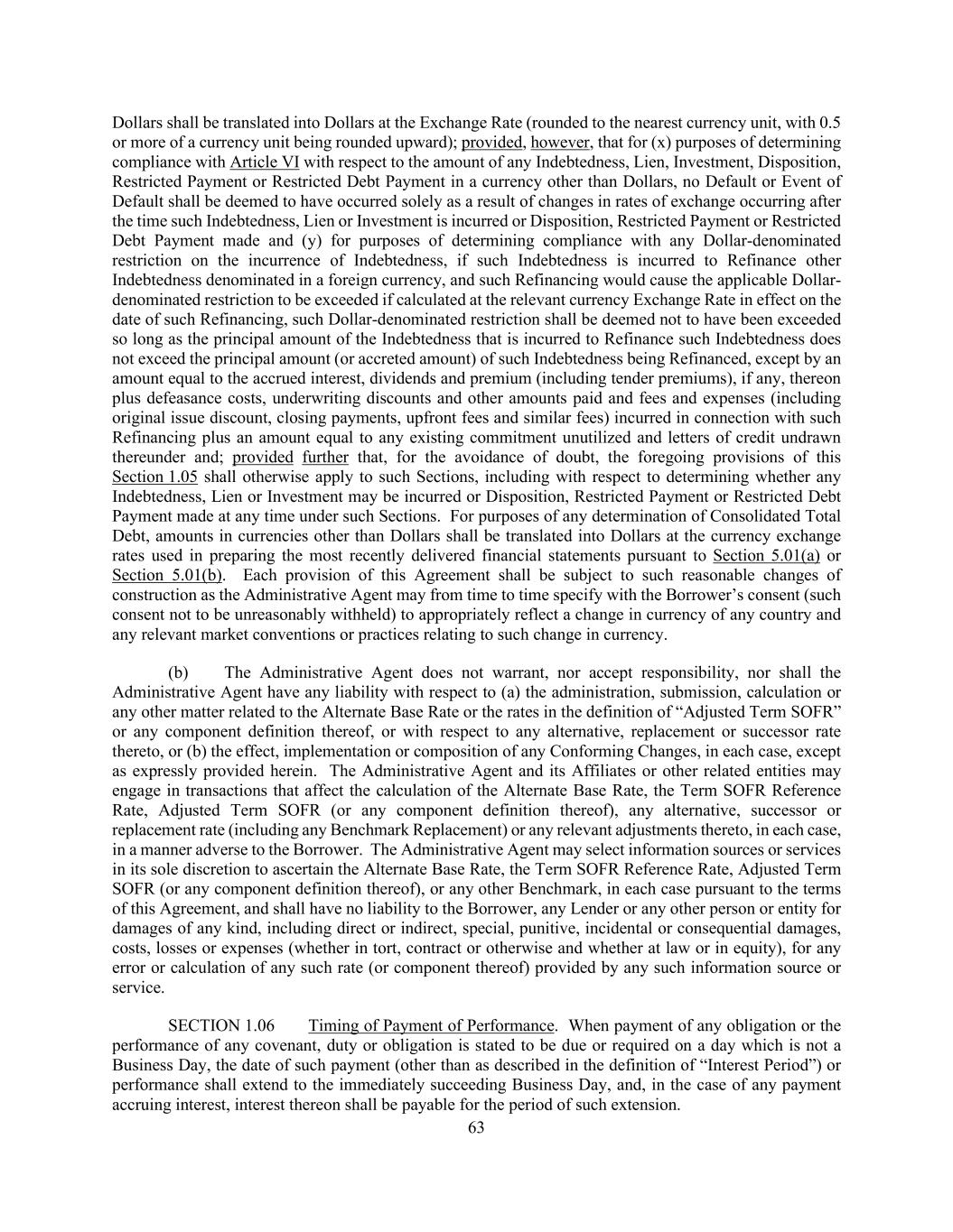 63 Dollars shall be translated into Dollars at the Exchange Rate (rounded to the nearest currency unit, with 0.5 or more of a currency unit being rounded upward); provided, however, that for (x) purposes of determining compliance with Article VI with respect to the amount of any Indebtedness, Lien, Investment, Disposition, Restricted Payment or Restricted Debt Payment in a currency other than Dollars, no Default or Event of Default shall be deemed to have occurred solely as a result of changes in rates of exchange occurring after the time such Indebtedness, Lien or Investment is incurred or Disposition, Restricted Payment or Restricted Debt Payment made and (y) for purposes of determining compliance with any Dollar-denominated restriction on the incurrence of Indebtedness, if such Indebtedness is incurred to Refinance other Indebtedness denominated in a foreign currency, and such Refinancing would cause the applicable Dollar- denominated restriction to be exceeded if calculated at the relevant currency Exchange Rate in effect on the date of such Refinancing, such Dollar-denominated restriction shall be deemed not to have been exceeded so long as the principal amount of the Indebtedness that is incurred to Refinance such Indebtedness does not exceed the principal amount (or accreted amount) of such Indebtedness being Refinanced, except by an amount equal to the accrued interest, dividends and premium (including tender premiums), if any, thereon plus defeasance costs, underwriting discounts and other amounts paid and fees and expenses (including original issue discount, closing payments, upfront fees and similar fees) incurred in connection with such Refinancing plus an amount equal to any existing commitment unutilized and letters of credit undrawn thereunder and; provided further that, for the avoidance of doubt, the foregoing provisions of this Section 1.05 shall otherwise apply to such Sections, including with respect to determining whether any Indebtedness, Lien or Investment may be incurred or Disposition, Restricted Payment or Restricted Debt Payment made at any time under such Sections. For purposes of any determination of Consolidated Total Debt, amounts in currencies other than Dollars shall be translated into Dollars at the currency exchange rates used in preparing the most recently delivered financial statements pursuant to Section 5.01(a) or Section 5.01(b). Each provision of this Agreement shall be subject to such reasonable changes of construction as the Administrative Agent may from time to time specify with the Borrower’s consent (such consent not to be unreasonably withheld) to appropriately reflect a change in currency of any country and any relevant market conventions or practices relating to such change in currency. (b) The Administrative Agent does not warrant, nor accept responsibility, nor shall the Administrative Agent have any liability with respect to (a) the administration, submission, calculation or any other matter related to the Alternate Base Rate or the rates in the definition of “Adjusted Term SOFR” or any component definition thereof, or with respect to any alternative, replacement or successor rate thereto, or (b) the effect, implementation or composition of any Conforming Changes, in each case, except as expressly provided herein. The Administrative Agent and its Affiliates or other related entities may engage in transactions that affect the calculation of the Alternate Base Rate, the Term SOFR Reference Rate, Adjusted Term SOFR (or any component definition thereof), any alternative, successor or replacement rate (including any Benchmark Replacement) or any relevant adjustments thereto, in each case, in a manner adverse to the Borrower. The Administrative Agent may select information sources or services in its sole discretion to ascertain the Alternate Base Rate, the Term SOFR Reference Rate, Adjusted Term SOFR (or any component definition thereof), or any other Benchmark, in each case pursuant to the terms of this Agreement, and shall have no liability to the Borrower, any Lender or any other person or entity for damages of any kind, including direct or indirect, special, punitive, incidental or consequential damages, costs, losses or expenses (whether in tort, contract or otherwise and whether at law or in equity), for any error or calculation of any such rate (or component thereof) provided by any such information source or service. SECTION 1.06 Timing of Payment of Performance. When payment of any obligation or the performance of any covenant, duty or obligation is stated to be due or required on a day which is not a Business Day, the date of such payment (other than as described in the definition of “Interest Period”) or performance shall extend to the immediately succeeding Business Day, and, in the case of any payment accruing interest, interest thereon shall be payable for the period of such extension.