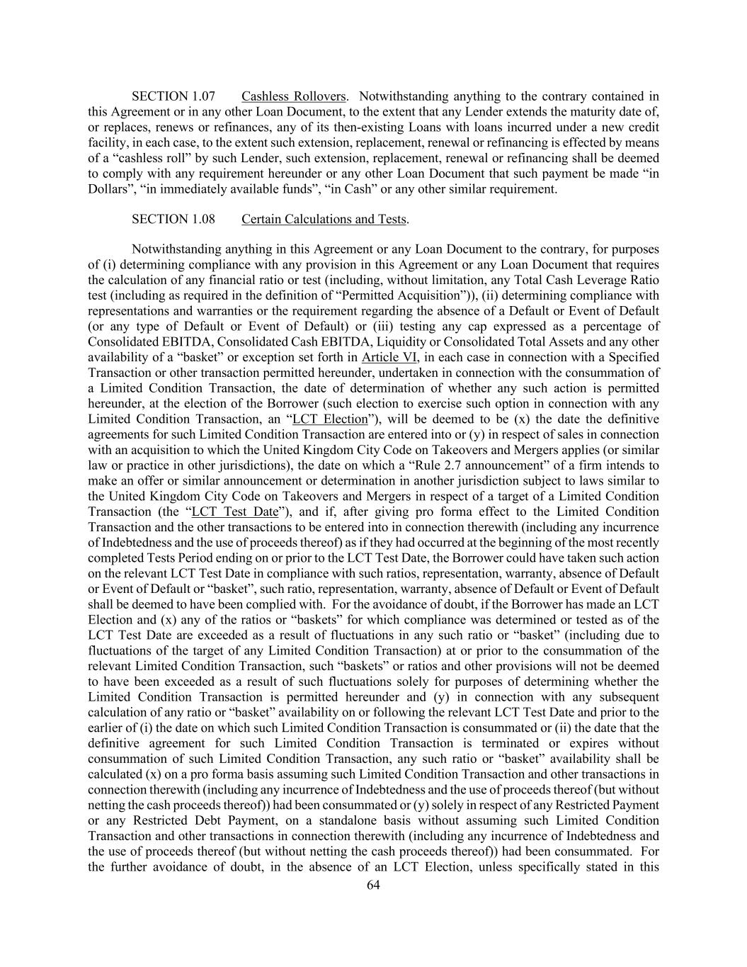64 SECTION 1.07 Cashless Rollovers. Notwithstanding anything to the contrary contained in this Agreement or in any other Loan Document, to the extent that any Lender extends the maturity date of, or replaces, renews or refinances, any of its then-existing Loans with loans incurred under a new credit facility, in each case, to the extent such extension, replacement, renewal or refinancing is effected by means of a “cashless roll” by such Lender, such extension, replacement, renewal or refinancing shall be deemed to comply with any requirement hereunder or any other Loan Document that such payment be made “in Dollars”, “in immediately available funds”, “in Cash” or any other similar requirement. SECTION 1.08 Certain Calculations and Tests. Notwithstanding anything in this Agreement or any Loan Document to the contrary, for purposes of (i) determining compliance with any provision in this Agreement or any Loan Document that requires the calculation of any financial ratio or test (including, without limitation, any Total Cash Leverage Ratio test (including as required in the definition of “Permitted Acquisition”)), (ii) determining compliance with representations and warranties or the requirement regarding the absence of a Default or Event of Default (or any type of Default or Event of Default) or (iii) testing any cap expressed as a percentage of Consolidated EBITDA, Consolidated Cash EBITDA, Liquidity or Consolidated Total Assets and any other availability of a “basket” or exception set forth in Article VI, in each case in connection with a Specified Transaction or other transaction permitted hereunder, undertaken in connection with the consummation of a Limited Condition Transaction, the date of determination of whether any such action is permitted hereunder, at the election of the Borrower (such election to exercise such option in connection with any Limited Condition Transaction, an “LCT Election”), will be deemed to be (x) the date the definitive agreements for such Limited Condition Transaction are entered into or (y) in respect of sales in connection with an acquisition to which the United Kingdom City Code on Takeovers and Mergers applies (or similar law or practice in other jurisdictions), the date on which a “Rule 2.7 announcement” of a firm intends to make an offer or similar announcement or determination in another jurisdiction subject to laws similar to the United Kingdom City Code on Takeovers and Mergers in respect of a target of a Limited Condition Transaction (the “LCT Test Date”), and if, after giving pro forma effect to the Limited Condition Transaction and the other transactions to be entered into in connection therewith (including any incurrence of Indebtedness and the use of proceeds thereof) as if they had occurred at the beginning of the most recently completed Tests Period ending on or prior to the LCT Test Date, the Borrower could have taken such action on the relevant LCT Test Date in compliance with such ratios, representation, warranty, absence of Default or Event of Default or “basket”, such ratio, representation, warranty, absence of Default or Event of Default shall be deemed to have been complied with. For the avoidance of doubt, if the Borrower has made an LCT Election and (x) any of the ratios or “baskets” for which compliance was determined or tested as of the LCT Test Date are exceeded as a result of fluctuations in any such ratio or “basket” (including due to fluctuations of the target of any Limited Condition Transaction) at or prior to the consummation of the relevant Limited Condition Transaction, such “baskets” or ratios and other provisions will not be deemed to have been exceeded as a result of such fluctuations solely for purposes of determining whether the Limited Condition Transaction is permitted hereunder and (y) in connection with any subsequent calculation of any ratio or “basket” availability on or following the relevant LCT Test Date and prior to the earlier of (i) the date on which such Limited Condition Transaction is consummated or (ii) the date that the definitive agreement for such Limited Condition Transaction is terminated or expires without consummation of such Limited Condition Transaction, any such ratio or “basket” availability shall be calculated (x) on a pro forma basis assuming such Limited Condition Transaction and other transactions in connection therewith (including any incurrence of Indebtedness and the use of proceeds thereof (but without netting the cash proceeds thereof)) had been consummated or (y) solely in respect of any Restricted Payment or any Restricted Debt Payment, on a standalone basis without assuming such Limited Condition Transaction and other transactions in connection therewith (including any incurrence of Indebtedness and the use of proceeds thereof (but without netting the cash proceeds thereof)) had been consummated. For the further avoidance of doubt, in the absence of an LCT Election, unless specifically stated in this