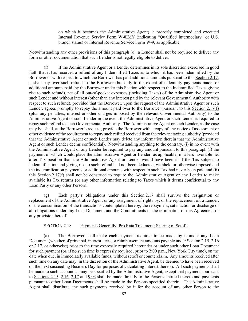 82 on which it becomes the Administrative Agent), a properly completed and executed Internal Revenue Service Form W-8IMY (indicating “Qualified Intermediary” or U.S. branch status) or Internal Revenue Service Form W-9, as applicable. Notwithstanding any other provisions of this paragraph (e), a Lender shall not be required to deliver any form or other documentation that such Lender is not legally eligible to deliver. (f) If the Administrative Agent or a Lender determines in its sole discretion exercised in good faith that it has received a refund of any Indemnified Taxes as to which it has been indemnified by the Borrower or with respect to which the Borrower has paid additional amounts pursuant to this Section 2.17, it shall pay over such refund to the Borrower (but only to the extent of indemnity payments made, or additional amounts paid, by the Borrower under this Section with respect to the Indemnified Taxes giving rise to such refund), net of all out-of-pocket expenses (including Taxes) of the Administrative Agent or such Lender and without interest (other than any interest paid by the relevant Governmental Authority with respect to such refund), provided that the Borrower, upon the request of the Administrative Agent or such Lender, agrees promptly to repay the amount paid over to the Borrower pursuant to this Section 2.17(f) (plus any penalties, interest or other charges imposed by the relevant Governmental Authority) to the Administrative Agent or such Lender in the event the Administrative Agent or such Lender is required to repay such refund to such Governmental Authority. The Administrative Agent or such Lender, as the case may be, shall, at the Borrower’s request, provide the Borrower with a copy of any notice of assessment or other evidence of the requirement to repay such refund received from the relevant taxing authority (provided that the Administrative Agent or such Lender may delete any information therein that the Administrative Agent or such Lender deems confidential). Notwithstanding anything to the contrary, (i) in no event with the Administrative Agent or any Lender be required to pay any amount pursuant to this paragraph (f) the payment of which would place the administrative Agent or Lender, as applicable, in a less favorable net after-Tax position than the Administrative Agent or Lender would have been in if the Tax subject to indemnification and giving rise to such refund had not been deducted, withheld or otherwise imposed and the indemnification payments or additional amounts with respect to such Tax had never been paid and (ii) this Section 2.17(f) shall not be construed to require the Administrative Agent or any Lender to make available its Tax returns (or any other information relating to Taxes which it deems confidential to any Loan Party or any other Person). (g) Each party’s obligations under this Section 2.17 shall survive the resignation or replacement of the Administrative Agent or any assignment of rights by, or the replacement of, a Lender, or the consummation of the transactions contemplated hereby, the repayment, satisfaction or discharge of all obligations under any Loan Document and the Commitments or the termination of this Agreement or any provision hereof. SECTION 2.18 Payments Generally; Pro Rata Treatment; Sharing of Setoffs. (a) The Borrower shall make each payment required to be made by it under any Loan Document (whether of principal, interest, fees, or reimbursement amounts payable under Section 2.15, 2.16 or 2.17, or otherwise) prior to the time expressly required hereunder or under such other Loan Document for such payment (or, if no such time is expressly required, prior to 2:00 p.m., New York City time), on the date when due, in immediately available funds, without setoff or counterclaim. Any amounts received after such time on any date may, in the discretion of the Administrative Agent, be deemed to have been received on the next succeeding Business Day for purposes of calculating interest thereon. All such payments shall be made to such account as may be specified by the Administrative Agent, except that payments pursuant to Sections 2.15, 2.16, 2.17 and 9.03 shall be made directly to the Persons entitled thereto and payments pursuant to other Loan Documents shall be made to the Persons specified therein. The Administrative Agent shall distribute any such payments received by it for the account of any other Person to the