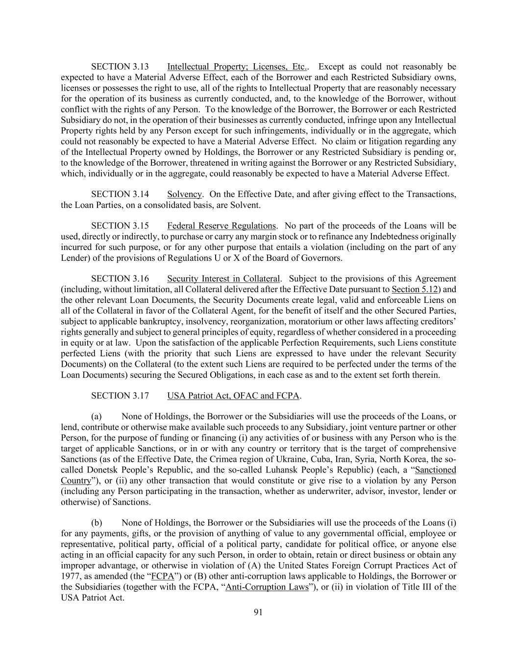 91 SECTION 3.13 Intellectual Property; Licenses, Etc.. Except as could not reasonably be expected to have a Material Adverse Effect, each of the Borrower and each Restricted Subsidiary owns, licenses or possesses the right to use, all of the rights to Intellectual Property that are reasonably necessary for the operation of its business as currently conducted, and, to the knowledge of the Borrower, without conflict with the rights of any Person. To the knowledge of the Borrower, the Borrower or each Restricted Subsidiary do not, in the operation of their businesses as currently conducted, infringe upon any Intellectual Property rights held by any Person except for such infringements, individually or in the aggregate, which could not reasonably be expected to have a Material Adverse Effect. No claim or litigation regarding any of the Intellectual Property owned by Holdings, the Borrower or any Restricted Subsidiary is pending or, to the knowledge of the Borrower, threatened in writing against the Borrower or any Restricted Subsidiary, which, individually or in the aggregate, could reasonably be expected to have a Material Adverse Effect. SECTION 3.14 Solvency. On the Effective Date, and after giving effect to the Transactions, the Loan Parties, on a consolidated basis, are Solvent. SECTION 3.15 Federal Reserve Regulations. No part of the proceeds of the Loans will be used, directly or indirectly, to purchase or carry any margin stock or to refinance any Indebtedness originally incurred for such purpose, or for any other purpose that entails a violation (including on the part of any Lender) of the provisions of Regulations U or X of the Board of Governors. SECTION 3.16 Security Interest in Collateral. Subject to the provisions of this Agreement (including, without limitation, all Collateral delivered after the Effective Date pursuant to Section 5.12) and the other relevant Loan Documents, the Security Documents create legal, valid and enforceable Liens on all of the Collateral in favor of the Collateral Agent, for the benefit of itself and the other Secured Parties, subject to applicable bankruptcy, insolvency, reorganization, moratorium or other laws affecting creditors’ rights generally and subject to general principles of equity, regardless of whether considered in a proceeding in equity or at law. Upon the satisfaction of the applicable Perfection Requirements, such Liens constitute perfected Liens (with the priority that such Liens are expressed to have under the relevant Security Documents) on the Collateral (to the extent such Liens are required to be perfected under the terms of the Loan Documents) securing the Secured Obligations, in each case as and to the extent set forth therein. SECTION 3.17 USA Patriot Act, OFAC and FCPA. (a) None of Holdings, the Borrower or the Subsidiaries will use the proceeds of the Loans, or lend, contribute or otherwise make available such proceeds to any Subsidiary, joint venture partner or other Person, for the purpose of funding or financing (i) any activities of or business with any Person who is the target of applicable Sanctions, or in or with any country or territory that is the target of comprehensive Sanctions (as of the Effective Date, the Crimea region of Ukraine, Cuba, Iran, Syria, North Korea, the so- called Donetsk People’s Republic, and the so-called Luhansk People’s Republic) (each, a “Sanctioned Country”), or (ii) any other transaction that would constitute or give rise to a violation by any Person (including any Person participating in the transaction, whether as underwriter, advisor, investor, lender or otherwise) of Sanctions. (b) None of Holdings, the Borrower or the Subsidiaries will use the proceeds of the Loans (i) for any payments, gifts, or the provision of anything of value to any governmental official, employee or representative, political party, official of a political party, candidate for political office, or anyone else acting in an official capacity for any such Person, in order to obtain, retain or direct business or obtain any improper advantage, or otherwise in violation of (A) the United States Foreign Corrupt Practices Act of 1977, as amended (the “FCPA”) or (B) other anti-corruption laws applicable to Holdings, the Borrower or the Subsidiaries (together with the FCPA, “Anti-Corruption Laws”), or (ii) in violation of Title III of the USA Patriot Act.
