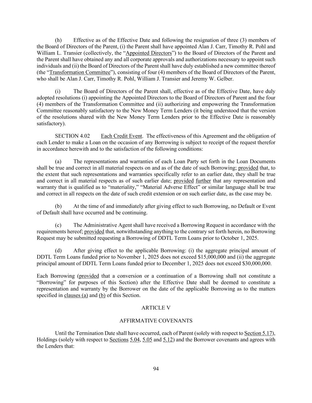 94 (h) Effective as of the Effective Date and following the resignation of three (3) members of the Board of Directors of the Parent, (i) the Parent shall have appointed Alan J. Carr, Timothy R. Pohl and William L. Transier (collectively, the “Appointed Directors”) to the Board of Directors of the Parent and the Parent shall have obtained any and all corporate approvals and authorizations necessary to appoint such individuals and (ii) the Board of Directors of the Parent shall have duly established a new committee thereof (the “Transformation Committee”), consisting of four (4) members of the Board of Directors of the Parent, who shall be Alan J. Carr, Timothy R. Pohl, William J. Transier and Jeremy W. Gelber. (i) The Board of Directors of the Parent shall, effective as of the Effective Date, have duly adopted resolutions (i) appointing the Appointed Directors to the Board of Directors of Parent and the four (4) members of the Transformation Committee and (ii) authorizing and empowering the Transformation Committee reasonably satisfactory to the New Money Term Lenders (it being understood that the version of the resolutions shared with the New Money Term Lenders prior to the Effective Date is reasonably satisfactory). SECTION 4.02 Each Credit Event. The effectiveness of this Agreement and the obligation of each Lender to make a Loan on the occasion of any Borrowing is subject to receipt of the request therefor in accordance herewith and to the satisfaction of the following conditions: (a) The representations and warranties of each Loan Party set forth in the Loan Documents shall be true and correct in all material respects on and as of the date of such Borrowing; provided that, to the extent that such representations and warranties specifically refer to an earlier date, they shall be true and correct in all material respects as of such earlier date; provided further that any representation and warranty that is qualified as to “materiality,” “Material Adverse Effect” or similar language shall be true and correct in all respects on the date of such credit extension or on such earlier date, as the case may be. (b) At the time of and immediately after giving effect to such Borrowing, no Default or Event of Default shall have occurred and be continuing. (c) The Administrative Agent shall have received a Borrowing Request in accordance with the requirements hereof; provided that, notwithstanding anything to the contrary set forth herein, no Borrowing Request may be submitted requesting a Borrowing of DDTL Term Loans prior to October 1, 2025. (d) After giving effect to the applicable Borrowing: (i) the aggregate principal amount of DDTL Term Loans funded prior to November 1, 2025 does not exceed $15,000,000 and (ii) the aggregate principal amount of DDTL Term Loans funded prior to December 1, 2025 does not exceed $30,000,000. Each Borrowing (provided that a conversion or a continuation of a Borrowing shall not constitute a “Borrowing” for purposes of this Section) after the Effective Date shall be deemed to constitute a representation and warranty by the Borrower on the date of the applicable Borrowing as to the matters specified in clauses (a) and (b) of this Section. ARTICLE V AFFIRMATIVE COVENANTS Until the Termination Date shall have occurred, each of Parent (solely with respect to Section 5.17), Holdings (solely with respect to Sections 5.04, 5.05 and 5.12) and the Borrower covenants and agrees with the Lenders that: