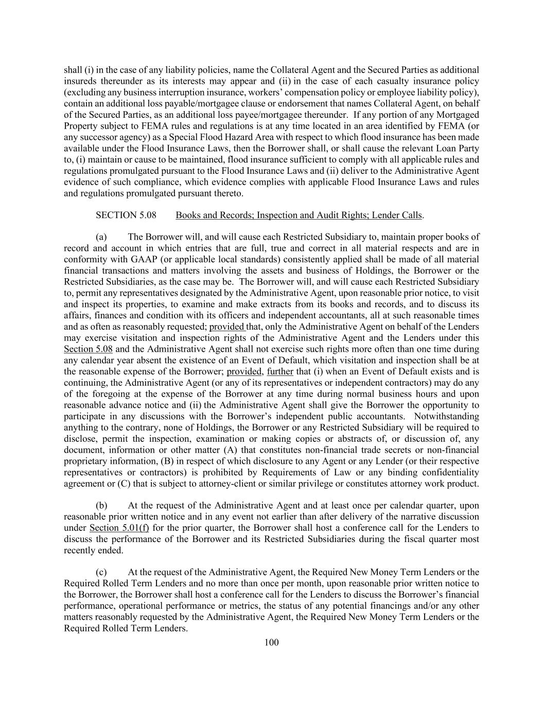 100 shall (i) in the case of any liability policies, name the Collateral Agent and the Secured Parties as additional insureds thereunder as its interests may appear and (ii) in the case of each casualty insurance policy (excluding any business interruption insurance, workers’ compensation policy or employee liability policy), contain an additional loss payable/mortgagee clause or endorsement that names Collateral Agent, on behalf of the Secured Parties, as an additional loss payee/mortgagee thereunder. If any portion of any Mortgaged Property subject to FEMA rules and regulations is at any time located in an area identified by FEMA (or any successor agency) as a Special Flood Hazard Area with respect to which flood insurance has been made available under the Flood Insurance Laws, then the Borrower shall, or shall cause the relevant Loan Party to, (i) maintain or cause to be maintained, flood insurance sufficient to comply with all applicable rules and regulations promulgated pursuant to the Flood Insurance Laws and (ii) deliver to the Administrative Agent evidence of such compliance, which evidence complies with applicable Flood Insurance Laws and rules and regulations promulgated pursuant thereto. SECTION 5.08 Books and Records; Inspection and Audit Rights; Lender Calls. (a) The Borrower will, and will cause each Restricted Subsidiary to, maintain proper books of record and account in which entries that are full, true and correct in all material respects and are in conformity with GAAP (or applicable local standards) consistently applied shall be made of all material financial transactions and matters involving the assets and business of Holdings, the Borrower or the Restricted Subsidiaries, as the case may be. The Borrower will, and will cause each Restricted Subsidiary to, permit any representatives designated by the Administrative Agent, upon reasonable prior notice, to visit and inspect its properties, to examine and make extracts from its books and records, and to discuss its affairs, finances and condition with its officers and independent accountants, all at such reasonable times and as often as reasonably requested; provided that, only the Administrative Agent on behalf of the Lenders may exercise visitation and inspection rights of the Administrative Agent and the Lenders under this Section 5.08 and the Administrative Agent shall not exercise such rights more often than one time during any calendar year absent the existence of an Event of Default, which visitation and inspection shall be at the reasonable expense of the Borrower; provided, further that (i) when an Event of Default exists and is continuing, the Administrative Agent (or any of its representatives or independent contractors) may do any of the foregoing at the expense of the Borrower at any time during normal business hours and upon reasonable advance notice and (ii) the Administrative Agent shall give the Borrower the opportunity to participate in any discussions with the Borrower’s independent public accountants. Notwithstanding anything to the contrary, none of Holdings, the Borrower or any Restricted Subsidiary will be required to disclose, permit the inspection, examination or making copies or abstracts of, or discussion of, any document, information or other matter (A) that constitutes non-financial trade secrets or non-financial proprietary information, (B) in respect of which disclosure to any Agent or any Lender (or their respective representatives or contractors) is prohibited by Requirements of Law or any binding confidentiality agreement or (C) that is subject to attorney-client or similar privilege or constitutes attorney work product. (b) At the request of the Administrative Agent and at least once per calendar quarter, upon reasonable prior written notice and in any event not earlier than after delivery of the narrative discussion under Section 5.01(f) for the prior quarter, the Borrower shall host a conference call for the Lenders to discuss the performance of the Borrower and its Restricted Subsidiaries during the fiscal quarter most recently ended. (c) At the request of the Administrative Agent, the Required New Money Term Lenders or the Required Rolled Term Lenders and no more than once per month, upon reasonable prior written notice to the Borrower, the Borrower shall host a conference call for the Lenders to discuss the Borrower’s financial performance, operational performance or metrics, the status of any potential financings and/or any other matters reasonably requested by the Administrative Agent, the Required New Money Term Lenders or the Required Rolled Term Lenders.