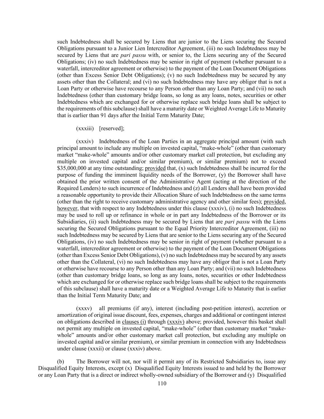 110 such Indebtedness shall be secured by Liens that are junior to the Liens securing the Secured Obligations pursuant to a Junior Lien Intercreditor Agreement, (iii) no such Indebtedness may be secured by Liens that are pari passu with, or senior to, the Liens securing any of the Secured Obligations; (iv) no such Indebtedness may be senior in right of payment (whether pursuant to a waterfall, intercreditor agreement or otherwise) to the payment of the Loan Document Obligations (other than Excess Senior Debt Obligations); (v) no such Indebtedness may be secured by any assets other than the Collateral; and (vi) no such Indebtedness may have any obligor that is not a Loan Party or otherwise have recourse to any Person other than any Loan Party; and (vii) no such Indebtedness (other than customary bridge loans, so long as any loans, notes, securities or other Indebtedness which are exchanged for or otherwise replace such bridge loans shall be subject to the requirements of this subclause) shall have a maturity date or Weighted Average Life to Maturity that is earlier than 91 days after the Initial Term Maturity Date; (xxxiii) [reserved]; (xxxiv) Indebtedness of the Loan Parties in an aggregate principal amount (with such principal amount to include any multiple on invested capital, “make-whole” (other than customary market “make-whole” amounts and/or other customary market call protection, but excluding any multiple on invested capital and/or similar premium), or similar premium) not to exceed $35,000,000 at any time outstanding; provided that, (x) such Indebtedness shall be incurred for the purpose of funding the imminent liquidity needs of the Borrower, (y) the Borrower shall have obtained the prior written consent of the Administrative Agent (acting at the direction of the Required Lenders) to such incurrence of Indebtedness and (z) all Lenders shall have been provided a reasonable opportunity to provide their Allocation Share of such Indebtedness on the same terms (other than the right to receive customary administrative agency and other similar fees); provided, however, that with respect to any Indebtedness under this clause (xxxiv), (i) no such Indebtedness may be used to roll up or refinance in whole or in part any Indebtedness of the Borrower or its Subsidiaries, (ii) such Indebtedness may be secured by Liens that are pari passu with the Liens securing the Secured Obligations pursuant to the Equal Priority Intercreditor Agreement, (iii) no such Indebtedness may be secured by Liens that are senior to the Liens securing any of the Secured Obligations, (iv) no such Indebtedness may be senior in right of payment (whether pursuant to a waterfall, intercreditor agreement or otherwise) to the payment of the Loan Document Obligations (other than Excess Senior Debt Obligations), (v) no such Indebtedness may be secured by any assets other than the Collateral, (vi) no such Indebtedness may have any obligor that is not a Loan Party or otherwise have recourse to any Person other than any Loan Party; and (vii) no such Indebtedness (other than customary bridge loans, so long as any loans, notes, securities or other Indebtedness which are exchanged for or otherwise replace such bridge loans shall be subject to the requirements of this subclause) shall have a maturity date or a Weighted Average Life to Maturity that is earlier than the Initial Term Maturity Date; and (xxxv) all premiums (if any), interest (including post-petition interest), accretion or amortization of original issue discount, fees, expenses, charges and additional or contingent interest on obligations described in clauses (i) through (xxxiv) above; provided, however this basket shall not permit any multiple on invested capital, “make-whole” (other than customary market “make- whole” amounts and/or other customary market call protection, but excluding any multiple on invested capital and/or similar premium), or similar premium in connection with any Indebtedness under clause (xxxii) or clause (xxxiv) above. (b) The Borrower will not, nor will it permit any of its Restricted Subsidiaries to, issue any Disqualified Equity Interests, except (x) Disqualified Equity Interests issued to and held by the Borrower or any Loan Party that is a direct or indirect wholly-owned subsidiary of the Borrower and (y) Disqualified
