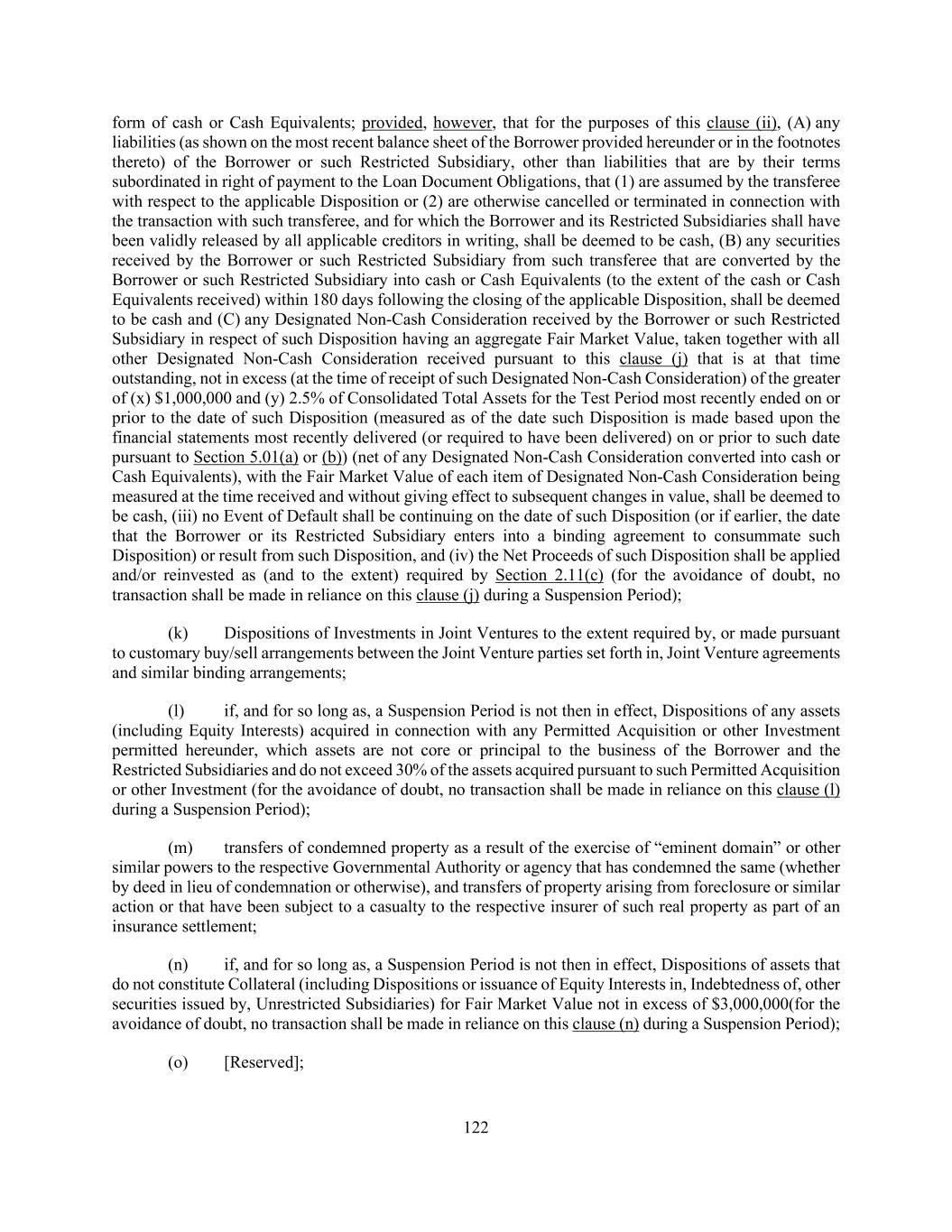 122 form of cash or Cash Equivalents; provided, however, that for the purposes of this clause (ii), (A) any liabilities (as shown on the most recent balance sheet of the Borrower provided hereunder or in the footnotes thereto) of the Borrower or such Restricted Subsidiary, other than liabilities that are by their terms subordinated in right of payment to the Loan Document Obligations, that (1) are assumed by the transferee with respect to the applicable Disposition or (2) are otherwise cancelled or terminated in connection with the transaction with such transferee, and for which the Borrower and its Restricted Subsidiaries shall have been validly released by all applicable creditors in writing, shall be deemed to be cash, (B) any securities received by the Borrower or such Restricted Subsidiary from such transferee that are converted by the Borrower or such Restricted Subsidiary into cash or Cash Equivalents (to the extent of the cash or Cash Equivalents received) within 180 days following the closing of the applicable Disposition, shall be deemed to be cash and (C) any Designated Non-Cash Consideration received by the Borrower or such Restricted Subsidiary in respect of such Disposition having an aggregate Fair Market Value, taken together with all other Designated Non-Cash Consideration received pursuant to this clause (j) that is at that time outstanding, not in excess (at the time of receipt of such Designated Non-Cash Consideration) of the greater of (x) $1,000,000 and (y) 2.5% of Consolidated Total Assets for the Test Period most recently ended on or prior to the date of such Disposition (measured as of the date such Disposition is made based upon the financial statements most recently delivered (or required to have been delivered) on or prior to such date pursuant to Section 5.01(a) or (b)) (net of any Designated Non-Cash Consideration converted into cash or Cash Equivalents), with the Fair Market Value of each item of Designated Non-Cash Consideration being measured at the time received and without giving effect to subsequent changes in value, shall be deemed to be cash, (iii) no Event of Default shall be continuing on the date of such Disposition (or if earlier, the date that the Borrower or its Restricted Subsidiary enters into a binding agreement to consummate such Disposition) or result from such Disposition, and (iv) the Net Proceeds of such Disposition shall be applied and/or reinvested as (and to the extent) required by Section 2.11(c) (for the avoidance of doubt, no transaction shall be made in reliance on this clause (j) during a Suspension Period); (k) Dispositions of Investments in Joint Ventures to the extent required by, or made pursuant to customary buy/sell arrangements between the Joint Venture parties set forth in, Joint Venture agreements and similar binding arrangements; (l) if, and for so long as, a Suspension Period is not then in effect, Dispositions of any assets (including Equity Interests) acquired in connection with any Permitted Acquisition or other Investment permitted hereunder, which assets are not core or principal to the business of the Borrower and the Restricted Subsidiaries and do not exceed 30% of the assets acquired pursuant to such Permitted Acquisition or other Investment (for the avoidance of doubt, no transaction shall be made in reliance on this clause (l) during a Suspension Period); (m) transfers of condemned property as a result of the exercise of “eminent domain” or other similar powers to the respective Governmental Authority or agency that has condemned the same (whether by deed in lieu of condemnation or otherwise), and transfers of property arising from foreclosure or similar action or that have been subject to a casualty to the respective insurer of such real property as part of an insurance settlement; (n) if, and for so long as, a Suspension Period is not then in effect, Dispositions of assets that do not constitute Collateral (including Dispositions or issuance of Equity Interests in, Indebtedness of, other securities issued by, Unrestricted Subsidiaries) for Fair Market Value not in excess of $3,000,000(for the avoidance of doubt, no transaction shall be made in reliance on this clause (n) during a Suspension Period); (o) [Reserved];