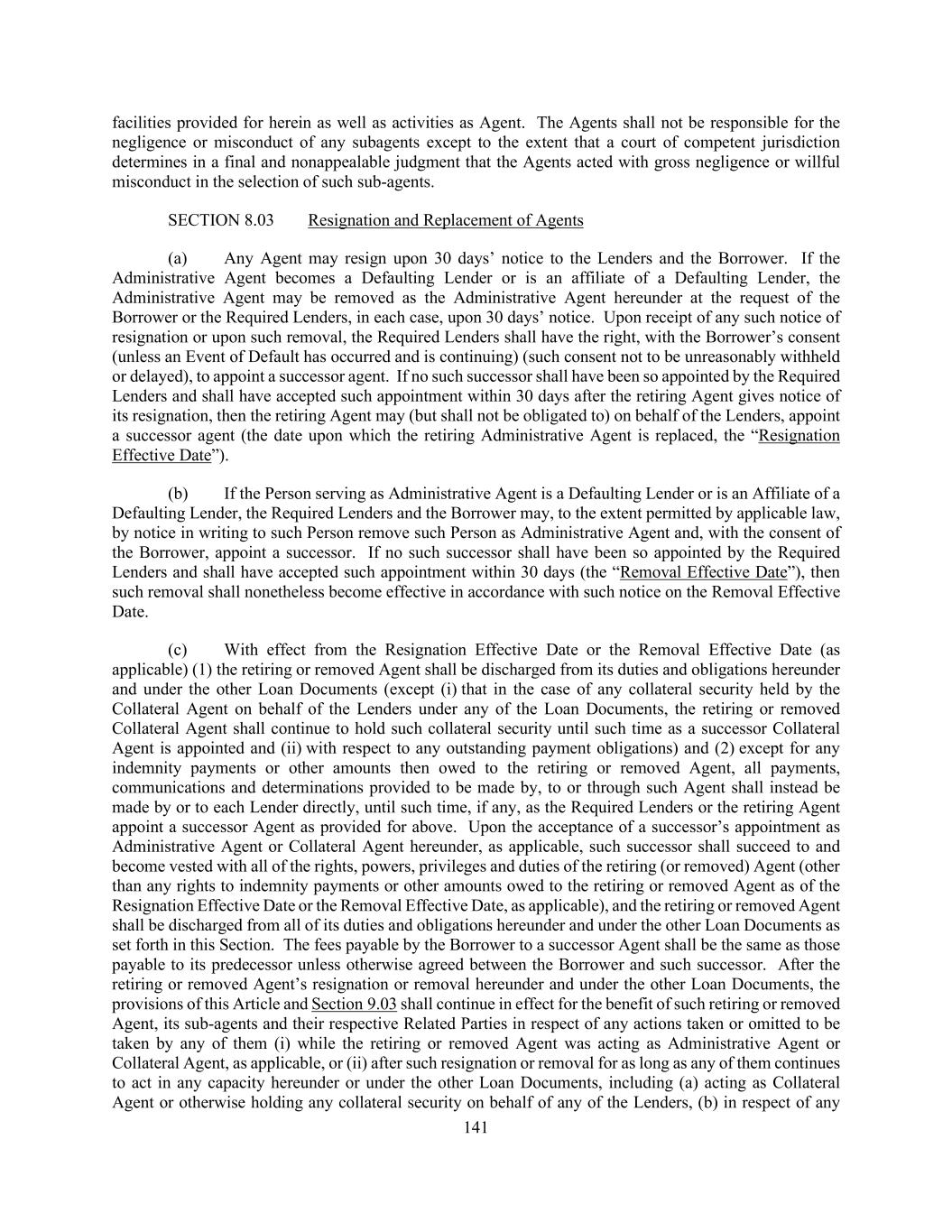 141 facilities provided for herein as well as activities as Agent. The Agents shall not be responsible for the negligence or misconduct of any subagents except to the extent that a court of competent jurisdiction determines in a final and nonappealable judgment that the Agents acted with gross negligence or willful misconduct in the selection of such sub-agents. SECTION 8.03 Resignation and Replacement of Agents (a) Any Agent may resign upon 30 days’ notice to the Lenders and the Borrower. If the Administrative Agent becomes a Defaulting Lender or is an affiliate of a Defaulting Lender, the Administrative Agent may be removed as the Administrative Agent hereunder at the request of the Borrower or the Required Lenders, in each case, upon 30 days’ notice. Upon receipt of any such notice of resignation or upon such removal, the Required Lenders shall have the right, with the Borrower’s consent (unless an Event of Default has occurred and is continuing) (such consent not to be unreasonably withheld or delayed), to appoint a successor agent. If no such successor shall have been so appointed by the Required Lenders and shall have accepted such appointment within 30 days after the retiring Agent gives notice of its resignation, then the retiring Agent may (but shall not be obligated to) on behalf of the Lenders, appoint a successor agent (the date upon which the retiring Administrative Agent is replaced, the “Resignation Effective Date”). (b) If the Person serving as Administrative Agent is a Defaulting Lender or is an Affiliate of a Defaulting Lender, the Required Lenders and the Borrower may, to the extent permitted by applicable law, by notice in writing to such Person remove such Person as Administrative Agent and, with the consent of the Borrower, appoint a successor. If no such successor shall have been so appointed by the Required Lenders and shall have accepted such appointment within 30 days (the “Removal Effective Date”), then such removal shall nonetheless become effective in accordance with such notice on the Removal Effective Date. (c) With effect from the Resignation Effective Date or the Removal Effective Date (as applicable) (1) the retiring or removed Agent shall be discharged from its duties and obligations hereunder and under the other Loan Documents (except (i) that in the case of any collateral security held by the Collateral Agent on behalf of the Lenders under any of the Loan Documents, the retiring or removed Collateral Agent shall continue to hold such collateral security until such time as a successor Collateral Agent is appointed and (ii) with respect to any outstanding payment obligations) and (2) except for any indemnity payments or other amounts then owed to the retiring or removed Agent, all payments, communications and determinations provided to be made by, to or through such Agent shall instead be made by or to each Lender directly, until such time, if any, as the Required Lenders or the retiring Agent appoint a successor Agent as provided for above. Upon the acceptance of a successor’s appointment as Administrative Agent or Collateral Agent hereunder, as applicable, such successor shall succeed to and become vested with all of the rights, powers, privileges and duties of the retiring (or removed) Agent (other than any rights to indemnity payments or other amounts owed to the retiring or removed Agent as of the Resignation Effective Date or the Removal Effective Date, as applicable), and the retiring or removed Agent shall be discharged from all of its duties and obligations hereunder and under the other Loan Documents as set forth in this Section. The fees payable by the Borrower to a successor Agent shall be the same as those payable to its predecessor unless otherwise agreed between the Borrower and such successor. After the retiring or removed Agent’s resignation or removal hereunder and under the other Loan Documents, the provisions of this Article and Section 9.03 shall continue in effect for the benefit of such retiring or removed Agent, its sub-agents and their respective Related Parties in respect of any actions taken or omitted to be taken by any of them (i) while the retiring or removed Agent was acting as Administrative Agent or Collateral Agent, as applicable, or (ii) after such resignation or removal for as long as any of them continues to act in any capacity hereunder or under the other Loan Documents, including (a) acting as Collateral Agent or otherwise holding any collateral security on behalf of any of the Lenders, (b) in respect of any