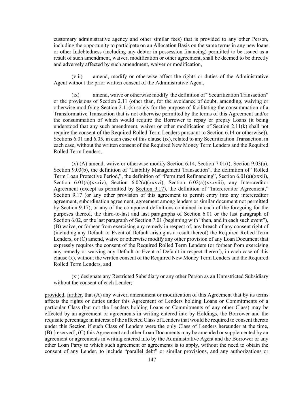 147 customary administrative agency and other similar fees) that is provided to any other Person, including the opportunity to participate on an Allocation Basis on the same terms in any new loans or other Indebtedness (including any debtor in possession financing) permitted to be issued as a result of such amendment, waiver, modification or other agreement, shall be deemed to be directly and adversely affected by such amendment, waiver or modification, (viii) amend, modify or otherwise affect the rights or duties of the Administrative Agent without the prior written consent of the Administrative Agent, (ix) amend, waive or otherwise modify the definition of “Securitization Transaction” or the provisions of Section 2.11 (other than, for the avoidance of doubt, amending, waiving or otherwise modifying Section 2.11(k) solely for the purpose of facilitating the consummation of a Transformative Transaction that is not otherwise permitted by the terms of this Agreement and/or the consummation of which would require the Borrower to repay or prepay Loans (it being understood that any such amendment, waiver or other modification of Section 2.11(k) shall not require the consent of the Required Rolled Term Lenders pursuant to Section 6.14 or otherwise)), Sections 6.01 and 6.05, in each case of this clause (ix), related to any Securitization Transaction, in each case, without the written consent of the Required New Money Term Lenders and the Required Rolled Term Lenders, (x) (A) amend, waive or otherwise modify Section 6.14, Section 7.01(t), Section 9.03(a), Section 9.03(b), the definition of “Liability Management Transaction”, the definition of “Rolled Term Loan Protective Period,”, the definition of “Permitted Refinancing”, Section 6.01(a)(xxxii), Section 6.01(a)(xxxiv), Section 6.02(a)(xxxvi), Section 6.02(a)(xxxviii), any Intercreditor Agreement (except as permitted by Section 9.17), the definition of “Intercreditor Agreement,” Section 9.17 (or any other provision of this agreement to permit entry into any intercreditor agreement, subordination agreement, agreement among lenders or similar document not permitted by Section 9.17), or any of the component definitions contained in each of the foregoing for the purposes thereof, the third-to-last and last paragraphs of Section 6.01 or the last paragraph of Section 6.02, or the last paragraph of Section 7.01 (beginning with “then, and in each such event”), (B) waive, or forbear from exercising any remedy in respect of, any breach of any consent right of (including any Default or Event of Default arising as a result thereof) the Required Rolled Term Lenders, or (C) amend, waive or otherwise modify any other provision of any Loan Document that expressly requires the consent of the Required Rolled Term Lenders (or forbear from exercising any remedy or waiving any Default or Event of Default in respect thereof), in each case of this clause (x), without the written consent of the Required New Money Term Lenders and the Required Rolled Term Lenders, and (xi) designate any Restricted Subsidiary or any other Person as an Unrestricted Subsidiary without the consent of each Lender; provided, further, that (A) any waiver, amendment or modification of this Agreement that by its terms affects the rights or duties under this Agreement of Lenders holding Loans or Commitments of a particular Class (but not the Lenders holding Loans or Commitments of any other Class) may be effected by an agreement or agreements in writing entered into by Holdings, the Borrower and the requisite percentage in interest of the affected Class of Lenders that would be required to consent thereto under this Section if such Class of Lenders were the only Class of Lenders hereunder at the time, (B) [reserved], (C) this Agreement and other Loan Documents may be amended or supplemented by an agreement or agreements in writing entered into by the Administrative Agent and the Borrower or any other Loan Party to which such agreement or agreements is to apply, without the need to obtain the consent of any Lender, to include “parallel debt” or similar provisions, and any authorizations or