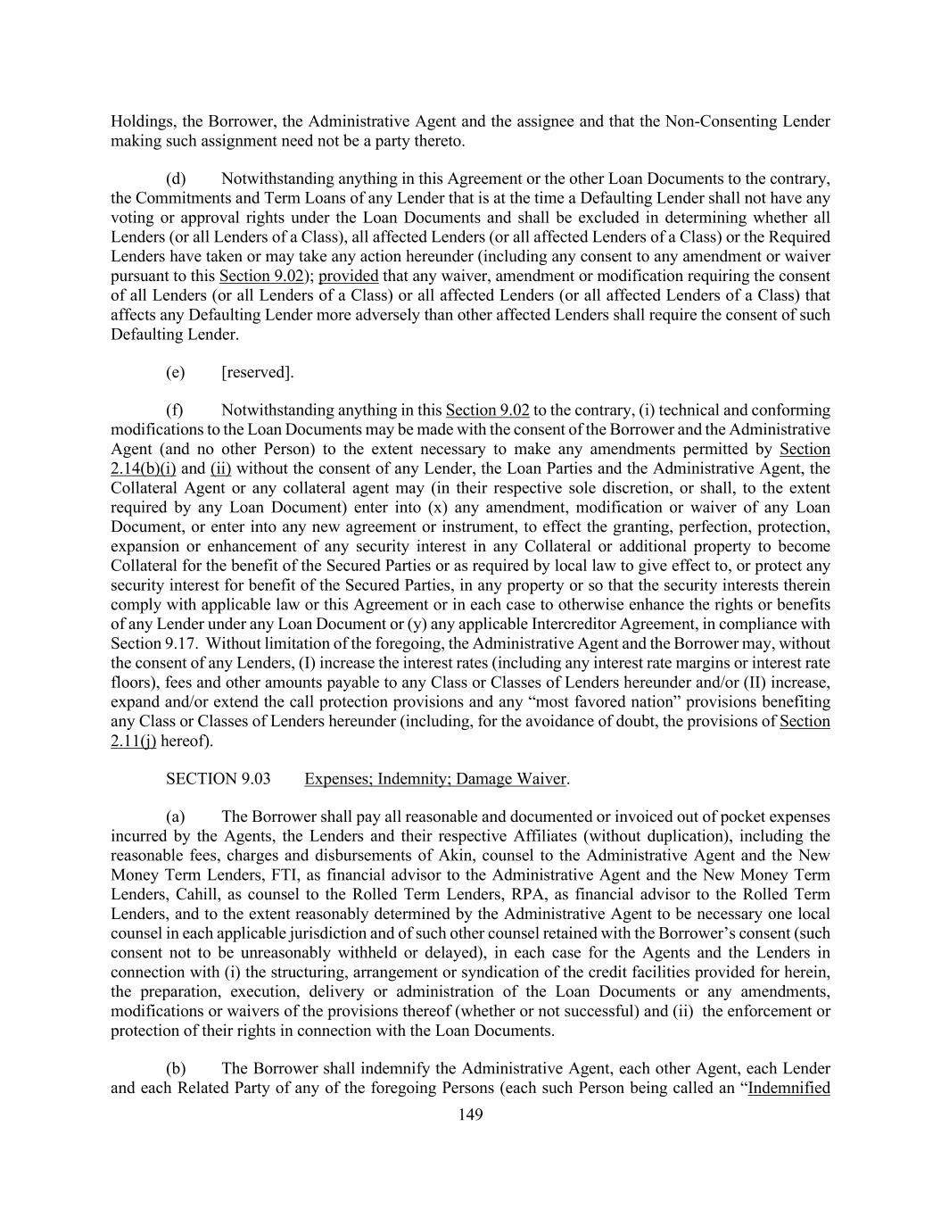 149 Holdings, the Borrower, the Administrative Agent and the assignee and that the Non-Consenting Lender making such assignment need not be a party thereto. (d) Notwithstanding anything in this Agreement or the other Loan Documents to the contrary, the Commitments and Term Loans of any Lender that is at the time a Defaulting Lender shall not have any voting or approval rights under the Loan Documents and shall be excluded in determining whether all Lenders (or all Lenders of a Class), all affected Lenders (or all affected Lenders of a Class) or the Required Lenders have taken or may take any action hereunder (including any consent to any amendment or waiver pursuant to this Section 9.02); provided that any waiver, amendment or modification requiring the consent of all Lenders (or all Lenders of a Class) or all affected Lenders (or all affected Lenders of a Class) that affects any Defaulting Lender more adversely than other affected Lenders shall require the consent of such Defaulting Lender. (e) [reserved]. (f) Notwithstanding anything in this Section 9.02 to the contrary, (i) technical and conforming modifications to the Loan Documents may be made with the consent of the Borrower and the Administrative Agent (and no other Person) to the extent necessary to make any amendments permitted by Section 2.14(b)(i) and (ii) without the consent of any Lender, the Loan Parties and the Administrative Agent, the Collateral Agent or any collateral agent may (in their respective sole discretion, or shall, to the extent required by any Loan Document) enter into (x) any amendment, modification or waiver of any Loan Document, or enter into any new agreement or instrument, to effect the granting, perfection, protection, expansion or enhancement of any security interest in any Collateral or additional property to become Collateral for the benefit of the Secured Parties or as required by local law to give effect to, or protect any security interest for benefit of the Secured Parties, in any property or so that the security interests therein comply with applicable law or this Agreement or in each case to otherwise enhance the rights or benefits of any Lender under any Loan Document or (y) any applicable Intercreditor Agreement, in compliance with Section 9.17. Without limitation of the foregoing, the Administrative Agent and the Borrower may, without the consent of any Lenders, (I) increase the interest rates (including any interest rate margins or interest rate floors), fees and other amounts payable to any Class or Classes of Lenders hereunder and/or (II) increase, expand and/or extend the call protection provisions and any “most favored nation” provisions benefiting any Class or Classes of Lenders hereunder (including, for the avoidance of doubt, the provisions of Section 2.11(j) hereof). SECTION 9.03 Expenses; Indemnity; Damage Waiver. (a) The Borrower shall pay all reasonable and documented or invoiced out of pocket expenses incurred by the Agents, the Lenders and their respective Affiliates (without duplication), including the reasonable fees, charges and disbursements of Akin, counsel to the Administrative Agent and the New Money Term Lenders, FTI, as financial advisor to the Administrative Agent and the New Money Term Lenders, Cahill, as counsel to the Rolled Term Lenders, RPA, as financial advisor to the Rolled Term Lenders, and to the extent reasonably determined by the Administrative Agent to be necessary one local counsel in each applicable jurisdiction and of such other counsel retained with the Borrower’s consent (such consent not to be unreasonably withheld or delayed), in each case for the Agents and the Lenders in connection with (i) the structuring, arrangement or syndication of the credit facilities provided for herein, the preparation, execution, delivery or administration of the Loan Documents or any amendments, modifications or waivers of the provisions thereof (whether or not successful) and (ii) the enforcement or protection of their rights in connection with the Loan Documents. (b) The Borrower shall indemnify the Administrative Agent, each other Agent, each Lender and each Related Party of any of the foregoing Persons (each such Person being called an “Indemnified
