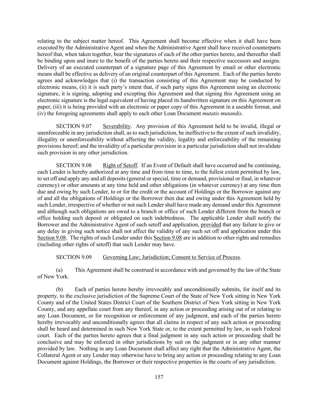 157 relating to the subject matter hereof. This Agreement shall become effective when it shall have been executed by the Administrative Agent and when the Administrative Agent shall have received counterparts hereof that, when taken together, bear the signatures of each of the other parties hereto, and thereafter shall be binding upon and inure to the benefit of the parties hereto and their respective successors and assigns. Delivery of an executed counterpart of a signature page of this Agreement by email or other electronic means shall be effective as delivery of an original counterpart of this Agreement. Each of the parties hereto agrees and acknowledges that (i) the transaction consisting of this Agreement may be conducted by electronic means, (ii) it is such party’s intent that, if such party signs this Agreement using an electronic signature, it is signing, adopting and excepting this Agreement and that signing this Agreement using an electronic signature is the legal equivalent of having placed its handwritten signature on this Agreement on paper, (iii) it is being provided with an electronic or paper copy of this Agreement in a useable format, and (iv) the foregoing agreements shall apply to each other Loan Document mutatis mutandis. SECTION 9.07 Severability. Any provision of this Agreement held to be invalid, illegal or unenforceable in any jurisdiction shall, as to such jurisdiction, be ineffective to the extent of such invalidity, illegality or unenforceability without affecting the validity, legality and enforceability of the remaining provisions hereof; and the invalidity of a particular provision in a particular jurisdiction shall not invalidate such provision in any other jurisdiction. SECTION 9.08 Right of Setoff. If an Event of Default shall have occurred and be continuing, each Lender is hereby authorized at any time and from time to time, to the fullest extent permitted by law, to set off and apply any and all deposits (general or special, time or demand, provisional or final, in whatever currency) or other amounts at any time held and other obligations (in whatever currency) at any time then due and owing by such Lender, to or for the credit or the account of Holdings or the Borrower against any of and all the obligations of Holdings or the Borrower then due and owing under this Agreement held by such Lender, irrespective of whether or not such Lender shall have made any demand under this Agreement and although such obligations are owed to a branch or office of such Lender different from the branch or office holding such deposit or obligated on such indebtedness. The applicable Lender shall notify the Borrower and the Administrative Agent of such setoff and application, provided that any failure to give or any delay in giving such notice shall not affect the validity of any such set off and application under this Section 9.08. The rights of each Lender under this Section 9.08 are in addition to other rights and remedies (including other rights of setoff) that such Lender may have. SECTION 9.09 Governing Law; Jurisdiction; Consent to Service of Process. (a) This Agreement shall be construed in accordance with and governed by the law of the State of New York. (b) Each of parties hereto hereby irrevocably and unconditionally submits, for itself and its property, to the exclusive jurisdiction of the Supreme Court of the State of New York sitting in New York County and of the United States District Court of the Southern District of New York sitting in New York County, and any appellate court from any thereof, in any action or proceeding arising out of or relating to any Loan Document, or for recognition or enforcement of any judgment, and each of the parties hereto hereby irrevocably and unconditionally agrees that all claims in respect of any such action or proceeding shall be heard and determined in such New York State or, to the extent permitted by law, in such Federal court. Each of the parties hereto agrees that a final judgment in any such action or proceeding shall be conclusive and may be enforced in other jurisdictions by suit on the judgment or in any other manner provided by law. Nothing in any Loan Document shall affect any right that the Administrative Agent, the Collateral Agent or any Lender may otherwise have to bring any action or proceeding relating to any Loan Document against Holdings, the Borrower or their respective properties in the courts of any jurisdiction.