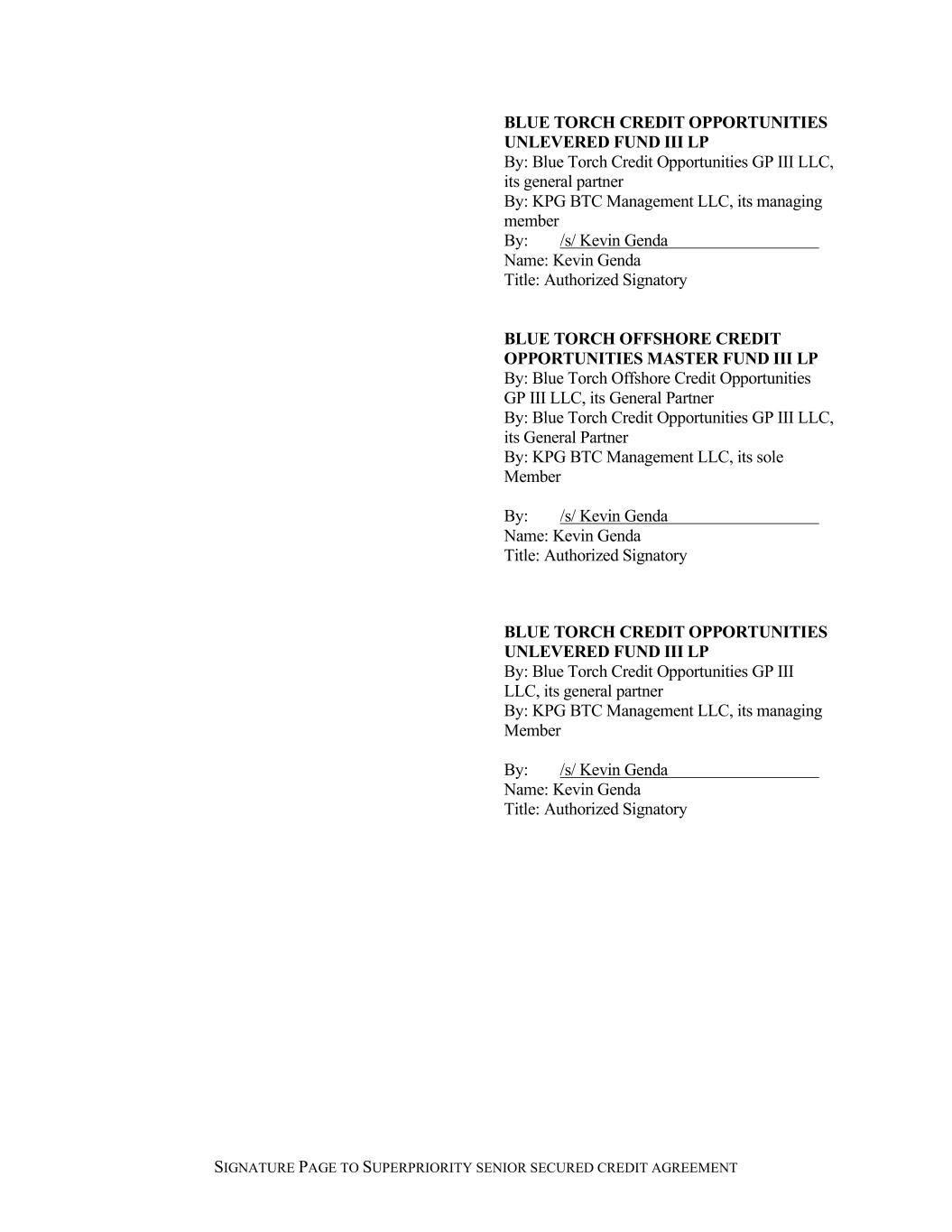 SIGNATURE PAGE TO SUPERPRIORITY SENIOR SECURED CREDIT AGREEMENT BLUE TORCH CREDIT OPPORTUNITIES UNLEVERED FUND III LP By: Blue Torch Credit Opportunities GP III LLC, its general partner By: KPG BTC Management LLC, its managing member By: /s/ Kevin Genda Name: Kevin Genda Title: Authorized Signatory BLUE TORCH OFFSHORE CREDIT OPPORTUNITIES MASTER FUND III LP By: Blue Torch Offshore Credit Opportunities GP III LLC, its General Partner By: Blue Torch Credit Opportunities GP III LLC, its General Partner By: KPG BTC Management LLC, its sole Member By: /s/ Kevin Genda Name: Kevin Genda Title: Authorized Signatory BLUE TORCH CREDIT OPPORTUNITIES UNLEVERED FUND III LP By: Blue Torch Credit Opportunities GP III LLC, its general partner By: KPG BTC Management LLC, its managing Member By: /s/ Kevin Genda Name: Kevin Genda Title: Authorized Signatory