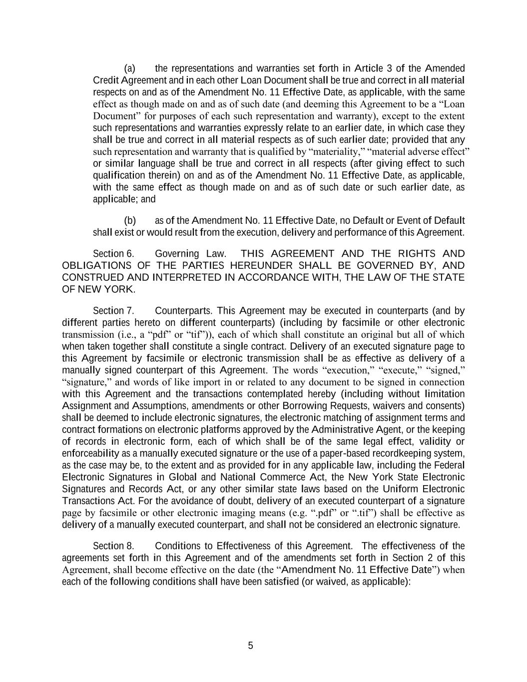 5 (a) the representations and warranties set forth in Article 3 of the Amended Credit Agreement and in each other Loan Document shall be true and correct in all material respects on and as of the Amendment No. 11 Effective Date, as applicable, with the same effect as though made on and as of such date (and deeming this Agreement to be a “Loan Document” for purposes of each such representation and warranty), except to the extent such representations and warranties expressly relate to an earlier date, in which case they shall be true and correct in all material respects as of such earlier date; provided that any such representation and warranty that is qualified by “materiality,” “material adverse effect” or similar language shall be true and correct in all respects (after giving effect to such qualification therein) on and as of the Amendment No. 11 Effective Date, as applicable, with the same effect as though made on and as of such date or such earlier date, as applicable; and (b) as of the Amendment No. 11 Effective Date, no Default or Event of Default shall exist or would result from the execution, delivery and performance of this Agreement. Section 6. Governing Law. THIS AGREEMENT AND THE RIGHTS AND OBLIGATIONS OF THE PARTIES HEREUNDER SHALL BE GOVERNED BY, AND CONSTRUED AND INTERPRETED IN ACCORDANCE WITH, THE LAW OF THE STATE OF NEW YORK. Section 7. Counterparts. This Agreement may be executed in counterparts (and by different parties hereto on different counterparts) (including by facsimile or other electronic transmission (i.e., a “pdf” or “tif”)), each of which shall constitute an original but all of which when taken together shall constitute a single contract. Delivery of an executed signature page to this Agreement by facsimile or electronic transmission shall be as effective as delivery of a manually signed counterpart of this Agreement. The words “execution,” “execute,” “signed,” “signature,” and words of like import in or related to any document to be signed in connection with this Agreement and the transactions contemplated hereby (including without limitation Assignment and Assumptions, amendments or other Borrowing Requests, waivers and consents) shall be deemed to include electronic signatures, the electronic matching of assignment terms and contract formations on electronic platforms approved by the Administrative Agent, or the keeping of records in electronic form, each of which shall be of the same legal effect, validity or enforceability as a manually executed signature or the use of a paper-based recordkeeping system, as the case may be, to the extent and as provided for in any applicable law, including the Federal Electronic Signatures in Global and National Commerce Act, the New York State Electronic Signatures and Records Act, or any other similar state laws based on the Uniform Electronic Transactions Act. For the avoidance of doubt, delivery of an executed counterpart of a signature page by facsimile or other electronic imaging means (e.g. “.pdf” or “.tif”) shall be effective as delivery of a manually executed counterpart, and shall not be considered an electronic signature. Section 8. Conditions to Effectiveness of this Agreement. The effectiveness of the agreements set forth in this Agreement and of the amendments set forth in Section 2 of this Agreement, shall become effective on the date (the “Amendment No. 11 Effective Date”) when each of the following conditions shall have been satisfied (or waived, as applicable):