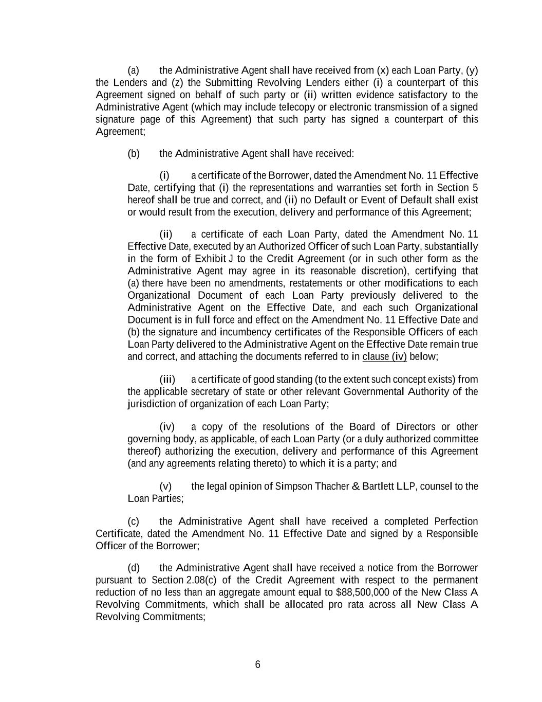 6 (a) the Administrative Agent shall have received from (x) each Loan Party, (y) the Lenders and (z) the Submitting Revolving Lenders either (i) a counterpart of this Agreement signed on behalf of such party or (ii) written evidence satisfactory to the Administrative Agent (which may include telecopy or electronic transmission of a signed signature page of this Agreement) that such party has signed a counterpart of this Agreement; (b) the Administrative Agent shall have received: (i) a certificate of the Borrower, dated the Amendment No. 11 Effective Date, certifying that (i) the representations and warranties set forth in Section 5 hereof shall be true and correct, and (ii) no Default or Event of Default shall exist or would result from the execution, delivery and performance of this Agreement; (ii) a certificate of each Loan Party, dated the Amendment No. 11 Effective Date, executed by an Authorized Officer of such Loan Party, substantially in the form of Exhibit J to the Credit Agreement (or in such other form as the Administrative Agent may agree in its reasonable discretion), certifying that (a) there have been no amendments, restatements or other modifications to each Organizational Document of each Loan Party previously delivered to the Administrative Agent on the Effective Date, and each such Organizational Document is in full force and effect on the Amendment No. 11 Effective Date and (b) the signature and incumbency certificates of the Responsible Officers of each Loan Party delivered to the Administrative Agent on the Effective Date remain true and correct, and attaching the documents referred to in clause (iv) below; (iii) a certificate of good standing (to the extent such concept exists) from the applicable secretary of state or other relevant Governmental Authority of the jurisdiction of organization of each Loan Party; (iv) a copy of the resolutions of the Board of Directors or other governing body, as applicable, of each Loan Party (or a duly authorized committee thereof) authorizing the execution, delivery and performance of this Agreement (and any agreements relating thereto) to which it is a party; and (v) the legal opinion of Simpson Thacher & Bartlett LLP, counsel to the Loan Parties; (c) the Administrative Agent shall have received a completed Perfection Certificate, dated the Amendment No. 11 Effective Date and signed by a Responsible Officer of the Borrower; (d) the Administrative Agent shall have received a notice from the Borrower pursuant to Section 2.08(c) of the Credit Agreement with respect to the permanent reduction of no less than an aggregate amount equal to $88,500,000 of the New Class A Revolving Commitments, which shall be allocated pro rata across all New Class A Revolving Commitments;