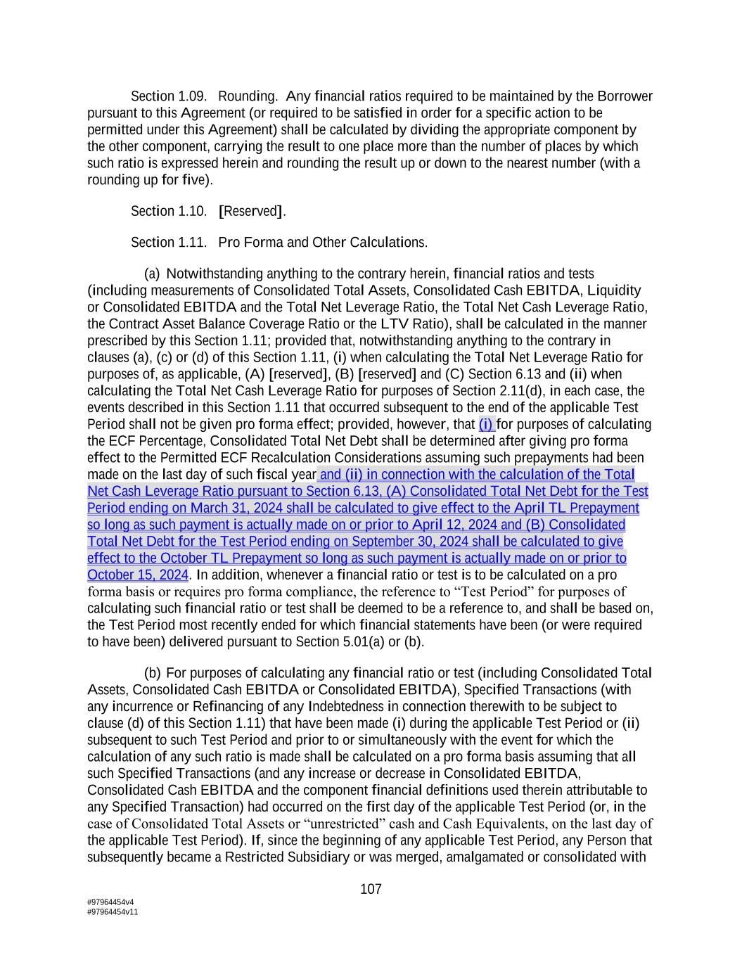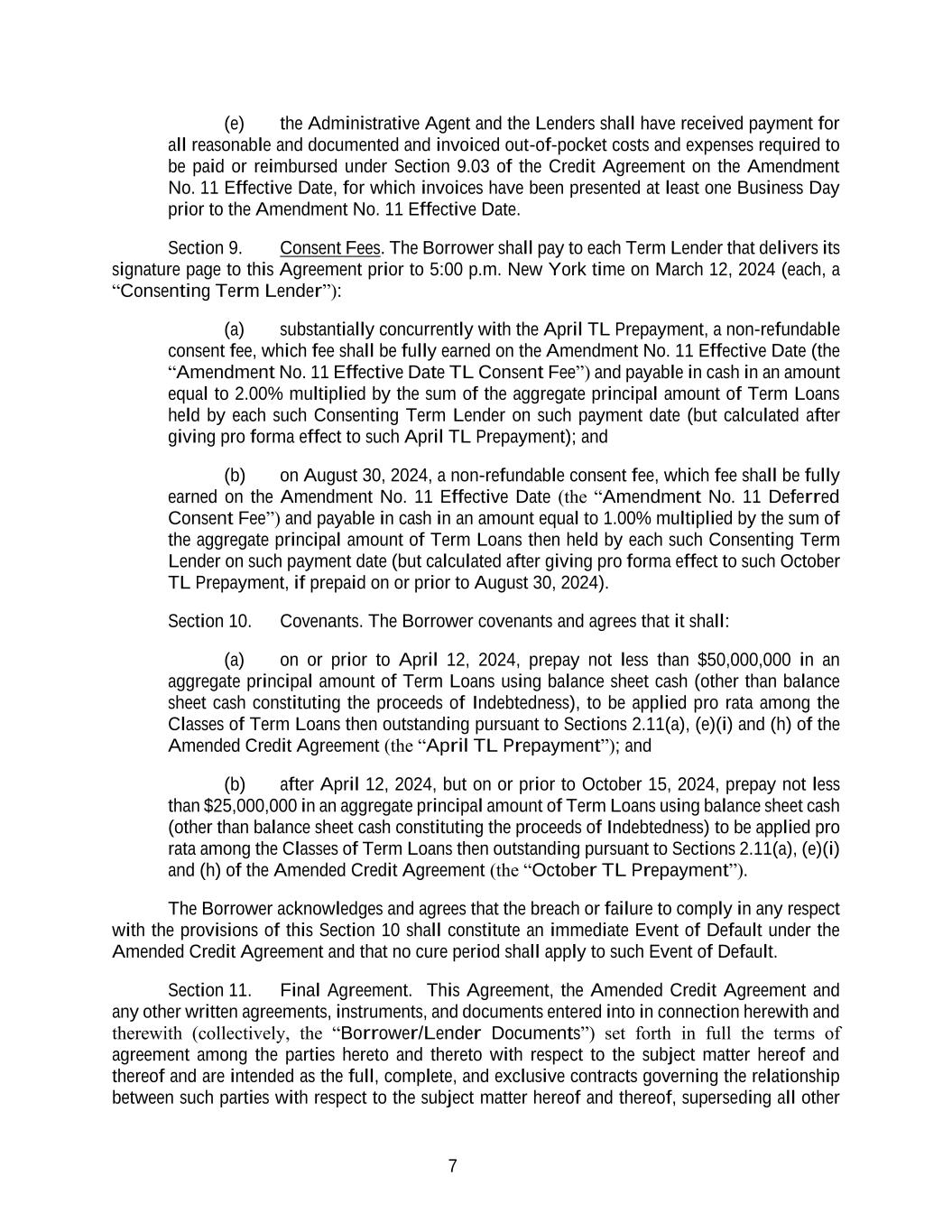 7 (e) the Administrative Agent and the Lenders shall have received payment for all reasonable and documented and invoiced out-of-pocket costs and expenses required to be paid or reimbursed under Section 9.03 of the Credit Agreement on the Amendment No. 11 Effective Date, for which invoices have been presented at least one Business Day prior to the Amendment No. 11 Effective Date. Section 9. Consent Fees. The Borrower shall pay to each Term Lender that delivers its signature page to this Agreement prior to 5:00 p.m. New York time on March 12, 2024 (each, a “Consenting Term Lender”): (a) substantially concurrently with the April TL Prepayment, a non-refundable consent fee, which fee shall be fully earned on the Amendment No. 11 Effective Date (the “Amendment No. 11 Effective Date TL Consent Fee”) and payable in cash in an amount equal to 2.00% multiplied by the sum of the aggregate principal amount of Term Loans held by each such Consenting Term Lender on such payment date (but calculated after giving pro forma effect to such April TL Prepayment); and (b) on August 30, 2024, a non-refundable consent fee, which fee shall be fully earned on the Amendment No. 11 Effective Date (the “Amendment No. 11 Deferred Consent Fee”) and payable in cash in an amount equal to 1.00% multiplied by the sum of the aggregate principal amount of Term Loans then held by each such Consenting Term Lender on such payment date (but calculated after giving pro forma effect to such October TL Prepayment, if prepaid on or prior to August 30, 2024). Section 10. Covenants. The Borrower covenants and agrees that it shall: (a) on or prior to April 12, 2024, prepay not less than $50,000,000 in an aggregate principal amount of Term Loans using balance sheet cash (other than balance sheet cash constituting the proceeds of Indebtedness), to be applied pro rata among the Classes of Term Loans then outstanding pursuant to Sections 2.11(a), (e)(i) and (h) of the Amended Credit Agreement (the “April TL Prepayment”); and (b) after April 12, 2024, but on or prior to October 15, 2024, prepay not less than $25,000,000 in an aggregate principal amount of Term Loans using balance sheet cash (other than balance sheet cash constituting the proceeds of Indebtedness) to be applied pro rata among the Classes of Term Loans then outstanding pursuant to Sections 2.11(a), (e)(i) and (h) of the Amended Credit Agreement (the “October TL Prepayment”). The Borrower acknowledges and agrees that the breach or failure to comply in any respect with the provisions of this Section 10 shall constitute an immediate Event of Default under the Amended Credit Agreement and that no cure period shall apply to such Event of Default. Section 11. Final Agreement. This Agreement, the Amended Credit Agreement and any other written agreements, instruments, and documents entered into in connection herewith and therewith (collectively, the “Borrower/Lender Documents”) set forth in full the terms of agreement among the parties hereto and thereto with respect to the subject matter hereof and thereof and are intended as the full, complete, and exclusive contracts governing the relationship between such parties with respect to the subject matter hereof and thereof, superseding all other