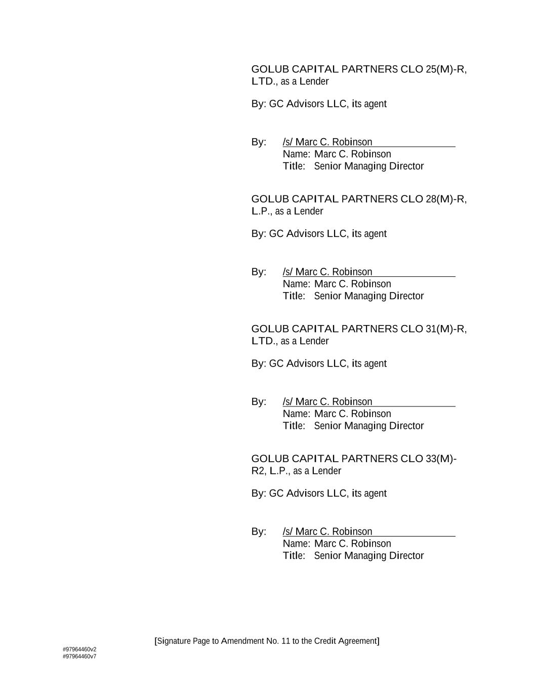 [Signature Page to Amendment No. 11 to the Credit Agreement] #97964460v2 #97964460v7 GOLUB CAPITAL PARTNERS CLO 25(M)-R, LTD., as a Lender By: GC Advisors LLC, its agent By: /s/ Marc C. Robinson Name: Marc C. Robinson Title: Senior Managing Director GOLUB CAPITAL PARTNERS CLO 28(M)-R, L.P., as a Lender By: GC Advisors LLC, its agent By: /s/ Marc C. Robinson Name: Marc C. Robinson Title: Senior Managing Director GOLUB CAPITAL PARTNERS CLO 31(M)-R, LTD., as a Lender By: GC Advisors LLC, its agent By: /s/ Marc C. Robinson Name: Marc C. Robinson Title: Senior Managing Director GOLUB CAPITAL PARTNERS CLO 33(M)- R2, L.P., as a Lender By: GC Advisors LLC, its agent By: /s/ Marc C. Robinson Name: Marc C. Robinson Title: Senior Managing Director