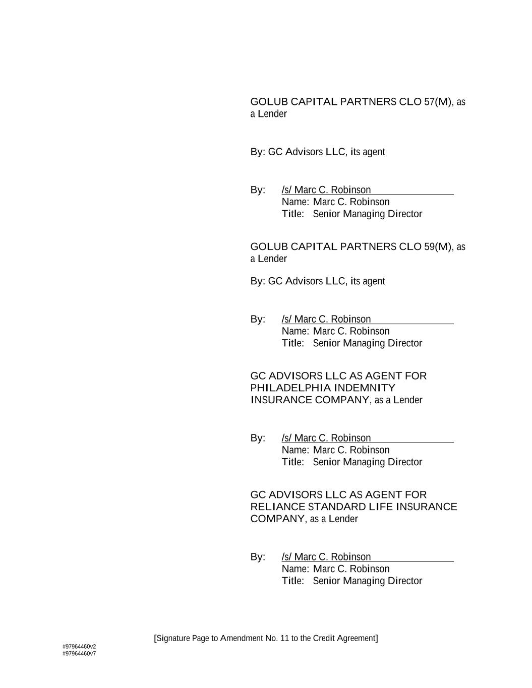 [Signature Page to Amendment No. 11 to the Credit Agreement] #97964460v2 #97964460v7 GOLUB CAPITAL PARTNERS CLO 57(M), as a Lender By: GC Advisors LLC, its agent By: /s/ Marc C. Robinson Name: Marc C. Robinson Title: Senior Managing Director GOLUB CAPITAL PARTNERS CLO 59(M), as a Lender By: GC Advisors LLC, its agent By: /s/ Marc C. Robinson Name: Marc C. Robinson Title: Senior Managing Director GC ADVISORS LLC AS AGENT FOR PHILADELPHIA INDEMNITY INSURANCE COMPANY, as a Lender By: /s/ Marc C. Robinson Name: Marc C. Robinson Title: Senior Managing Director GC ADVISORS LLC AS AGENT FOR RELIANCE STANDARD LIFE INSURANCE COMPANY, as a Lender By: /s/ Marc C. Robinson Name: Marc C. Robinson Title: Senior Managing Director