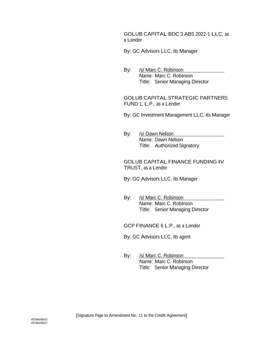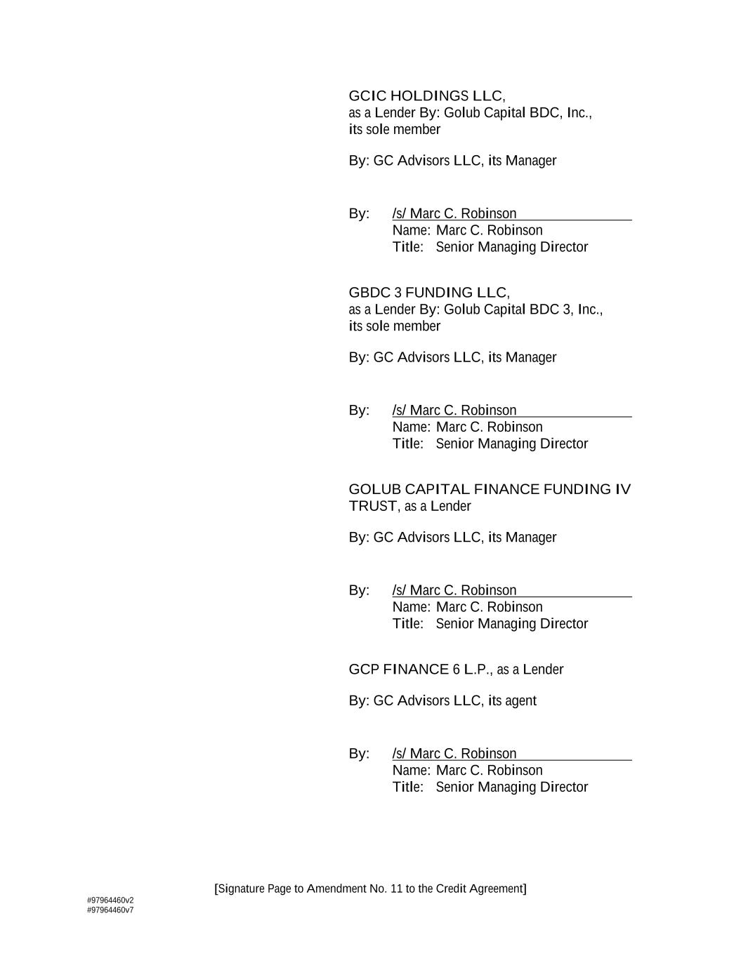 [Signature Page to Amendment No. 11 to the Credit Agreement] #97964460v2 #97964460v7 GCIC HOLDINGS LLC, as a Lender By: Golub Capital BDC, Inc., its sole member By: GC Advisors LLC, its Manager By: /s/ Marc C. Robinson Name: Marc C. Robinson Title: Senior Managing Director GBDC 3 FUNDING LLC, as a Lender By: Golub Capital BDC 3, Inc., its sole member By: GC Advisors LLC, its Manager By: /s/ Marc C. Robinson Name: Marc C. Robinson Title: Senior Managing Director GOLUB CAPITAL FINANCE FUNDING IV TRUST, as a Lender By: GC Advisors LLC, its Manager By: /s/ Marc C. Robinson Name: Marc C. Robinson Title: Senior Managing Director GCP FINANCE 6 L.P., as a Lender By: GC Advisors LLC, its agent By: /s/ Marc C. Robinson Name: Marc C. Robinson Title: Senior Managing Director