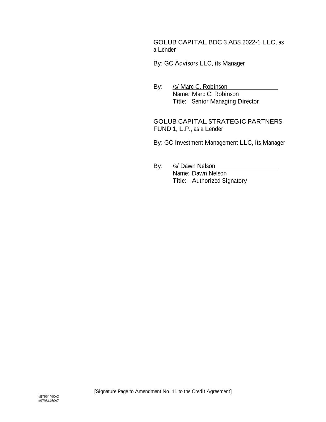 [Signature Page to Amendment No. 11 to the Credit Agreement] #97964460v2 #97964460v7 GOLUB CAPITAL BDC 3 ABS 2022-1 LLC, as a Lender By: GC Advisors LLC, its Manager By: /s/ Marc C. Robinson Name: Marc C. Robinson Title: Senior Managing Director GOLUB CAPITAL STRATEGIC PARTNERS FUND 1, L.P., as a Lender By: GC Investment Management LLC, its Manager By: /s/ Dawn Nelson Name: Dawn Nelson Title: Authorized Signatory