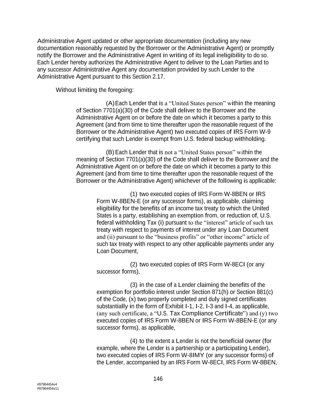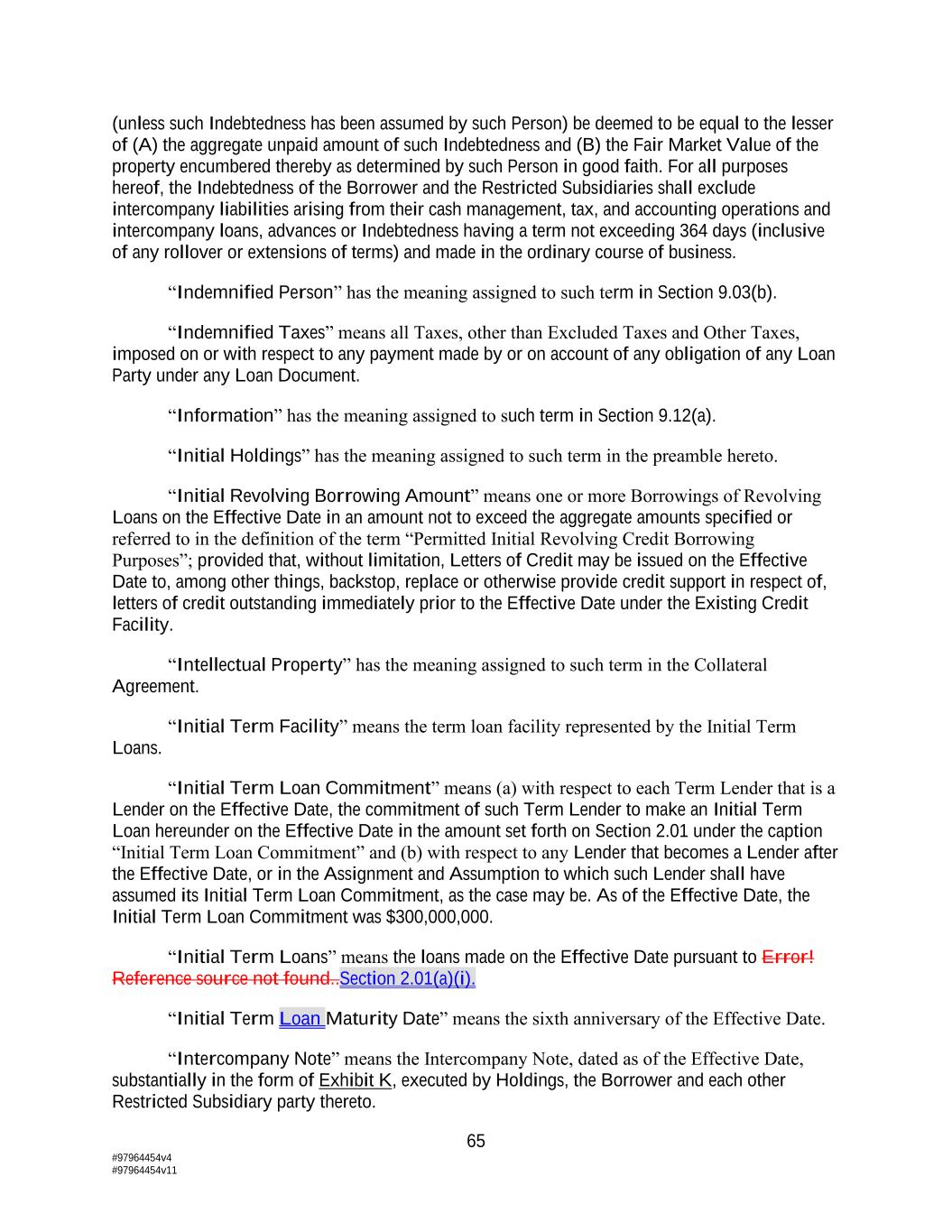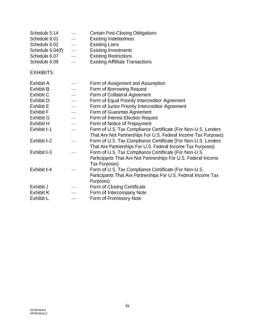 iv #97964454v4 #97964454v11 Schedule 5.14 — Certain Post-Closing Obligations Schedule 6.01 — Existing Indebtedness Schedule 6.02 — Existing Liens Schedule 6.04(f) — Existing Investments Schedule 6.07 — Existing Restrictions Schedule 6.09 — Existing Affiliate Transactions EXHIBITS: Exhibit A — Form of Assignment and Assumption Exhibit B — Form of Borrowing Request Exhibit C — Form of Collateral Agreement Exhibit D — Form of Equal Priority Intercreditor Agreement Exhibit E — Form of Junior Priority Intercreditor Agreement Exhibit F — Form of Guarantee Agreement Exhibit G — Form of Interest Election Request Exhibit H — Form of Notice of Prepayment Exhibit I-1 — Form of U.S. Tax Compliance Certificate (For Non-U.S. Lenders That Are Not Partnerships For U.S. Federal Income Tax Purposes) Exhibit I-2 — Form of U.S. Tax Compliance Certificate (For Non-U.S. Lenders That Are Partnerships For U.S. Federal Income Tax Purposes) Exhibit I-3 — Form of U.S. Tax Compliance Certificate (For Non-U.S. Participants That Are Not Partnerships For U.S. Federal Income Tax Purposes) Exhibit I-4 — Form of U.S. Tax Compliance Certificate (For Non-U.S. Participants That Are Partnerships For U.S. Federal Income Tax Purposes) Exhibit J — Form of Closing Certificate Exhibit K — Form of Intercompany Note Exhibit L — Form of Promissory Note