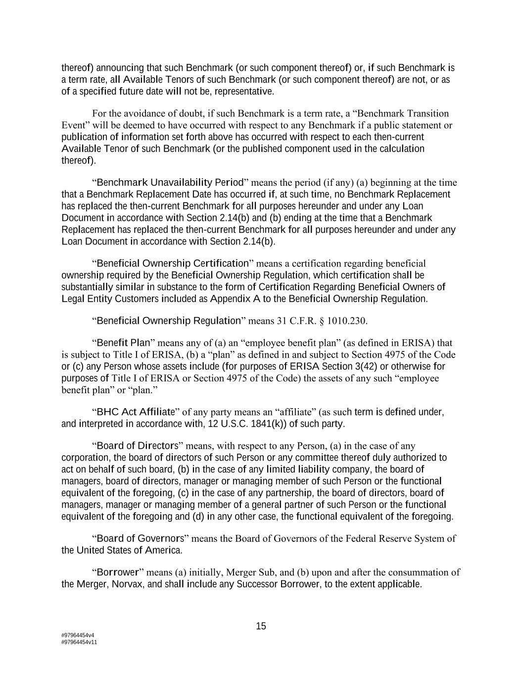 15 #97964454v4 #97964454v11 thereof) announcing that such Benchmark (or such component thereof) or, if such Benchmark is a term rate, all Available Tenors of such Benchmark (or such component thereof) are not, or as of a specified future date will not be, representative. For the avoidance of doubt, if such Benchmark is a term rate, a “Benchmark Transition Event” will be deemed to have occurred with respect to any Benchmark if a public statement or publication of information set forth above has occurred with respect to each then-current Available Tenor of such Benchmark (or the published component used in the calculation thereof). “Benchmark Unavailability Period” means the period (if any) (a) beginning at the time that a Benchmark Replacement Date has occurred if, at such time, no Benchmark Replacement has replaced the then-current Benchmark for all purposes hereunder and under any Loan Document in accordance with Section 2.14(b) and (b) ending at the time that a Benchmark Replacement has replaced the then-current Benchmark for all purposes hereunder and under any Loan Document in accordance with Section 2.14(b). “Beneficial Ownership Certification” means a certification regarding beneficial ownership required by the Beneficial Ownership Regulation, which certification shall be substantially similar in substance to the form of Certification Regarding Beneficial Owners of Legal Entity Customers included as Appendix A to the Beneficial Ownership Regulation. “Beneficial Ownership Regulation” means 31 C.F.R. § 1010.230. “Benefit Plan” means any of (a) an “employee benefit plan” (as defined in ERISA) that is subject to Title I of ERISA, (b) a “plan” as defined in and subject to Section 4975 of the Code or (c) any Person whose assets include (for purposes of ERISA Section 3(42) or otherwise for purposes of Title I of ERISA or Section 4975 of the Code) the assets of any such “employee benefit plan” or “plan.” “BHC Act Affiliate” of any party means an “affiliate” (as such term is defined under, and interpreted in accordance with, 12 U.S.C. 1841(k)) of such party. “Board of Directors” means, with respect to any Person, (a) in the case of any corporation, the board of directors of such Person or any committee thereof duly authorized to act on behalf of such board, (b) in the case of any limited liability company, the board of managers, board of directors, manager or managing member of such Person or the functional equivalent of the foregoing, (c) in the case of any partnership, the board of directors, board of managers, manager or managing member of a general partner of such Person or the functional equivalent of the foregoing and (d) in any other case, the functional equivalent of the foregoing. “Board of Governors” means the Board of Governors of the Federal Reserve System of the United States of America. “Borrower” means (a) initially, Merger Sub, and (b) upon and after the consummation of the Merger, Norvax, and shall include any Successor Borrower, to the extent applicable.