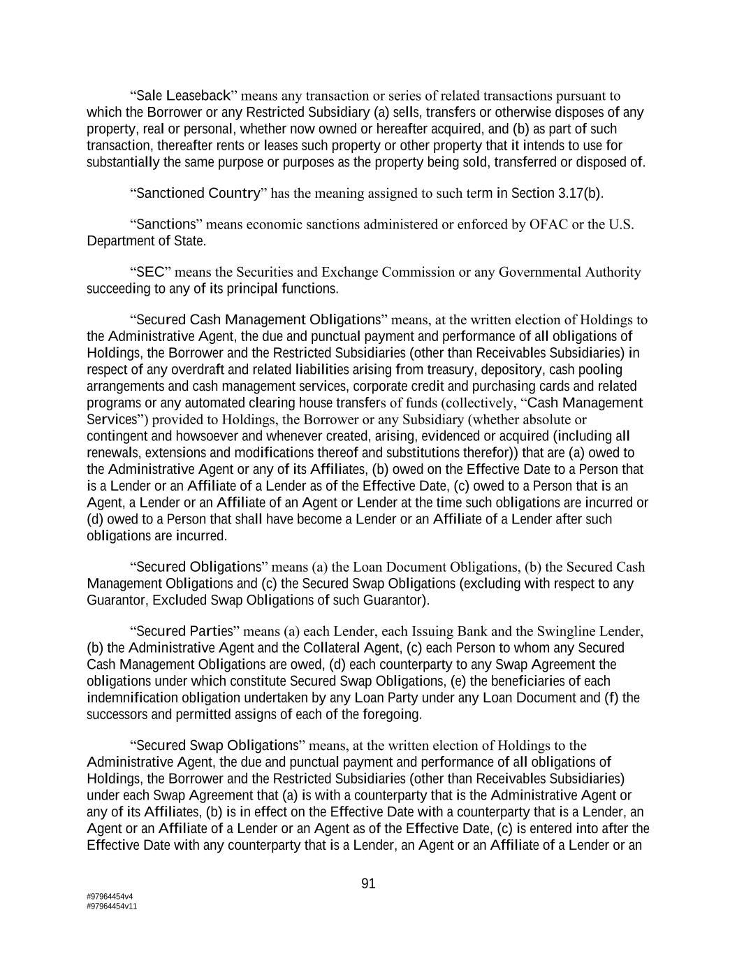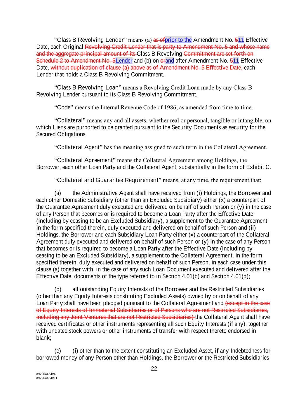 22 #97964454v4 #97964454v11 “Class B Revolving Lender” means (a) as ofprior to the Amendment No. 511 Effective Date, each Original Revolving Credit Lender that is party to Amendment No. 5 and whose name and the aggregate principal amount of its Class B Revolving Commitment are set forth on Schedule 2 to Amendment No. 5Lender and (b) on orand after Amendment No. 511 Effective Date, without duplication of clause (a) above as of Amendment No. 5 Effective Date, each Lender that holds a Class B Revolving Commitment. “Class B Revolving Loan” means a Revolving Credit Loan made by any Class B Revolving Lender pursuant to its Class B Revolving Commitment. “Code” means the Internal Revenue Code of 1986, as amended from time to time. “Collateral” means any and all assets, whether real or personal, tangible or intangible, on which Liens are purported to be granted pursuant to the Security Documents as security for the Secured Obligations. “Collateral Agent” has the meaning assigned to such term in the Collateral Agreement. “Collateral Agreement” means the Collateral Agreement among Holdings, the Borrower, each other Loan Party and the Collateral Agent, substantially in the form of Exhibit C. “Collateral and Guarantee Requirement” means, at any time, the requirement that: (a) the Administrative Agent shall have received from (i) Holdings, the Borrower and each other Domestic Subsidiary (other than an Excluded Subsidiary) either (x) a counterpart of the Guarantee Agreement duly executed and delivered on behalf of such Person or (y) in the case of any Person that becomes or is required to become a Loan Party after the Effective Date (including by ceasing to be an Excluded Subsidiary), a supplement to the Guarantee Agreement, in the form specified therein, duly executed and delivered on behalf of such Person and (ii) Holdings, the Borrower and each Subsidiary Loan Party either (x) a counterpart of the Collateral Agreement duly executed and delivered on behalf of such Person or (y) in the case of any Person that becomes or is required to become a Loan Party after the Effective Date (including by ceasing to be an Excluded Subsidiary), a supplement to the Collateral Agreement, in the form specified therein, duly executed and delivered on behalf of such Person, in each case under this clause (a) together with, in the case of any such Loan Document executed and delivered after the Effective Date, documents of the type referred to in Section 4.01(b) and Section 4.01(d); (b) all outstanding Equity Interests of the Borrower and the Restricted Subsidiaries (other than any Equity Interests constituting Excluded Assets) owned by or on behalf of any Loan Party shall have been pledged pursuant to the Collateral Agreement and (except in the case of Equity Interests of Immaterial Subsidiaries or of Persons who are not Restricted Subsidiaries, including any Joint Ventures that are not Restricted Subsidiaries) the Collateral Agent shall have received certificates or other instruments representing all such Equity Interests (if any), together with undated stock powers or other instruments of transfer with respect thereto endorsed in blank; (c) (i) other than to the extent constituting an Excluded Asset, if any Indebtedness for borrowed money of any Person other than Holdings, the Borrower or the Restricted Subsidiaries