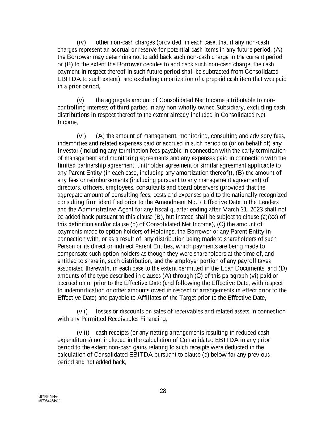28 #97964454v4 #97964454v11 (iv) other non-cash charges (provided, in each case, that if any non-cash charges represent an accrual or reserve for potential cash items in any future period, (A) the Borrower may determine not to add back such non-cash charge in the current period or (B) to the extent the Borrower decides to add back such non-cash charge, the cash payment in respect thereof in such future period shall be subtracted from Consolidated EBITDA to such extent), and excluding amortization of a prepaid cash item that was paid in a prior period, (v) the aggregate amount of Consolidated Net Income attributable to non- controlling interests of third parties in any non-wholly owned Subsidiary, excluding cash distributions in respect thereof to the extent already included in Consolidated Net Income, (vi) (A) the amount of management, monitoring, consulting and advisory fees, indemnities and related expenses paid or accrued in such period to (or on behalf of) any Investor (including any termination fees payable in connection with the early termination of management and monitoring agreements and any expenses paid in connection with the limited partnership agreement, unitholder agreement or similar agreement applicable to any Parent Entity (in each case, including any amortization thereof)), (B) the amount of any fees or reimbursements (including pursuant to any management agreement) of directors, officers, employees, consultants and board observers (provided that the aggregate amount of consulting fees, costs and expenses paid to the nationally recognized consulting firm identified prior to the Amendment No. 7 Effective Date to the Lenders and the Administrative Agent for any fiscal quarter ending after March 31, 2023 shall not be added back pursuant to this clause (B), but instead shall be subject to clause (a)(xx) of this definition and/or clause (b) of Consolidated Net Income), (C) the amount of payments made to option holders of Holdings, the Borrower or any Parent Entity in connection with, or as a result of, any distribution being made to shareholders of such Person or its direct or indirect Parent Entities, which payments are being made to compensate such option holders as though they were shareholders at the time of, and entitled to share in, such distribution, and the employer portion of any payroll taxes associated therewith, in each case to the extent permitted in the Loan Documents, and (D) amounts of the type described in clauses (A) through (C) of this paragraph (vi) paid or accrued on or prior to the Effective Date (and following the Effective Date, with respect to indemnification or other amounts owed in respect of arrangements in effect prior to the Effective Date) and payable to Affiliates of the Target prior to the Effective Date, (vii) losses or discounts on sales of receivables and related assets in connection with any Permitted Receivables Financing, (viii) cash receipts (or any netting arrangements resulting in reduced cash expenditures) not included in the calculation of Consolidated EBITDA in any prior period to the extent non-cash gains relating to such receipts were deducted in the calculation of Consolidated EBITDA pursuant to clause (c) below for any previous period and not added back,