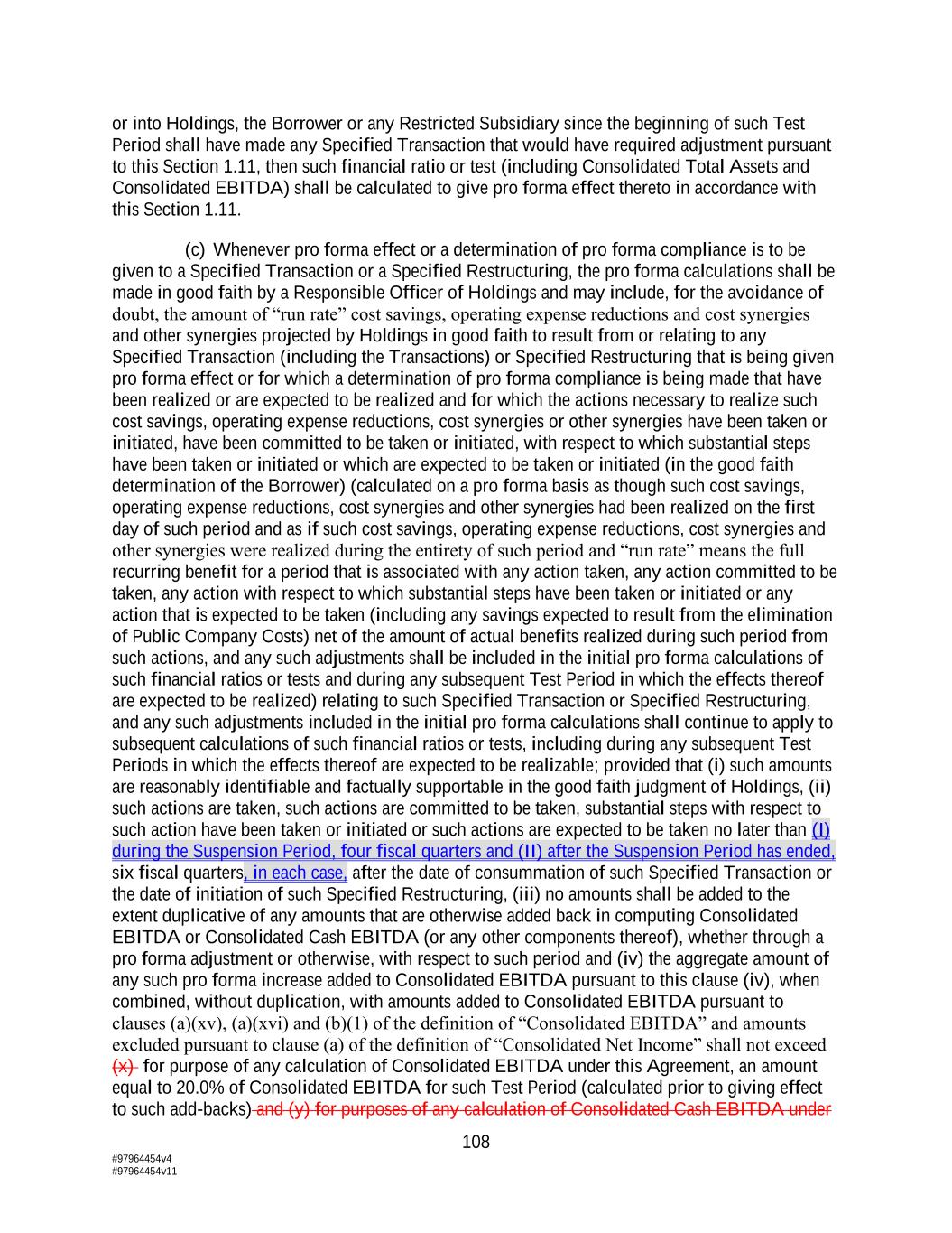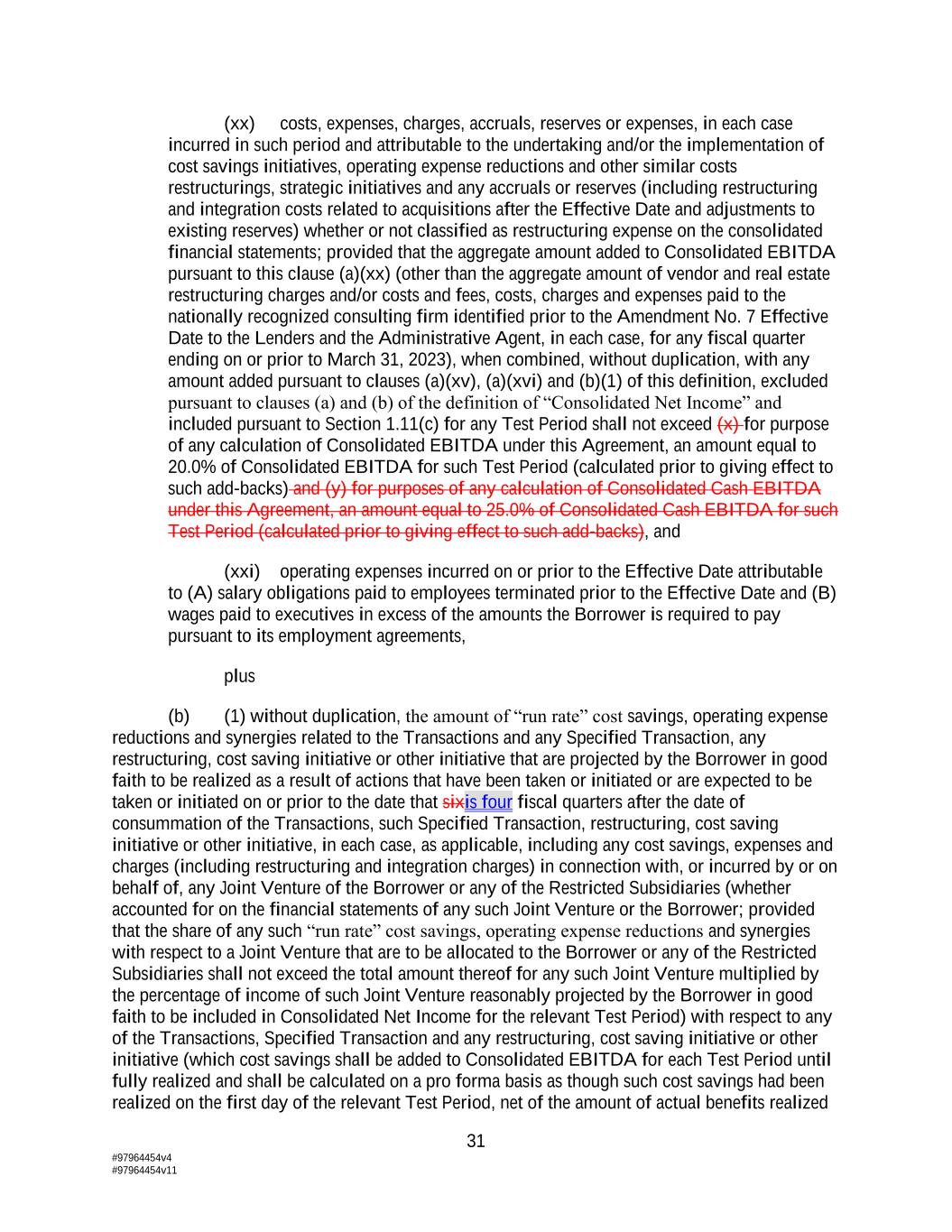 31 #97964454v4 #97964454v11 (xx) costs, expenses, charges, accruals, reserves or expenses, in each case incurred in such period and attributable to the undertaking and/or the implementation of cost savings initiatives, operating expense reductions and other similar costs restructurings, strategic initiatives and any accruals or reserves (including restructuring and integration costs related to acquisitions after the Effective Date and adjustments to existing reserves) whether or not classified as restructuring expense on the consolidated financial statements; provided that the aggregate amount added to Consolidated EBITDA pursuant to this clause (a)(xx) (other than the aggregate amount of vendor and real estate restructuring charges and/or costs and fees, costs, charges and expenses paid to the nationally recognized consulting firm identified prior to the Amendment No. 7 Effective Date to the Lenders and the Administrative Agent, in each case, for any fiscal quarter ending on or prior to March 31, 2023), when combined, without duplication, with any amount added pursuant to clauses (a)(xv), (a)(xvi) and (b)(1) of this definition, excluded pursuant to clauses (a) and (b) of the definition of “Consolidated Net Income” and included pursuant to Section 1.11(c) for any Test Period shall not exceed (x) for purpose of any calculation of Consolidated EBITDA under this Agreement, an amount equal to 20.0% of Consolidated EBITDA for such Test Period (calculated prior to giving effect to such add-backs) and (y) for purposes of any calculation of Consolidated Cash EBITDA under this Agreement, an amount equal to 25.0% of Consolidated Cash EBITDA for such Test Period (calculated prior to giving effect to such add-backs), and (xxi) operating expenses incurred on or prior to the Effective Date attributable to (A) salary obligations paid to employees terminated prior to the Effective Date and (B) wages paid to executives in excess of the amounts the Borrower is required to pay pursuant to its employment agreements, plus (b) (1) without duplication, the amount of “run rate” cost savings, operating expense reductions and synergies related to the Transactions and any Specified Transaction, any restructuring, cost saving initiative or other initiative that are projected by the Borrower in good faith to be realized as a result of actions that have been taken or initiated or are expected to be taken or initiated on or prior to the date that sixis four fiscal quarters after the date of consummation of the Transactions, such Specified Transaction, restructuring, cost saving initiative or other initiative, in each case, as applicable, including any cost savings, expenses and charges (including restructuring and integration charges) in connection with, or incurred by or on behalf of, any Joint Venture of the Borrower or any of the Restricted Subsidiaries (whether accounted for on the financial statements of any such Joint Venture or the Borrower; provided that the share of any such “run rate” cost savings, operating expense reductions and synergies with respect to a Joint Venture that are to be allocated to the Borrower or any of the Restricted Subsidiaries shall not exceed the total amount thereof for any such Joint Venture multiplied by the percentage of income of such Joint Venture reasonably projected by the Borrower in good faith to be included in Consolidated Net Income for the relevant Test Period) with respect to any of the Transactions, Specified Transaction and any restructuring, cost saving initiative or other initiative (which cost savings shall be added to Consolidated EBITDA for each Test Period until fully realized and shall be calculated on a pro forma basis as though such cost savings had been realized on the first day of the relevant Test Period, net of the amount of actual benefits realized