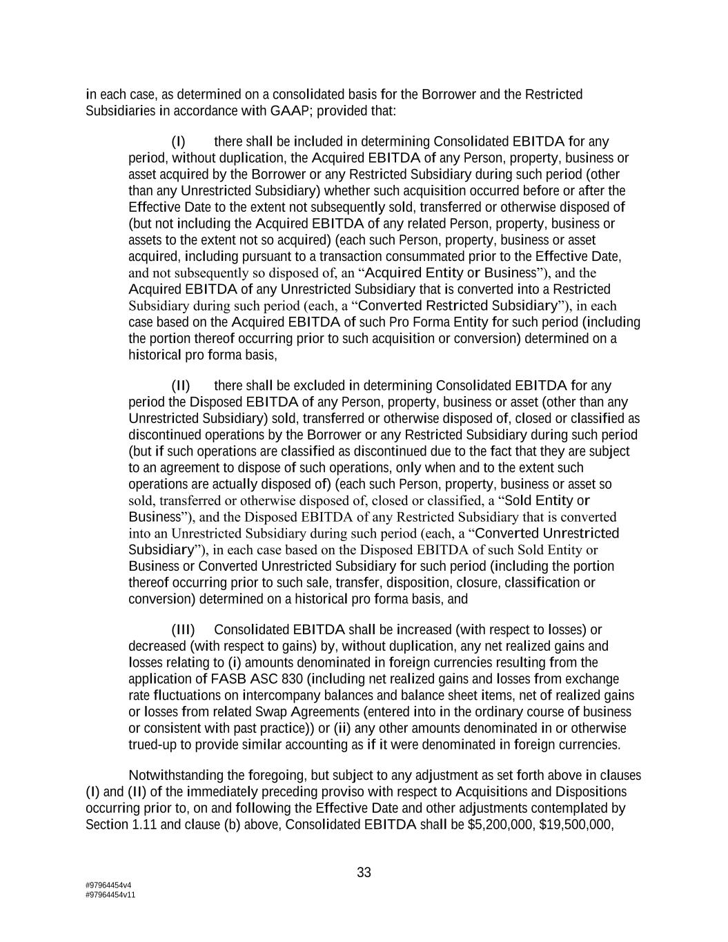 33 #97964454v4 #97964454v11 in each case, as determined on a consolidated basis for the Borrower and the Restricted Subsidiaries in accordance with GAAP; provided that: (I) there shall be included in determining Consolidated EBITDA for any period, without duplication, the Acquired EBITDA of any Person, property, business or asset acquired by the Borrower or any Restricted Subsidiary during such period (other than any Unrestricted Subsidiary) whether such acquisition occurred before or after the Effective Date to the extent not subsequently sold, transferred or otherwise disposed of (but not including the Acquired EBITDA of any related Person, property, business or assets to the extent not so acquired) (each such Person, property, business or asset acquired, including pursuant to a transaction consummated prior to the Effective Date, and not subsequently so disposed of, an “Acquired Entity or Business”), and the Acquired EBITDA of any Unrestricted Subsidiary that is converted into a Restricted Subsidiary during such period (each, a “Converted Restricted Subsidiary”), in each case based on the Acquired EBITDA of such Pro Forma Entity for such period (including the portion thereof occurring prior to such acquisition or conversion) determined on a historical pro forma basis, (II) there shall be excluded in determining Consolidated EBITDA for any period the Disposed EBITDA of any Person, property, business or asset (other than any Unrestricted Subsidiary) sold, transferred or otherwise disposed of, closed or classified as discontinued operations by the Borrower or any Restricted Subsidiary during such period (but if such operations are classified as discontinued due to the fact that they are subject to an agreement to dispose of such operations, only when and to the extent such operations are actually disposed of) (each such Person, property, business or asset so sold, transferred or otherwise disposed of, closed or classified, a “Sold Entity or Business”), and the Disposed EBITDA of any Restricted Subsidiary that is converted into an Unrestricted Subsidiary during such period (each, a “Converted Unrestricted Subsidiary”), in each case based on the Disposed EBITDA of such Sold Entity or Business or Converted Unrestricted Subsidiary for such period (including the portion thereof occurring prior to such sale, transfer, disposition, closure, classification or conversion) determined on a historical pro forma basis, and (III) Consolidated EBITDA shall be increased (with respect to losses) or decreased (with respect to gains) by, without duplication, any net realized gains and losses relating to (i) amounts denominated in foreign currencies resulting from the application of FASB ASC 830 (including net realized gains and losses from exchange rate fluctuations on intercompany balances and balance sheet items, net of realized gains or losses from related Swap Agreements (entered into in the ordinary course of business or consistent with past practice)) or (ii) any other amounts denominated in or otherwise trued-up to provide similar accounting as if it were denominated in foreign currencies. Notwithstanding the foregoing, but subject to any adjustment as set forth above in clauses (I) and (II) of the immediately preceding proviso with respect to Acquisitions and Dispositions occurring prior to, on and following the Effective Date and other adjustments contemplated by Section 1.11 and clause (b) above, Consolidated EBITDA shall be $5,200,000, $19,500,000,