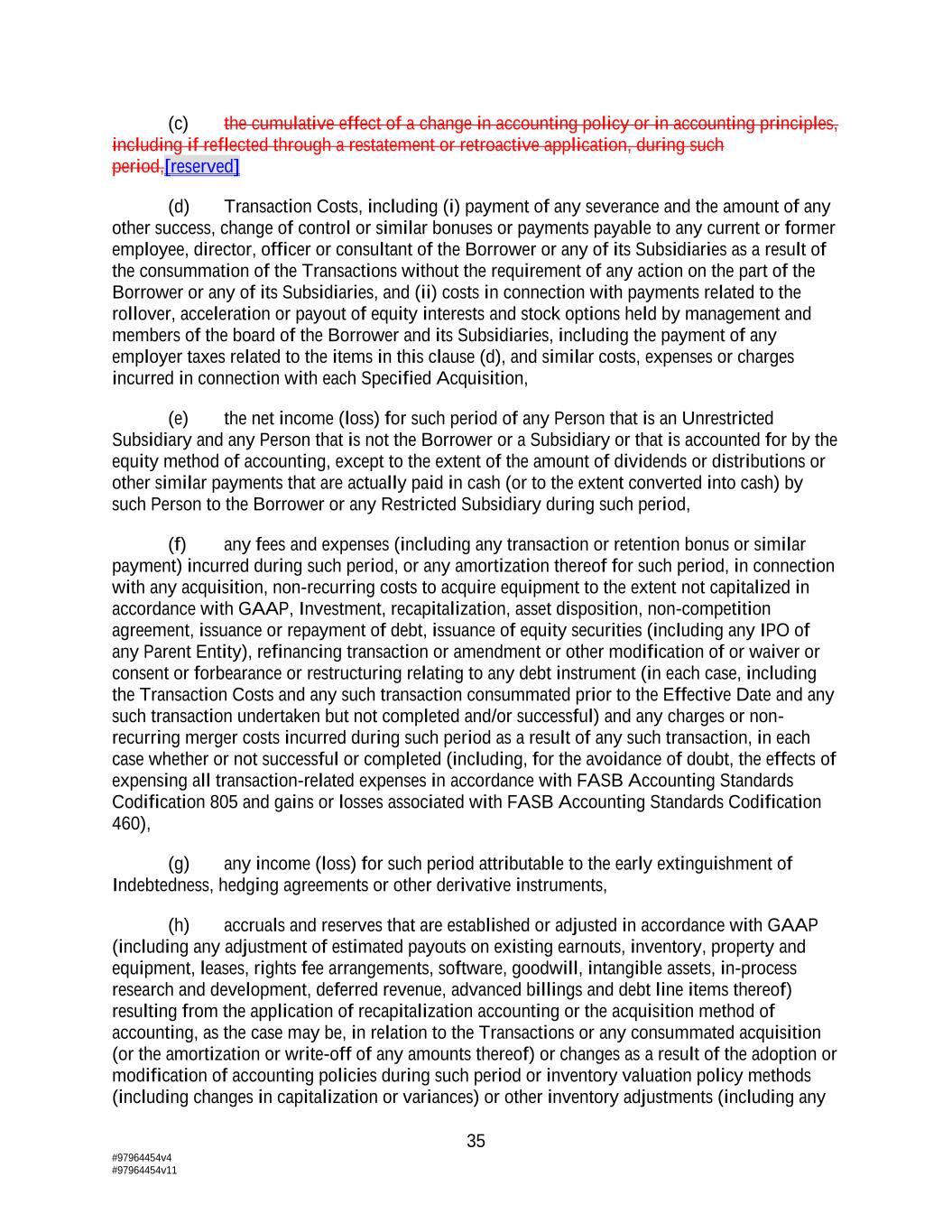 35 #97964454v4 #97964454v11 (c) the cumulative effect of a change in accounting policy or in accounting principles, including if reflected through a restatement or retroactive application, during such period,[reserved] (d) Transaction Costs, including (i) payment of any severance and the amount of any other success, change of control or similar bonuses or payments payable to any current or former employee, director, officer or consultant of the Borrower or any of its Subsidiaries as a result of the consummation of the Transactions without the requirement of any action on the part of the Borrower or any of its Subsidiaries, and (ii) costs in connection with payments related to the rollover, acceleration or payout of equity interests and stock options held by management and members of the board of the Borrower and its Subsidiaries, including the payment of any employer taxes related to the items in this clause (d), and similar costs, expenses or charges incurred in connection with each Specified Acquisition, (e) the net income (loss) for such period of any Person that is an Unrestricted Subsidiary and any Person that is not the Borrower or a Subsidiary or that is accounted for by the equity method of accounting, except to the extent of the amount of dividends or distributions or other similar payments that are actually paid in cash (or to the extent converted into cash) by such Person to the Borrower or any Restricted Subsidiary during such period, (f) any fees and expenses (including any transaction or retention bonus or similar payment) incurred during such period, or any amortization thereof for such period, in connection with any acquisition, non-recurring costs to acquire equipment to the extent not capitalized in accordance with GAAP, Investment, recapitalization, asset disposition, non-competition agreement, issuance or repayment of debt, issuance of equity securities (including any IPO of any Parent Entity), refinancing transaction or amendment or other modification of or waiver or consent or forbearance or restructuring relating to any debt instrument (in each case, including the Transaction Costs and any such transaction consummated prior to the Effective Date and any such transaction undertaken but not completed and/or successful) and any charges or non- recurring merger costs incurred during such period as a result of any such transaction, in each case whether or not successful or completed (including, for the avoidance of doubt, the effects of expensing all transaction-related expenses in accordance with FASB Accounting Standards Codification 805 and gains or losses associated with FASB Accounting Standards Codification 460), (g) any income (loss) for such period attributable to the early extinguishment of Indebtedness, hedging agreements or other derivative instruments, (h) accruals and reserves that are established or adjusted in accordance with GAAP (including any adjustment of estimated payouts on existing earnouts, inventory, property and equipment, leases, rights fee arrangements, software, goodwill, intangible assets, in-process research and development, deferred revenue, advanced billings and debt line items thereof) resulting from the application of recapitalization accounting or the acquisition method of accounting, as the case may be, in relation to the Transactions or any consummated acquisition (or the amortization or write-off of any amounts thereof) or changes as a result of the adoption or modification of accounting policies during such period or inventory valuation policy methods (including changes in capitalization or variances) or other inventory adjustments (including any