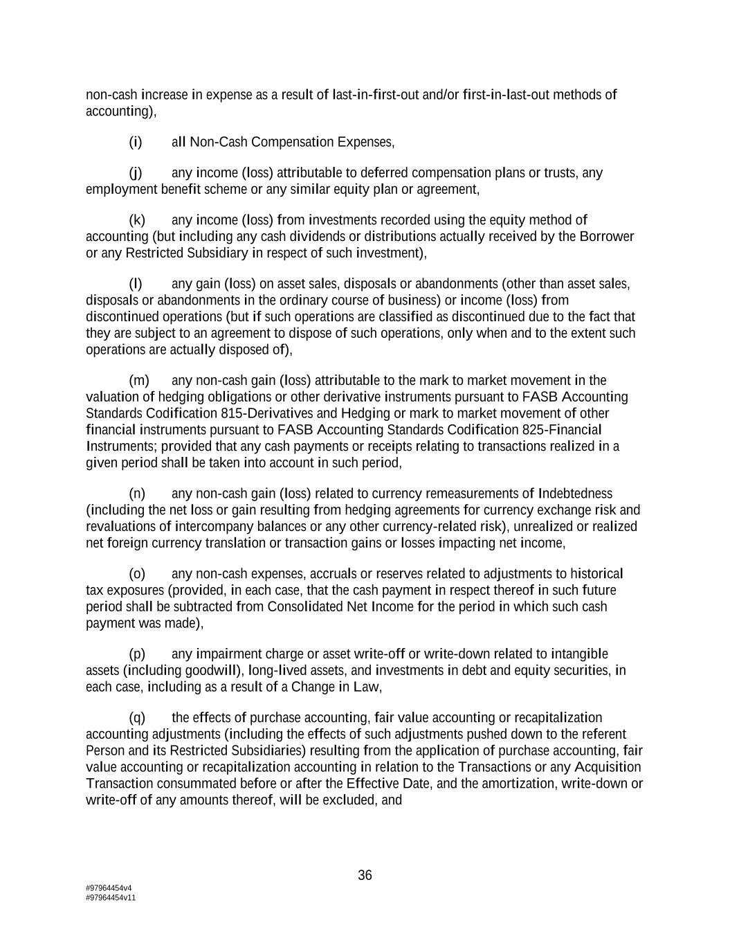 36 #97964454v4 #97964454v11 non-cash increase in expense as a result of last-in-first-out and/or first-in-last-out methods of accounting), (i) all Non-Cash Compensation Expenses, (j) any income (loss) attributable to deferred compensation plans or trusts, any employment benefit scheme or any similar equity plan or agreement, (k) any income (loss) from investments recorded using the equity method of accounting (but including any cash dividends or distributions actually received by the Borrower or any Restricted Subsidiary in respect of such investment), (l) any gain (loss) on asset sales, disposals or abandonments (other than asset sales, disposals or abandonments in the ordinary course of business) or income (loss) from discontinued operations (but if such operations are classified as discontinued due to the fact that they are subject to an agreement to dispose of such operations, only when and to the extent such operations are actually disposed of), (m) any non-cash gain (loss) attributable to the mark to market movement in the valuation of hedging obligations or other derivative instruments pursuant to FASB Accounting Standards Codification 815-Derivatives and Hedging or mark to market movement of other financial instruments pursuant to FASB Accounting Standards Codification 825-Financial Instruments; provided that any cash payments or receipts relating to transactions realized in a given period shall be taken into account in such period, (n) any non-cash gain (loss) related to currency remeasurements of Indebtedness (including the net loss or gain resulting from hedging agreements for currency exchange risk and revaluations of intercompany balances or any other currency-related risk), unrealized or realized net foreign currency translation or transaction gains or losses impacting net income, (o) any non-cash expenses, accruals or reserves related to adjustments to historical tax exposures (provided, in each case, that the cash payment in respect thereof in such future period shall be subtracted from Consolidated Net Income for the period in which such cash payment was made), (p) any impairment charge or asset write-off or write-down related to intangible assets (including goodwill), long-lived assets, and investments in debt and equity securities, in each case, including as a result of a Change in Law, (q) the effects of purchase accounting, fair value accounting or recapitalization accounting adjustments (including the effects of such adjustments pushed down to the referent Person and its Restricted Subsidiaries) resulting from the application of purchase accounting, fair value accounting or recapitalization accounting in relation to the Transactions or any Acquisition Transaction consummated before or after the Effective Date, and the amortization, write-down or write-off of any amounts thereof, will be excluded, and