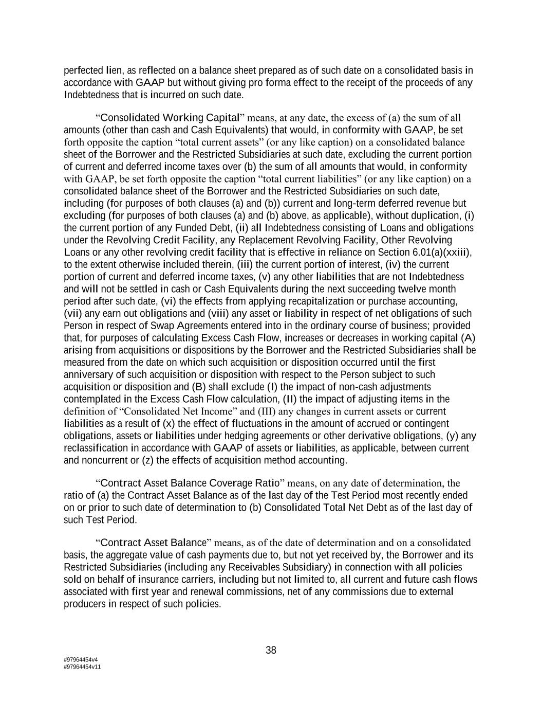 38 #97964454v4 #97964454v11 perfected lien, as reflected on a balance sheet prepared as of such date on a consolidated basis in accordance with GAAP but without giving pro forma effect to the receipt of the proceeds of any Indebtedness that is incurred on such date. “Consolidated Working Capital” means, at any date, the excess of (a) the sum of all amounts (other than cash and Cash Equivalents) that would, in conformity with GAAP, be set forth opposite the caption “total current assets” (or any like caption) on a consolidated balance sheet of the Borrower and the Restricted Subsidiaries at such date, excluding the current portion of current and deferred income taxes over (b) the sum of all amounts that would, in conformity with GAAP, be set forth opposite the caption “total current liabilities” (or any like caption) on a consolidated balance sheet of the Borrower and the Restricted Subsidiaries on such date, including (for purposes of both clauses (a) and (b)) current and long-term deferred revenue but excluding (for purposes of both clauses (a) and (b) above, as applicable), without duplication, (i) the current portion of any Funded Debt, (ii) all Indebtedness consisting of Loans and obligations under the Revolving Credit Facility, any Replacement Revolving Facility, Other Revolving Loans or any other revolving credit facility that is effective in reliance on Section 6.01(a)(xxiii), to the extent otherwise included therein, (iii) the current portion of interest, (iv) the current portion of current and deferred income taxes, (v) any other liabilities that are not Indebtedness and will not be settled in cash or Cash Equivalents during the next succeeding twelve month period after such date, (vi) the effects from applying recapitalization or purchase accounting, (vii) any earn out obligations and (viii) any asset or liability in respect of net obligations of such Person in respect of Swap Agreements entered into in the ordinary course of business; provided that, for purposes of calculating Excess Cash Flow, increases or decreases in working capital (A) arising from acquisitions or dispositions by the Borrower and the Restricted Subsidiaries shall be measured from the date on which such acquisition or disposition occurred until the first anniversary of such acquisition or disposition with respect to the Person subject to such acquisition or disposition and (B) shall exclude (I) the impact of non-cash adjustments contemplated in the Excess Cash Flow calculation, (II) the impact of adjusting items in the definition of “Consolidated Net Income” and (III) any changes in current assets or current liabilities as a result of (x) the effect of fluctuations in the amount of accrued or contingent obligations, assets or liabilities under hedging agreements or other derivative obligations, (y) any reclassification in accordance with GAAP of assets or liabilities, as applicable, between current and noncurrent or (z) the effects of acquisition method accounting. “Contract Asset Balance Coverage Ratio” means, on any date of determination, the ratio of (a) the Contract Asset Balance as of the last day of the Test Period most recently ended on or prior to such date of determination to (b) Consolidated Total Net Debt as of the last day of such Test Period. “Contract Asset Balance” means, as of the date of determination and on a consolidated basis, the aggregate value of cash payments due to, but not yet received by, the Borrower and its Restricted Subsidiaries (including any Receivables Subsidiary) in connection with all policies sold on behalf of insurance carriers, including but not limited to, all current and future cash flows associated with first year and renewal commissions, net of any commissions due to external producers in respect of such policies.