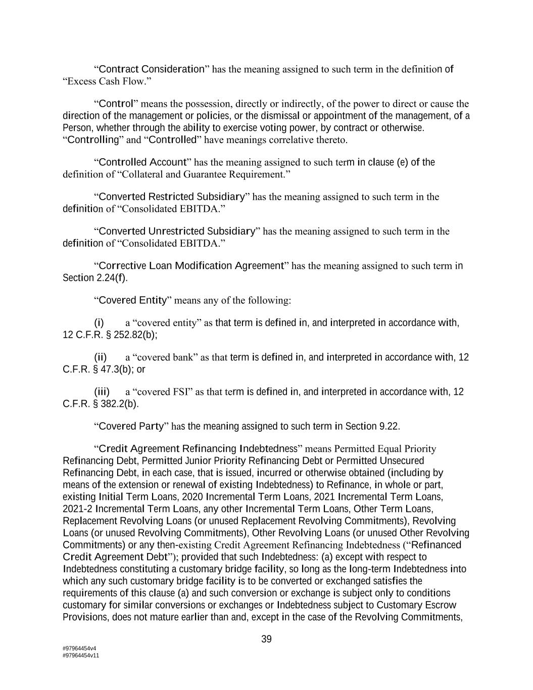 39 #97964454v4 #97964454v11 “Contract Consideration” has the meaning assigned to such term in the definition of “Excess Cash Flow.” “Control” means the possession, directly or indirectly, of the power to direct or cause the direction of the management or policies, or the dismissal or appointment of the management, of a Person, whether through the ability to exercise voting power, by contract or otherwise. “Controlling” and “Controlled” have meanings correlative thereto. “Controlled Account” has the meaning assigned to such term in clause (e) of the definition of “Collateral and Guarantee Requirement.” “Converted Restricted Subsidiary” has the meaning assigned to such term in the definition of “Consolidated EBITDA.” “Converted Unrestricted Subsidiary” has the meaning assigned to such term in the definition of “Consolidated EBITDA.” “Corrective Loan Modification Agreement” has the meaning assigned to such term in Section 2.24(f). “Covered Entity” means any of the following: (i) a “covered entity” as that term is defined in, and interpreted in accordance with, 12 C.F.R. § 252.82(b); (ii) a “covered bank” as that term is defined in, and interpreted in accordance with, 12 C.F.R. § 47.3(b); or (iii) a “covered FSI” as that term is defined in, and interpreted in accordance with, 12 C.F.R. § 382.2(b). “Covered Party” has the meaning assigned to such term in Section 9.22. “Credit Agreement Refinancing Indebtedness” means Permitted Equal Priority Refinancing Debt, Permitted Junior Priority Refinancing Debt or Permitted Unsecured Refinancing Debt, in each case, that is issued, incurred or otherwise obtained (including by means of the extension or renewal of existing Indebtedness) to Refinance, in whole or part, existing Initial Term Loans, 2020 Incremental Term Loans, 2021 Incremental Term Loans, 2021-2 Incremental Term Loans, any other Incremental Term Loans, Other Term Loans, Replacement Revolving Loans (or unused Replacement Revolving Commitments), Revolving Loans (or unused Revolving Commitments), Other Revolving Loans (or unused Other Revolving Commitments) or any then-existing Credit Agreement Refinancing Indebtedness (“Refinanced Credit Agreement Debt”); provided that such Indebtedness: (a) except with respect to Indebtedness constituting a customary bridge facility, so long as the long-term Indebtedness into which any such customary bridge facility is to be converted or exchanged satisfies the requirements of this clause (a) and such conversion or exchange is subject only to conditions customary for similar conversions or exchanges or Indebtedness subject to Customary Escrow Provisions, does not mature earlier than and, except in the case of the Revolving Commitments,