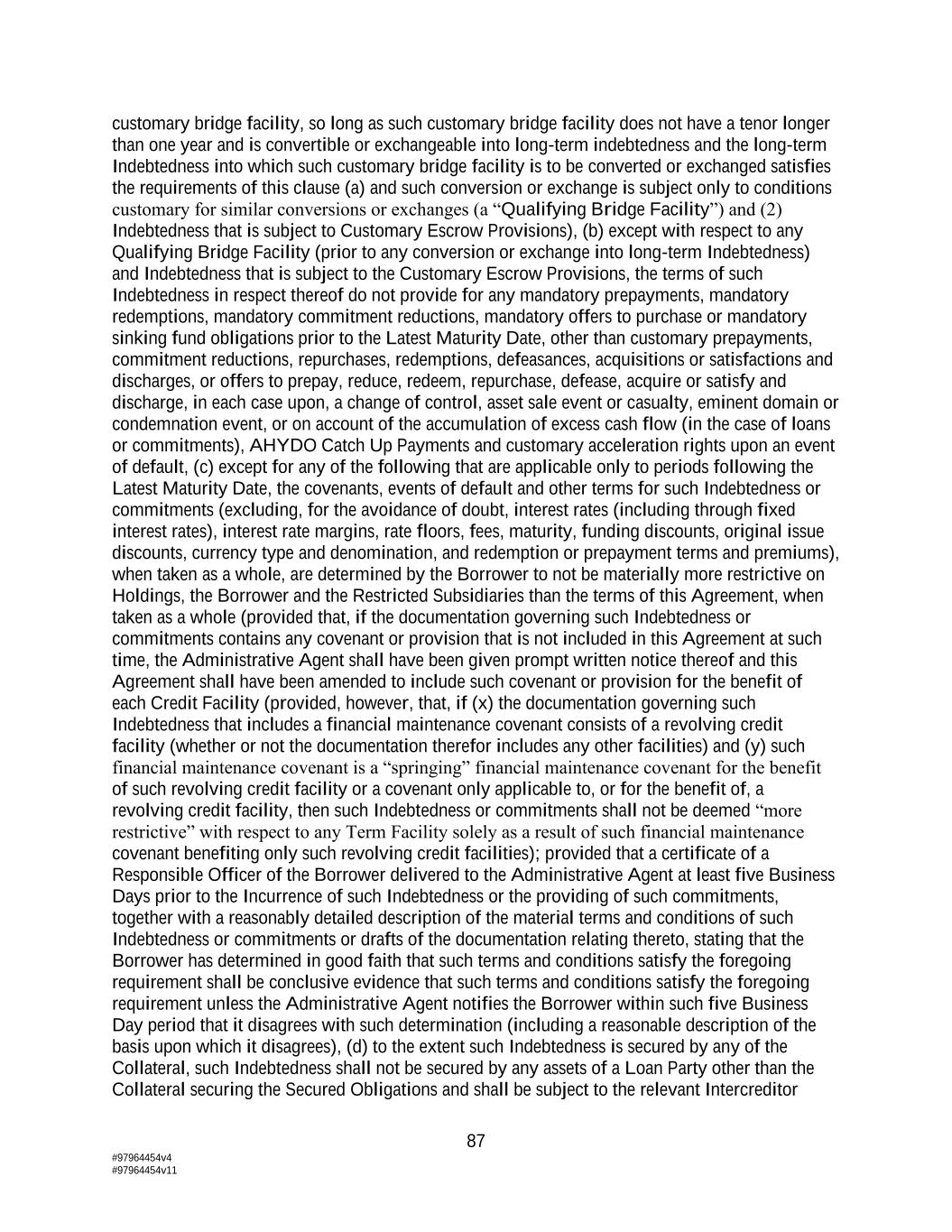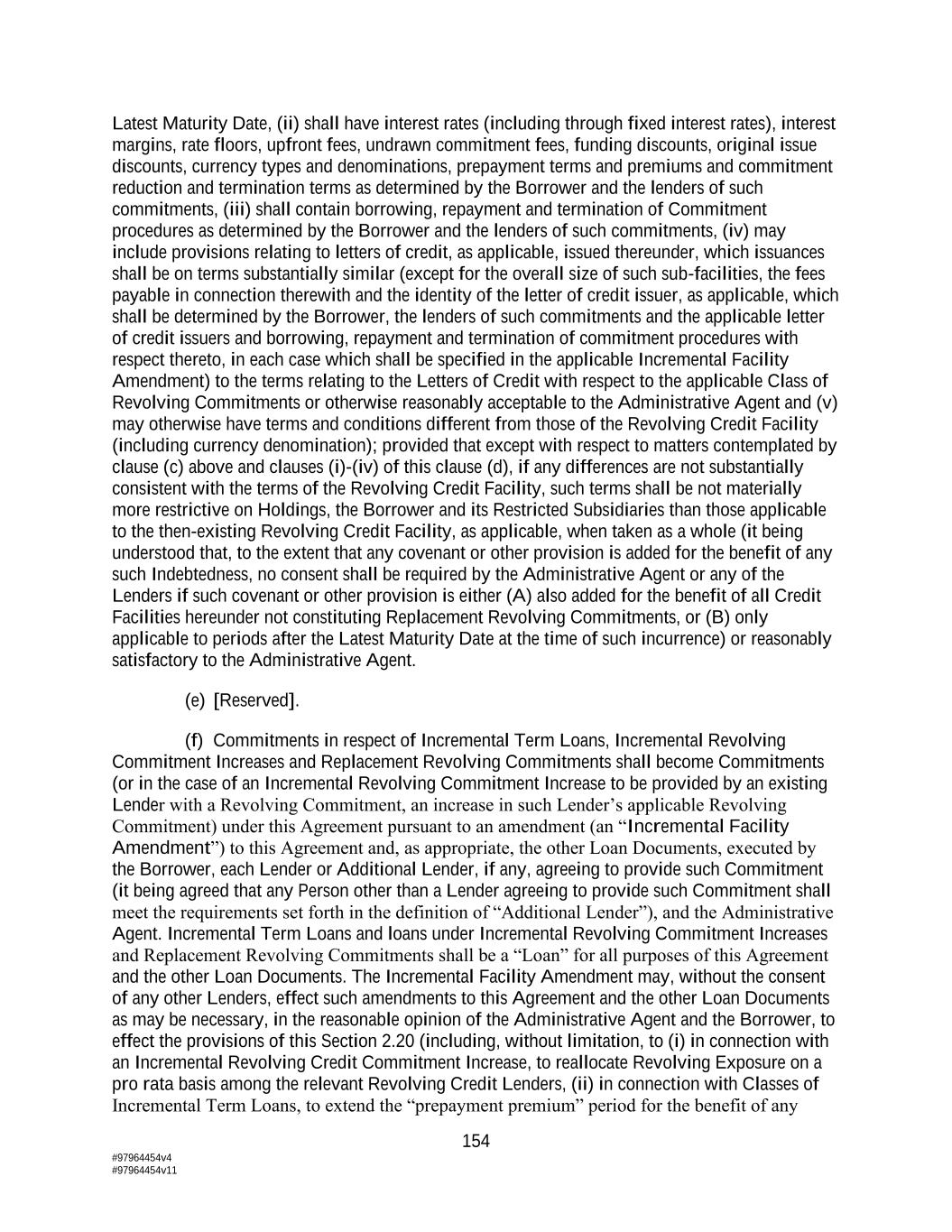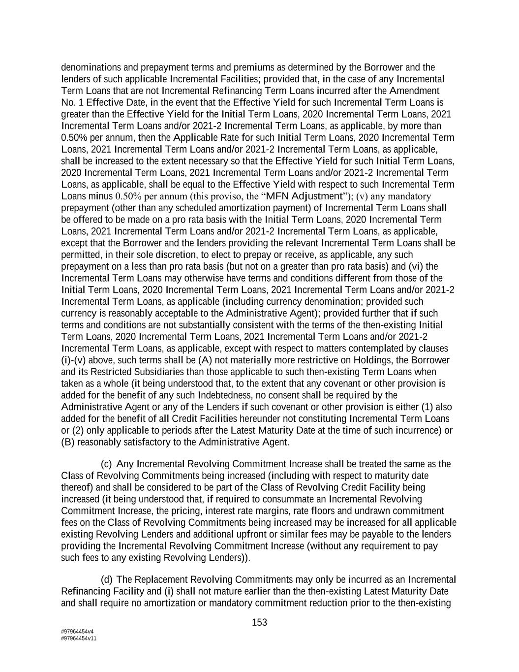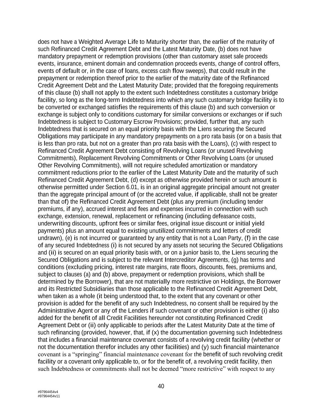 40 #97964454v4 #97964454v11 does not have a Weighted Average Life to Maturity shorter than, the earlier of the maturity of such Refinanced Credit Agreement Debt and the Latest Maturity Date, (b) does not have mandatory prepayment or redemption provisions (other than customary asset sale proceeds events, insurance, eminent domain and condemnation proceeds events, change of control offers, events of default or, in the case of loans, excess cash flow sweeps), that could result in the prepayment or redemption thereof prior to the earlier of the maturity date of the Refinanced Credit Agreement Debt and the Latest Maturity Date; provided that the foregoing requirements of this clause (b) shall not apply to the extent such Indebtedness constitutes a customary bridge facility, so long as the long-term Indebtedness into which any such customary bridge facility is to be converted or exchanged satisfies the requirements of this clause (b) and such conversion or exchange is subject only to conditions customary for similar conversions or exchanges or if such Indebtedness is subject to Customary Escrow Provisions; provided, further that, any such Indebtedness that is secured on an equal priority basis with the Liens securing the Secured Obligations may participate in any mandatory prepayments on a pro rata basis (or on a basis that is less than pro rata, but not on a greater than pro rata basis with the Loans), (c) with respect to Refinanced Credit Agreement Debt consisting of Revolving Loans (or unused Revolving Commitments), Replacement Revolving Commitments or Other Revolving Loans (or unused Other Revolving Commitments), will not require scheduled amortization or mandatory commitment reductions prior to the earlier of the Latest Maturity Date and the maturity of such Refinanced Credit Agreement Debt, (d) except as otherwise provided herein or such amount is otherwise permitted under Section 6.01, is in an original aggregate principal amount not greater than the aggregate principal amount of (or the accreted value, if applicable, shall not be greater than that of) the Refinanced Credit Agreement Debt (plus any premium (including tender premiums, if any), accrued interest and fees and expenses incurred in connection with such exchange, extension, renewal, replacement or refinancing (including defeasance costs, underwriting discounts, upfront fees or similar fees, original issue discount or initial yield payments) plus an amount equal to existing unutilized commitments and letters of credit undrawn), (e) is not incurred or guaranteed by any entity that is not a Loan Party, (f) in the case of any secured Indebtedness (i) is not secured by any assets not securing the Secured Obligations and (ii) is secured on an equal priority basis with, or on a junior basis to, the Liens securing the Secured Obligations and is subject to the relevant Intercreditor Agreements, (g) has terms and conditions (excluding pricing, interest rate margins, rate floors, discounts, fees, premiums and, subject to clauses (a) and (b) above, prepayment or redemption provisions, which shall be determined by the Borrower), that are not materially more restrictive on Holdings, the Borrower and its Restricted Subsidiaries than those applicable to the Refinanced Credit Agreement Debt, when taken as a whole (it being understood that, to the extent that any covenant or other provision is added for the benefit of any such Indebtedness, no consent shall be required by the Administrative Agent or any of the Lenders if such covenant or other provision is either (i) also added for the benefit of all Credit Facilities hereunder not constituting Refinanced Credit Agreement Debt or (ii) only applicable to periods after the Latest Maturity Date at the time of such refinancing (provided, however, that, if (x) the documentation governing such Indebtedness that includes a financial maintenance covenant consists of a revolving credit facility (whether or not the documentation therefor includes any other facilities) and (y) such financial maintenance covenant is a “springing” financial maintenance covenant for the benefit of such revolving credit facility or a covenant only applicable to, or for the benefit of, a revolving credit facility, then such Indebtedness or commitments shall not be deemed “more restrictive” with respect to any
